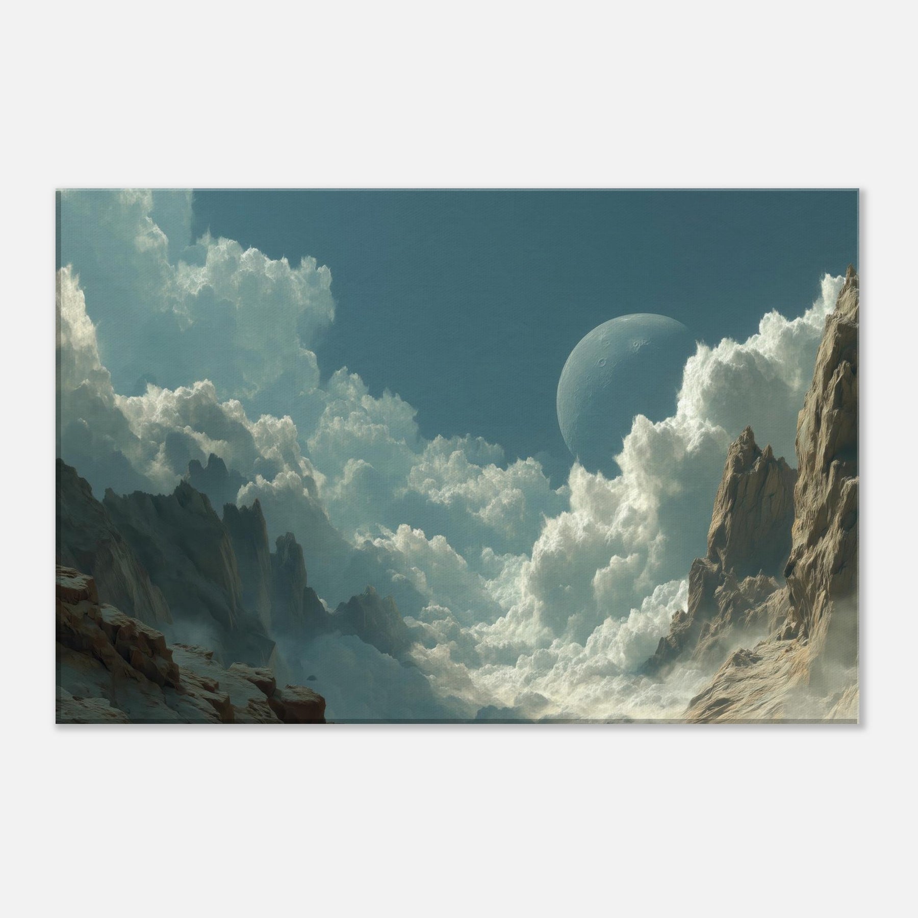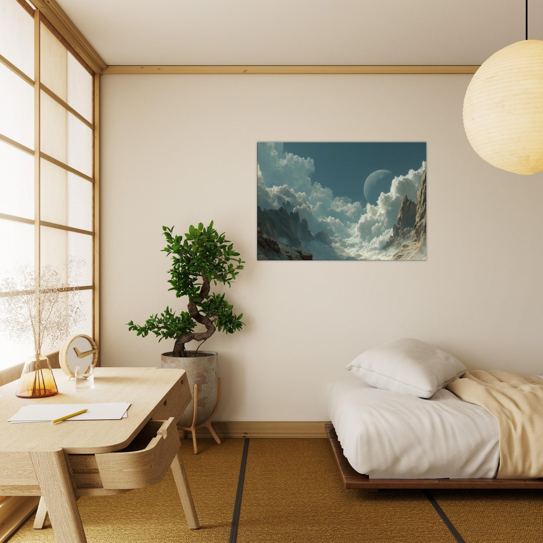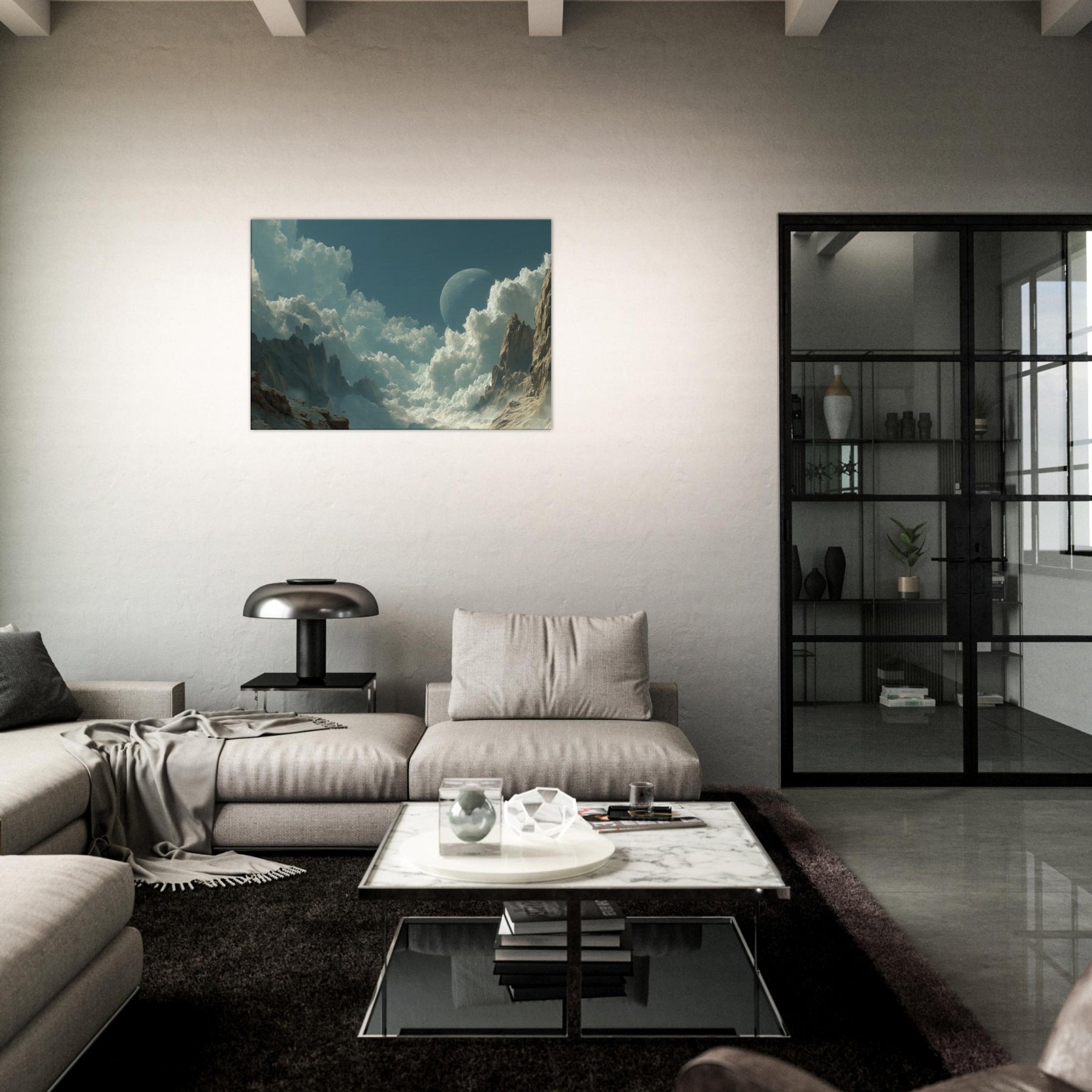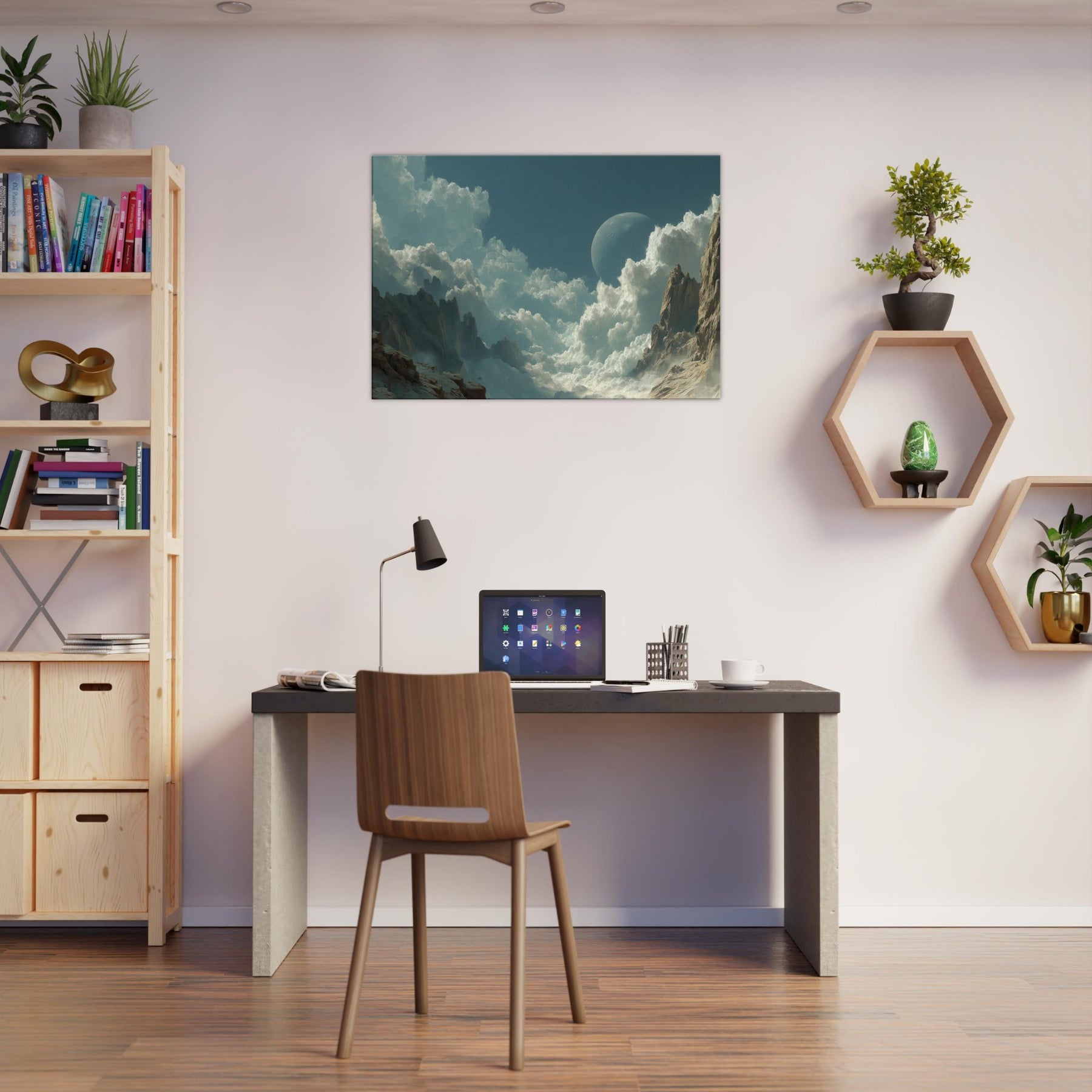 An otherworldly vista unfolds where the primary subject Thunderstorm breathes within a canyon of rock and cloud. Surreal light threads braid the air as distant thunder sculpts the room with a cool, electric hush. Blues melt into sculpted whites and earthly browns, inviting a contemplative calm that softens bold interiors. This piece transforms a living space into a gallery of atmosphere, offering drama without shouting, and turning walls into a portal to vast, unruly beauty that silences the daily rhythm.