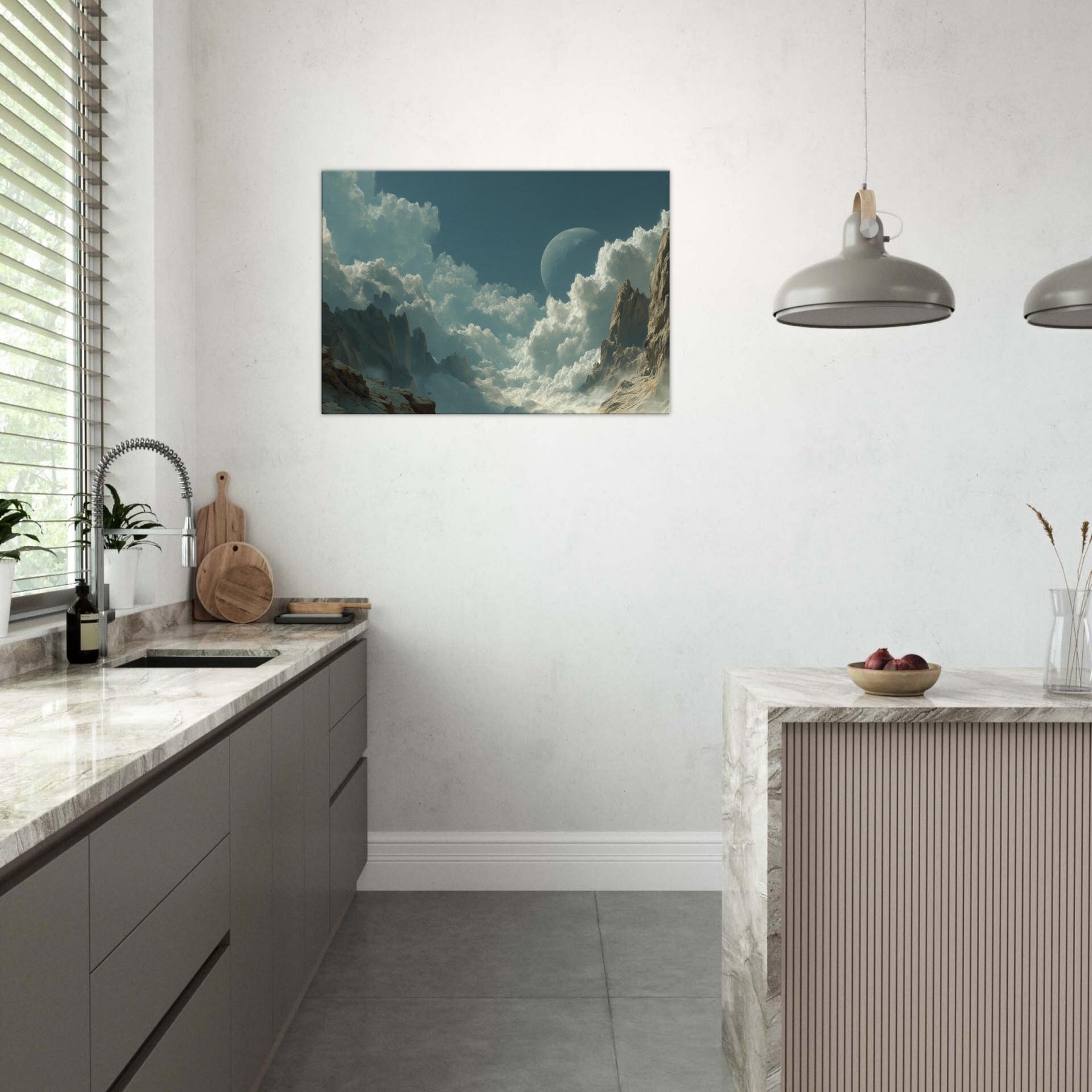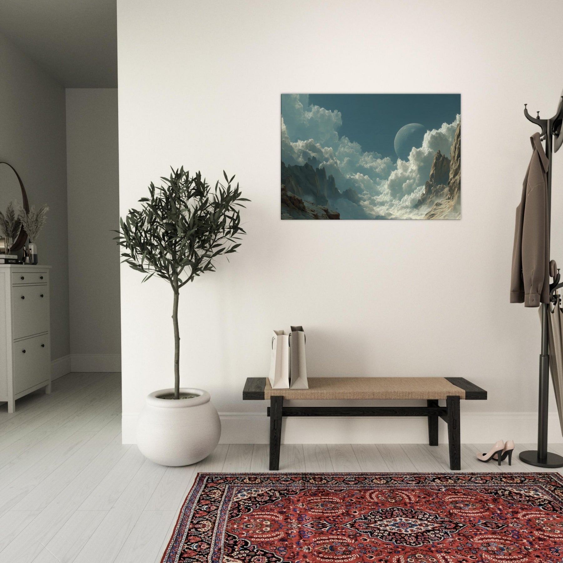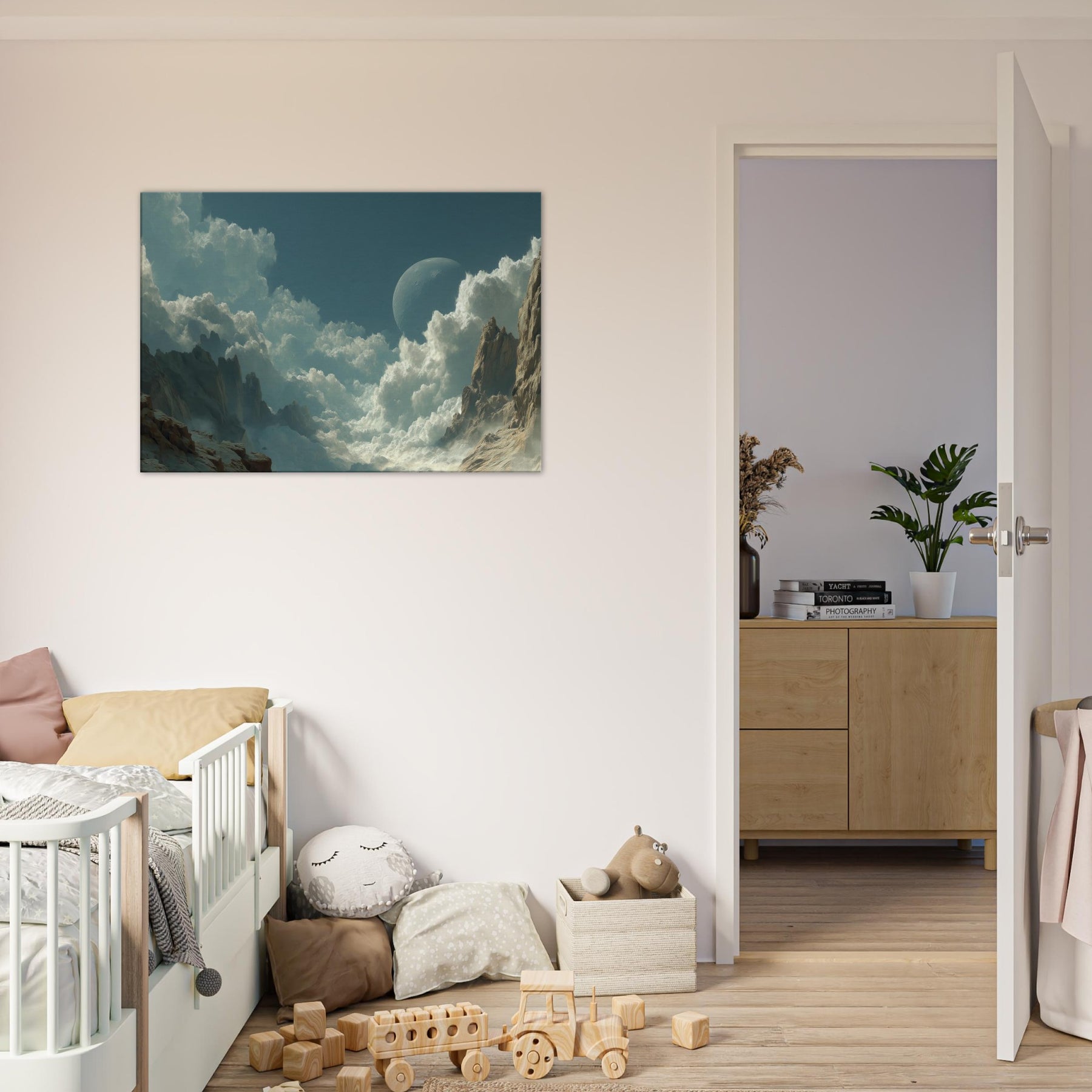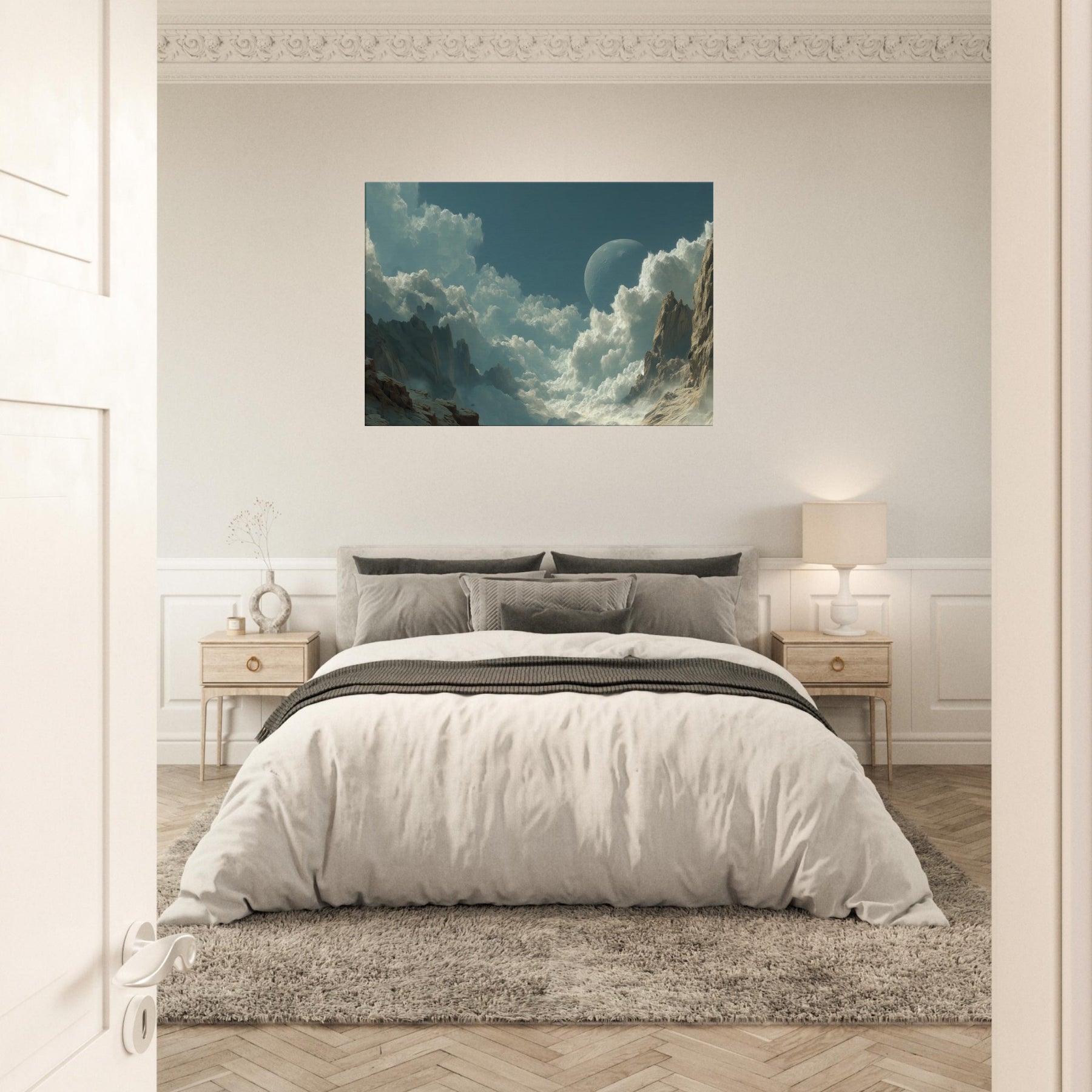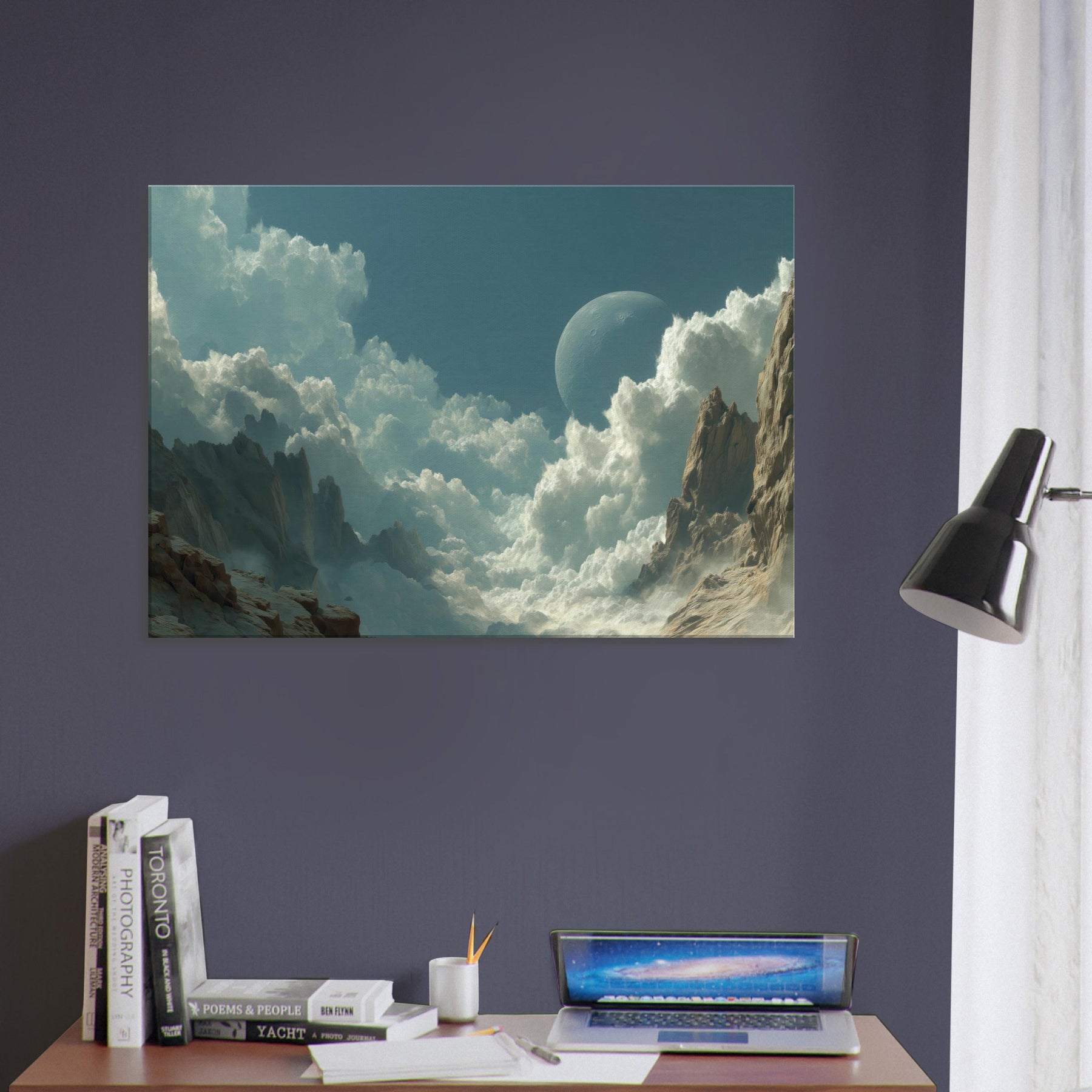An otherworldly vista unfolds where the primary subject Thunderstorm breathes within a canyon of rock and cloud. Surreal light threads braid the air as distant thunder sculpts the room with a cool, electric hush. Blues melt into sculpted whites and earthly browns, inviting a contemplative calm that softens bold interiors. This piece transforms a living space into a gallery of atmosphere, offering drama without shouting, and turning walls into a portal to vast, unruly beauty that silences the daily rhythm.
