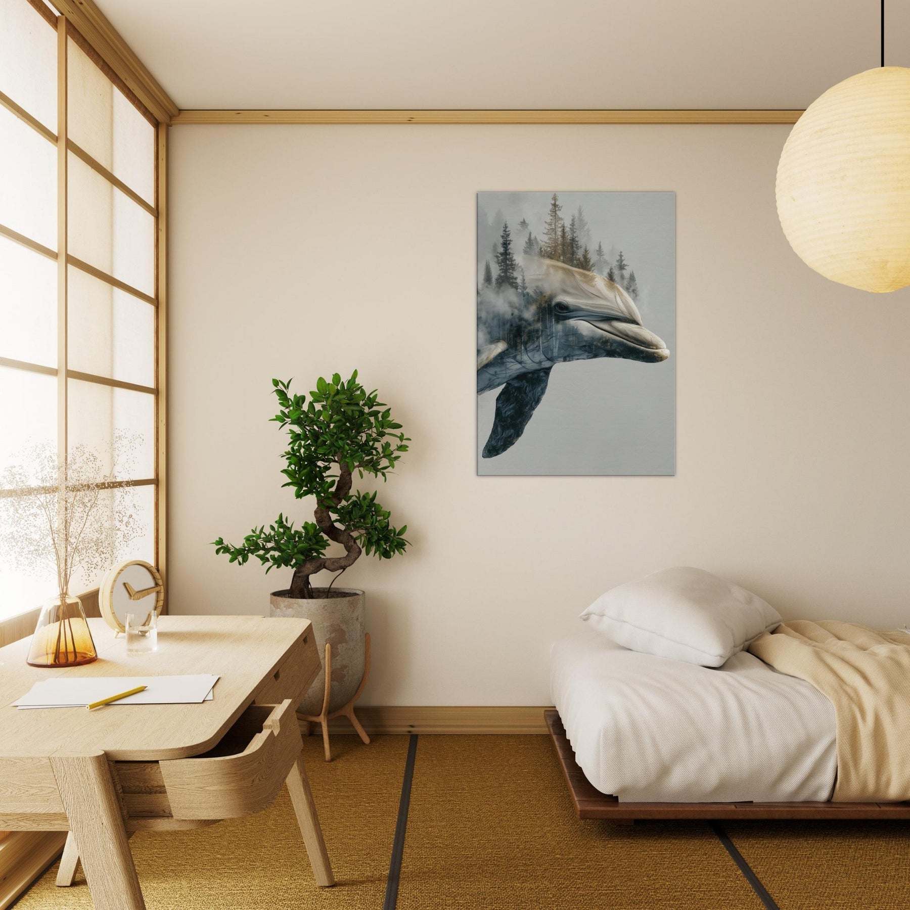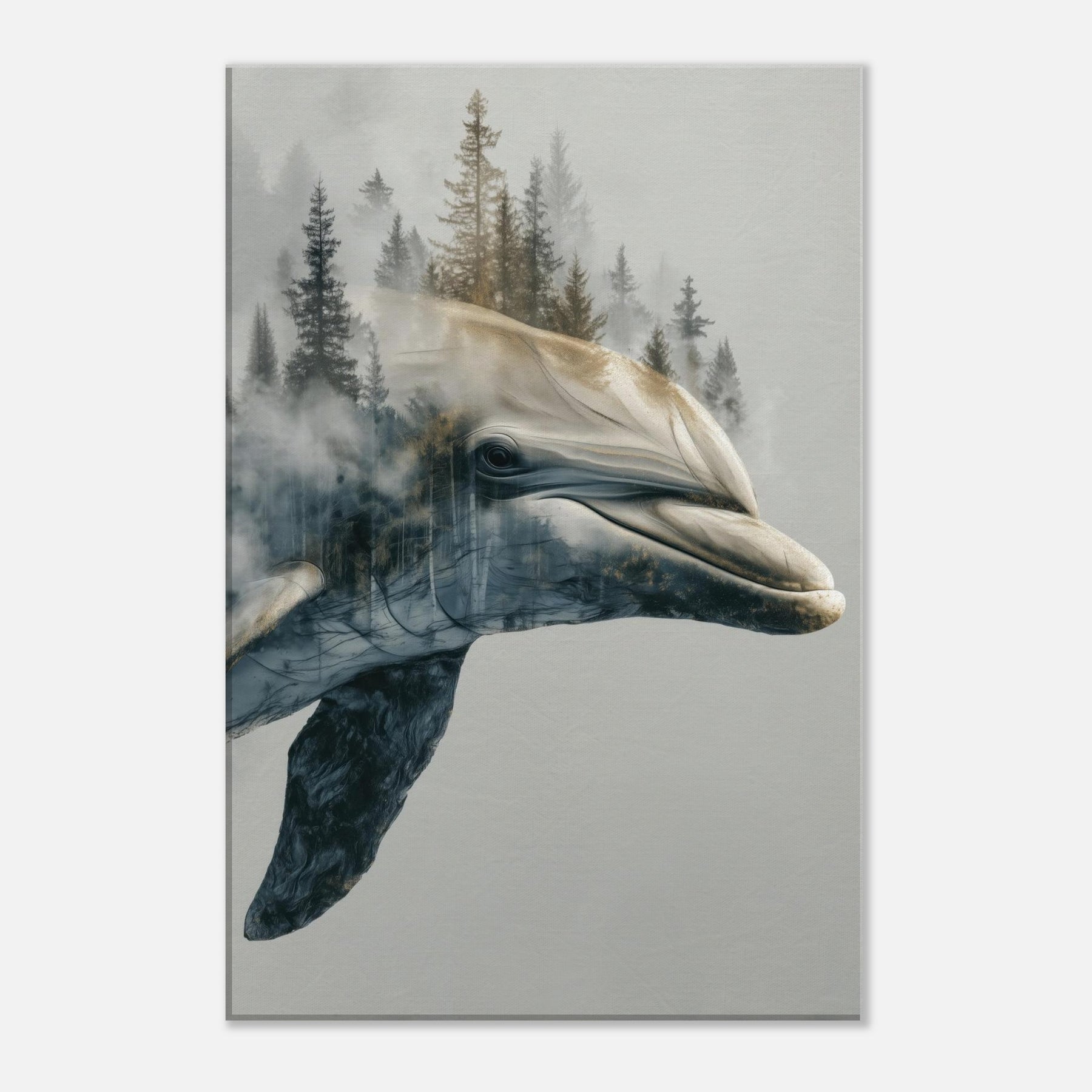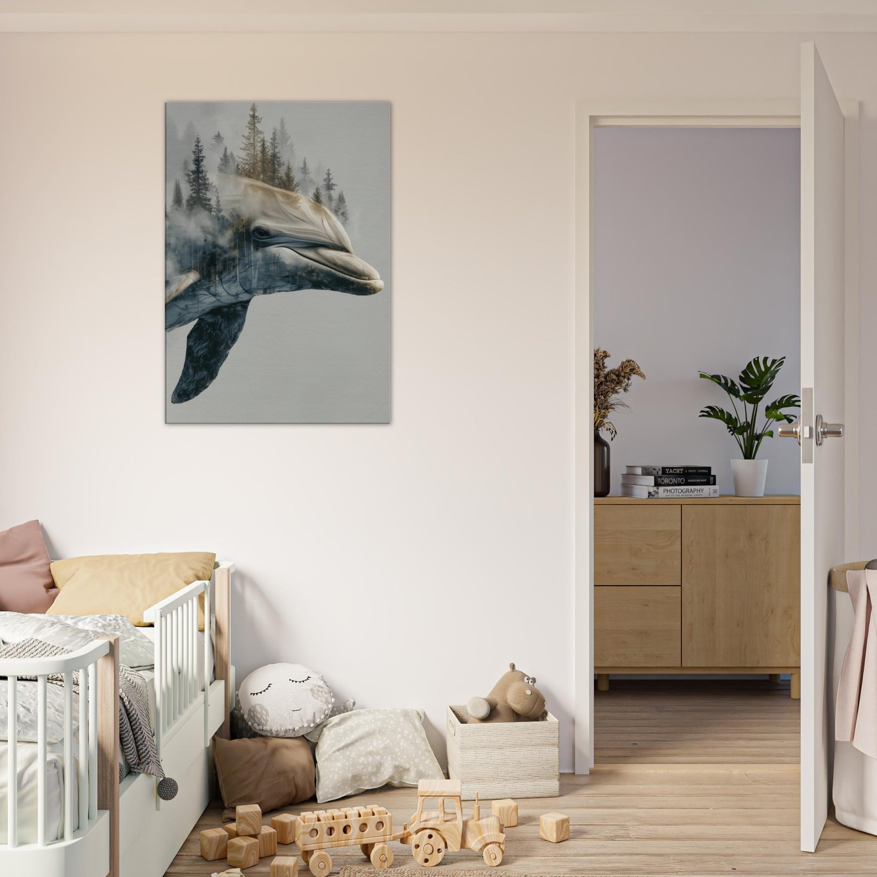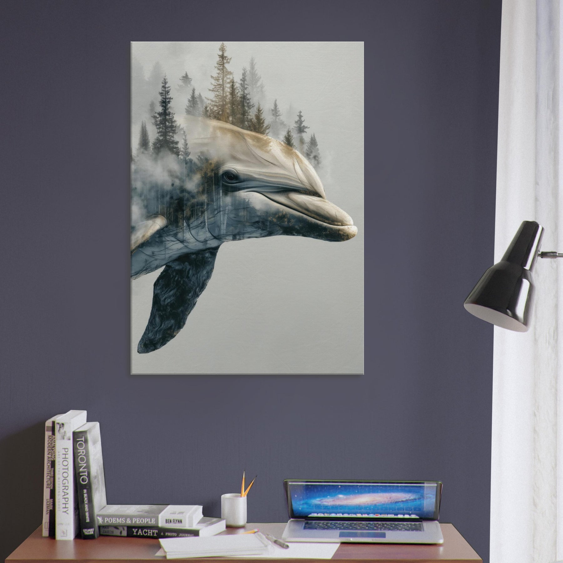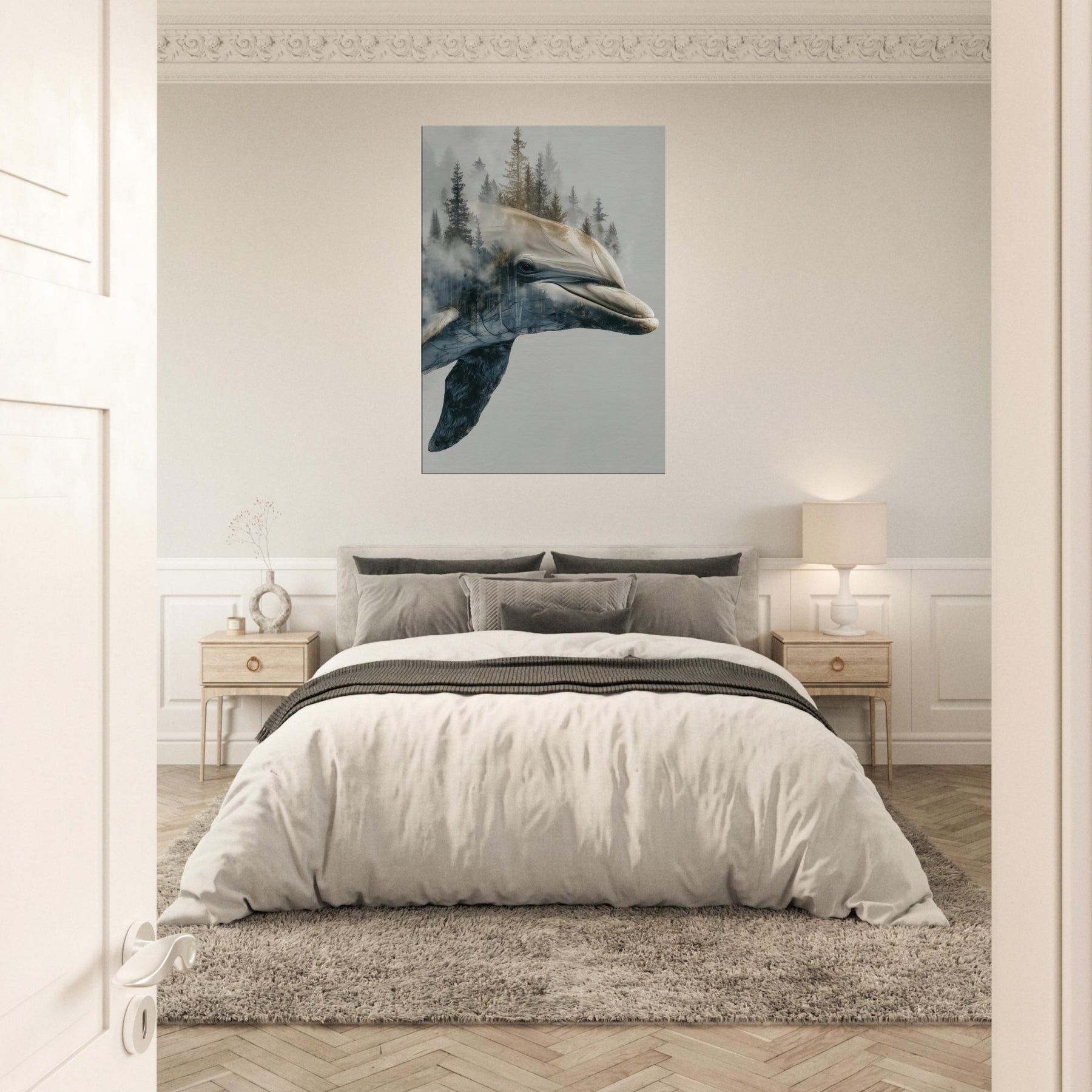 Let this surreal Dolphin drift through your room, where fog soft forests rise from the glassy sea of color. The dreamlike composition blends coastline memory with living trees, inviting quiet wonder as light shifts and coats every contour with a pearly glow. In your space, it becomes a companion of calm: a horizon in a frame, a whisper of motion that slows the day. Ideal over a sofa or bed, it softens sharp edges and elevates the atmosphere with a gentle, ocean fog presence.