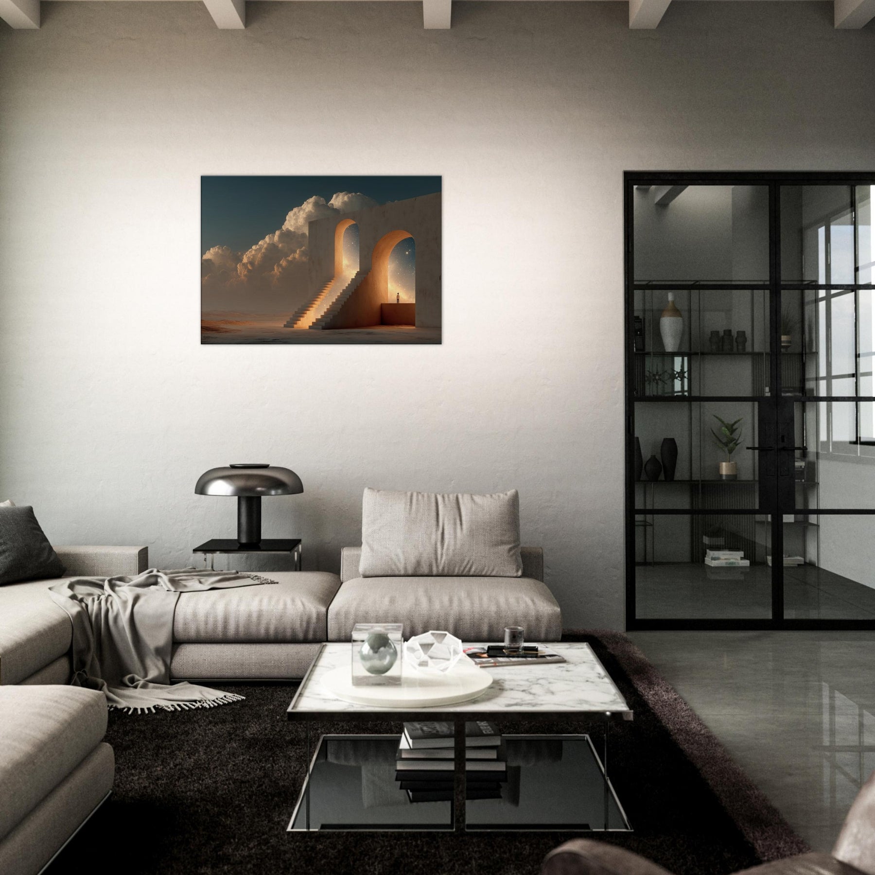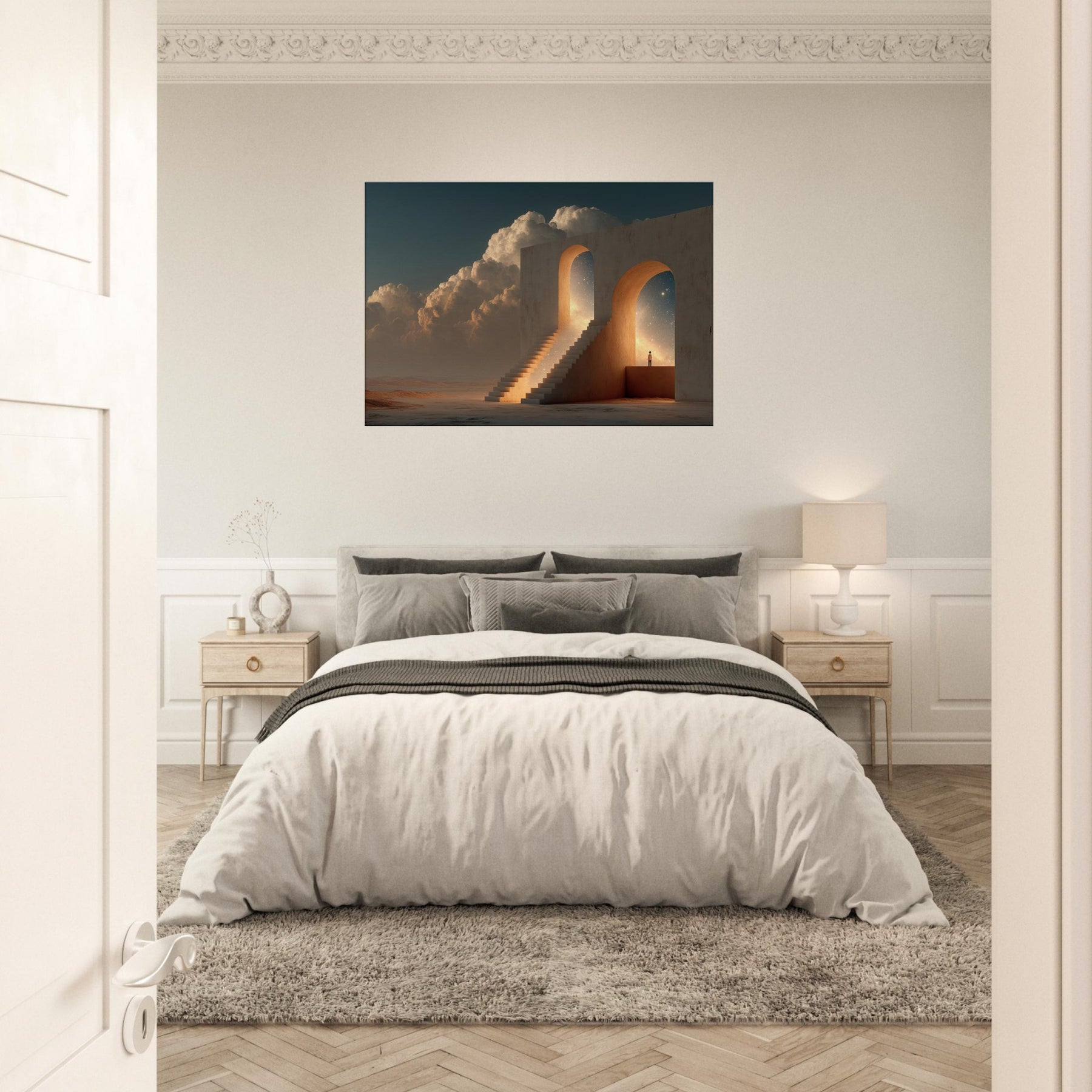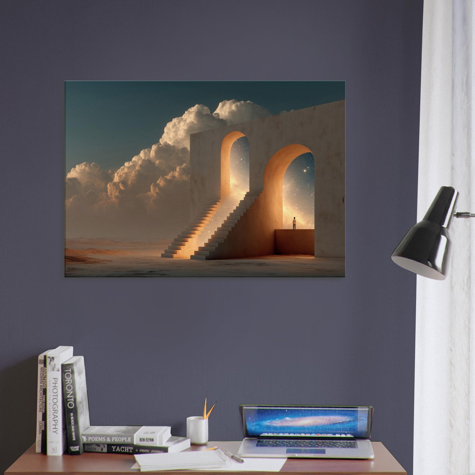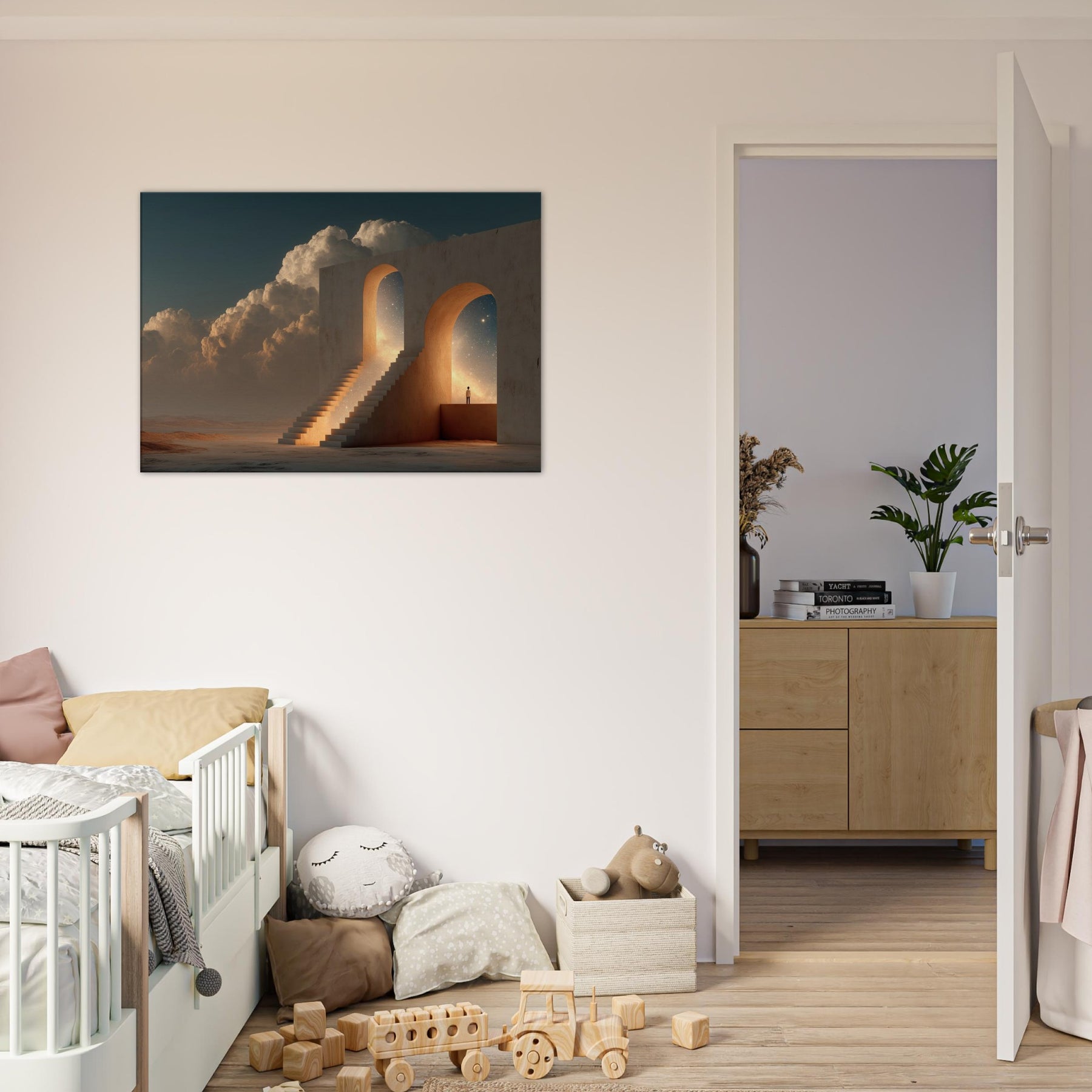 Step into a dream where Venice dissolves into light and staircases ascend toward a sky stitched with stars. This surreal composition marries architectural clarity with luminous impossibility, inviting a sense of quiet wonder into any room. The warm sandstone tones glow against dusk shadows, while the distant horizon breathes with the hush of a seaside city. Hang it to soften modern furniture with romantic drama, or let it anchor a reading nook as if you’ve wandered into a waking dream of Venice.