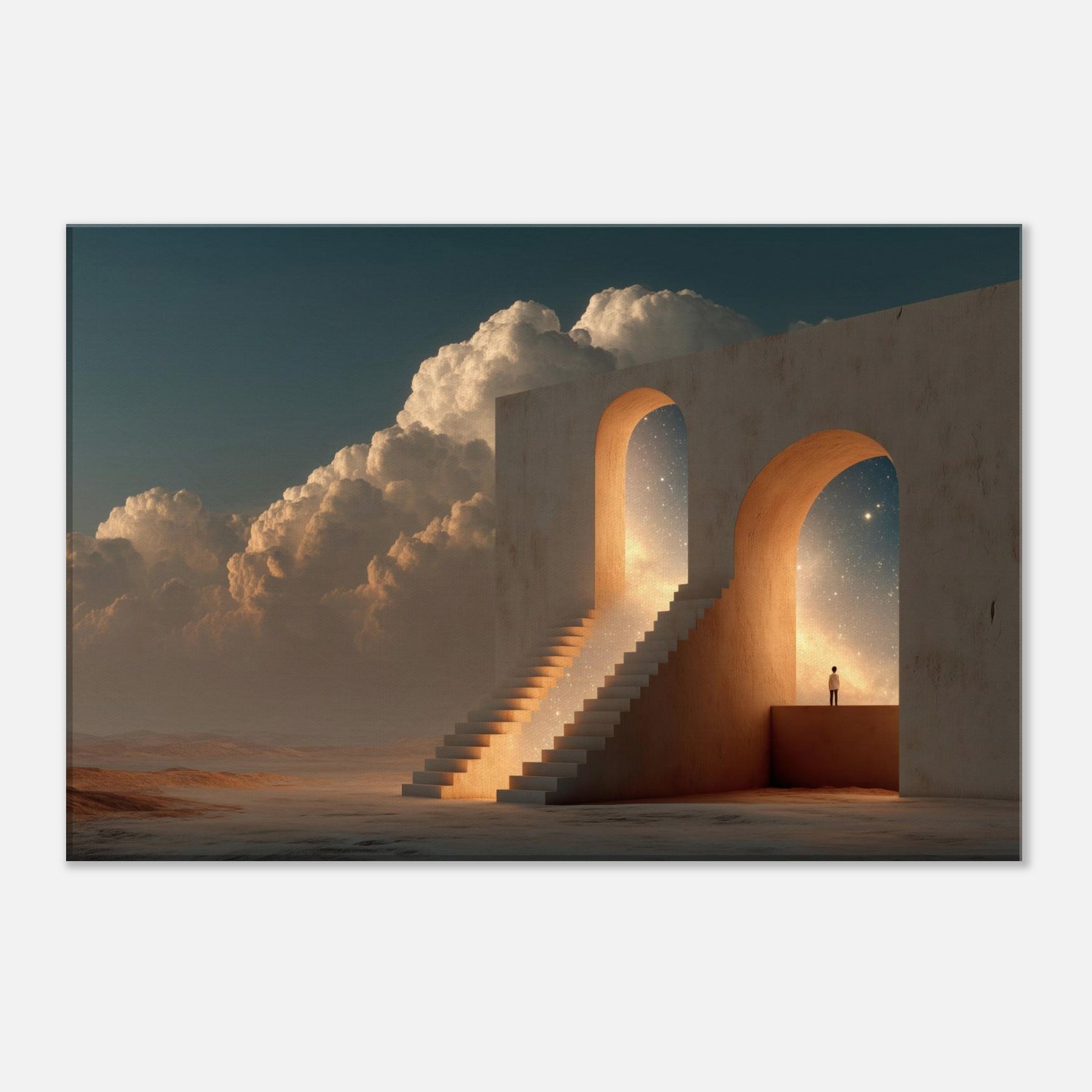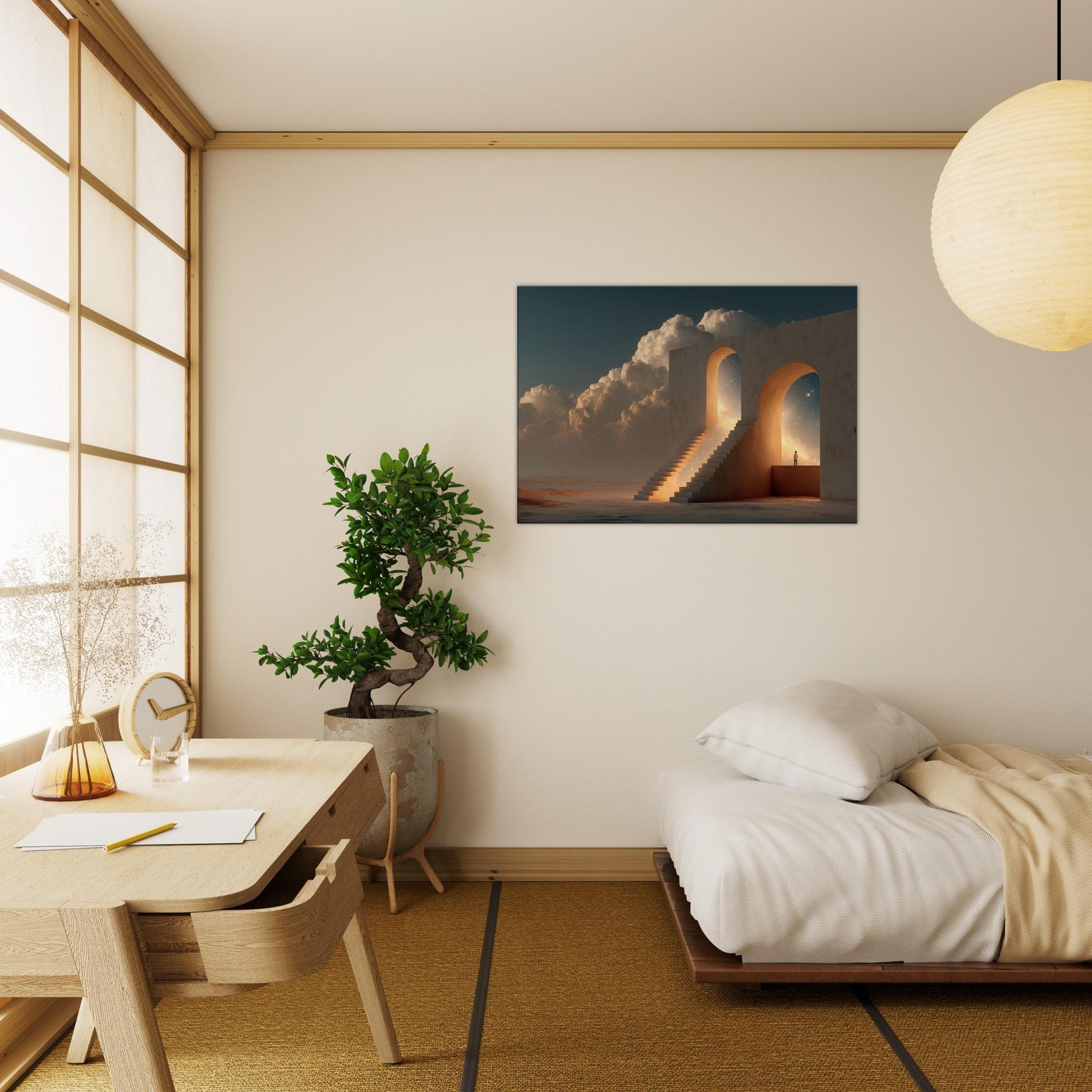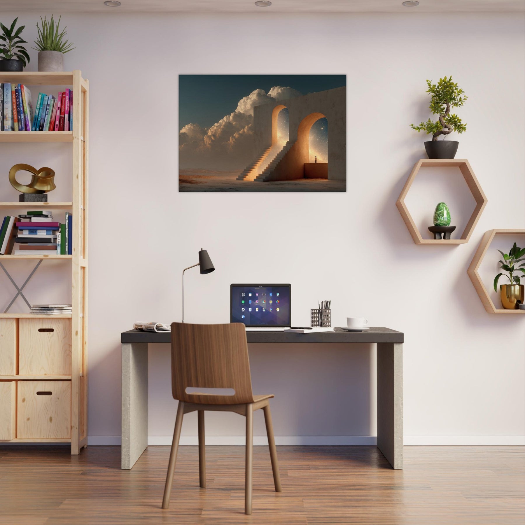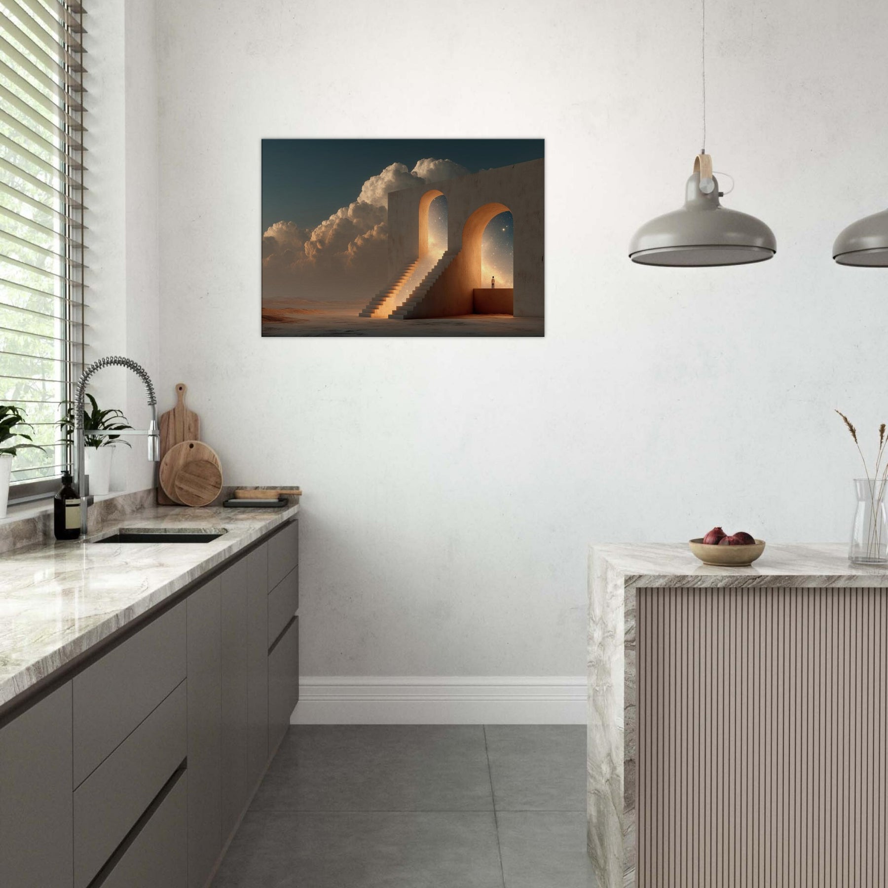 Step into a dream where Venice dissolves into light and staircases ascend toward a sky stitched with stars. This surreal composition marries architectural clarity with luminous impossibility, inviting a sense of quiet wonder into any room. The warm sandstone tones glow against dusk shadows, while the distant horizon breathes with the hush of a seaside city. Hang it to soften modern furniture with romantic drama, or let it anchor a reading nook as if you’ve wandered into a waking dream of Venice.