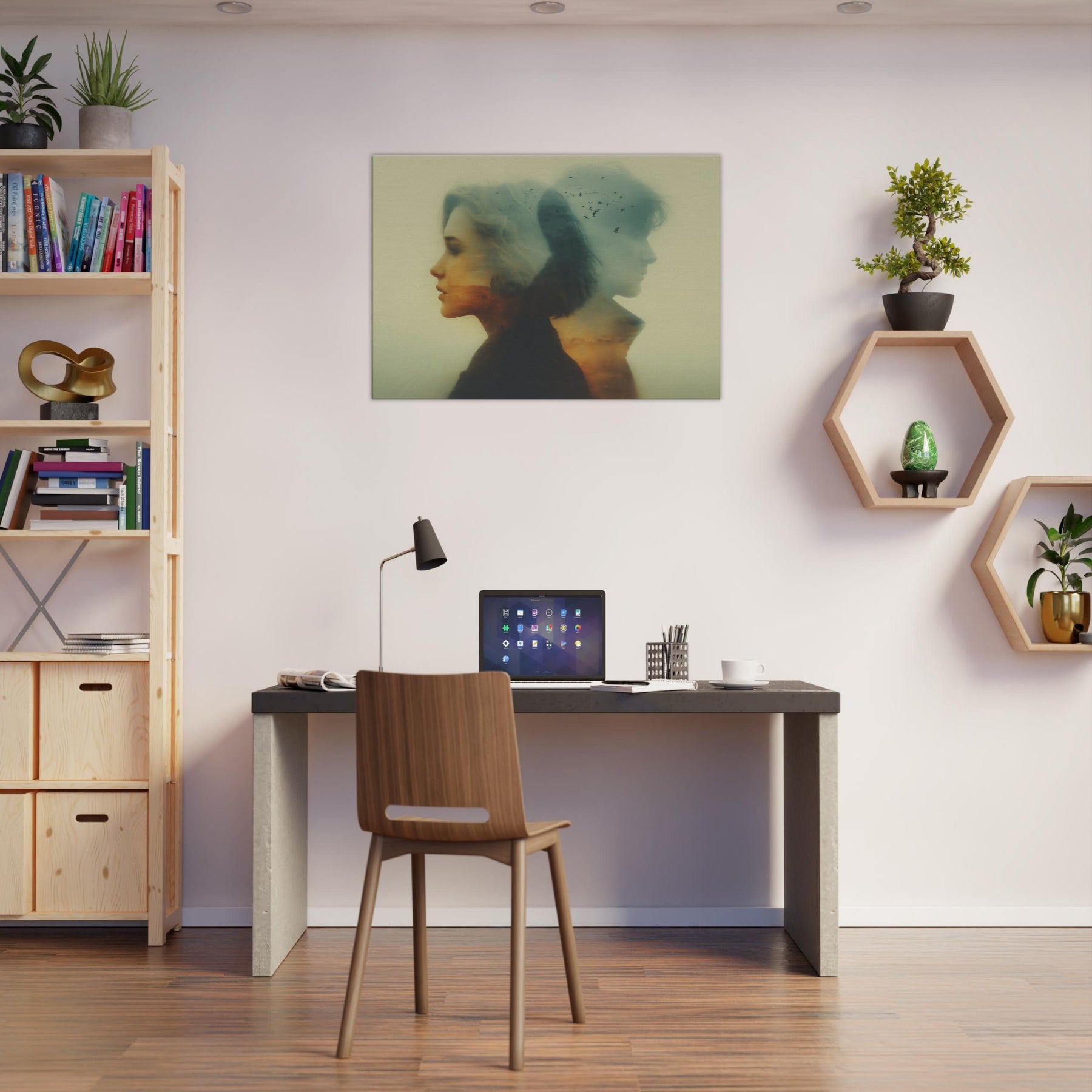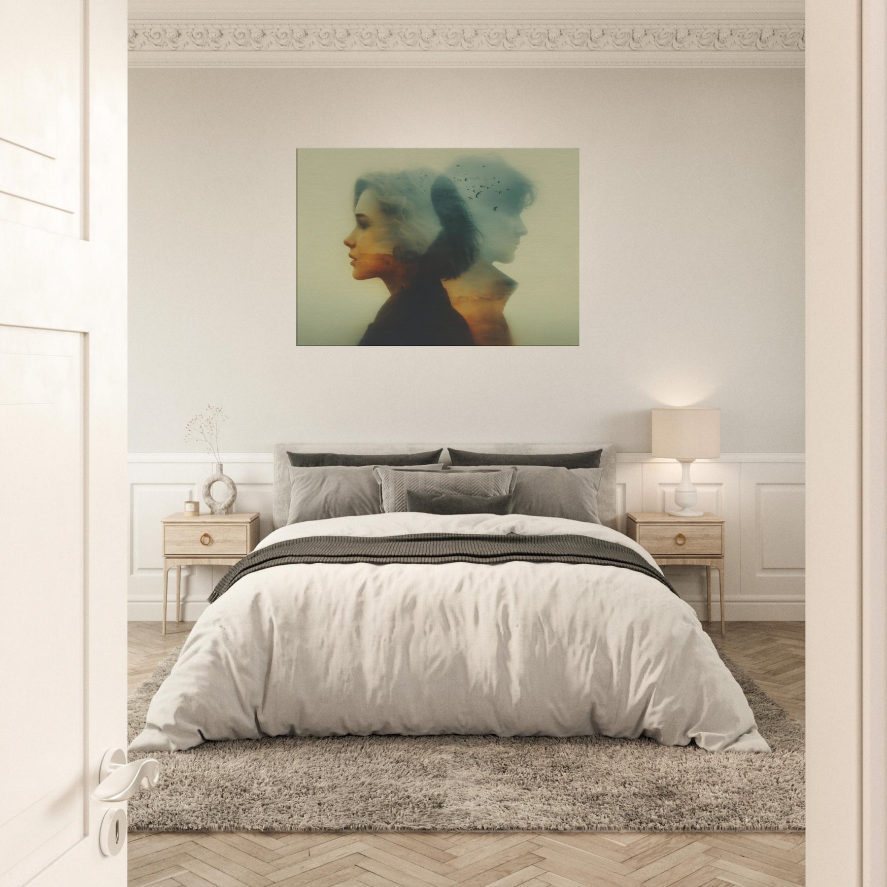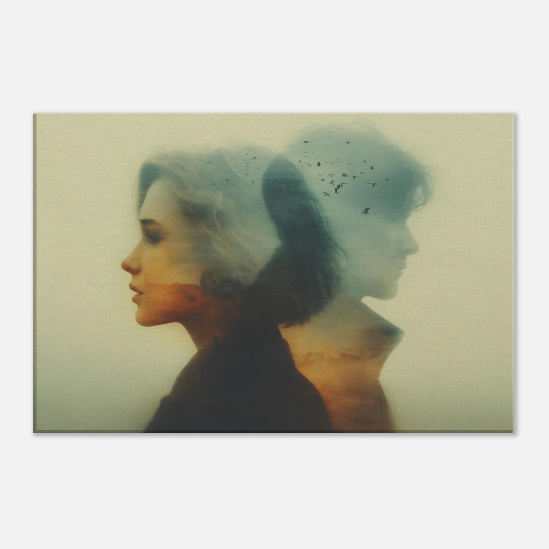Layered like a dream you can hang on a wall, this piece presents the Primary Subject, the Couple Silhouette, as if memory and moment share a single breath. Soft, hazy tones drift between two faces, while a distant flock of birds and a muted blur the line between inner feeling and outer space. The atmosphere is calm yet charged, inviting quiet reflection. In a living room, it adds depth, intimacy, and a surreal glow that makes every conversation feel gentler and more cinematic.