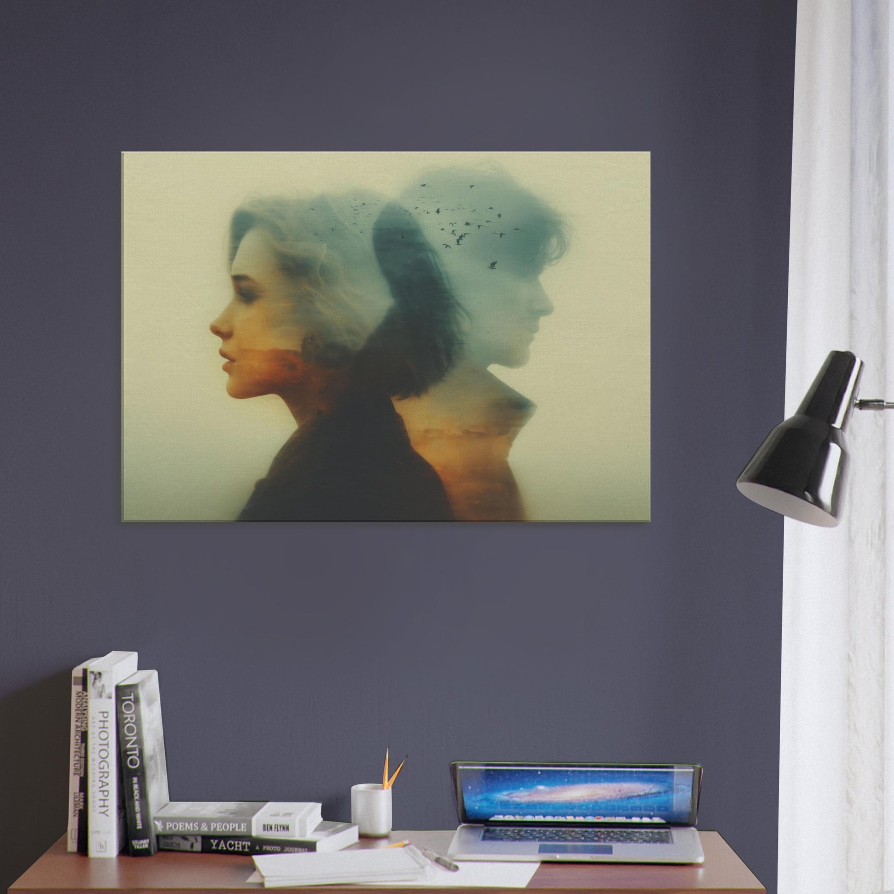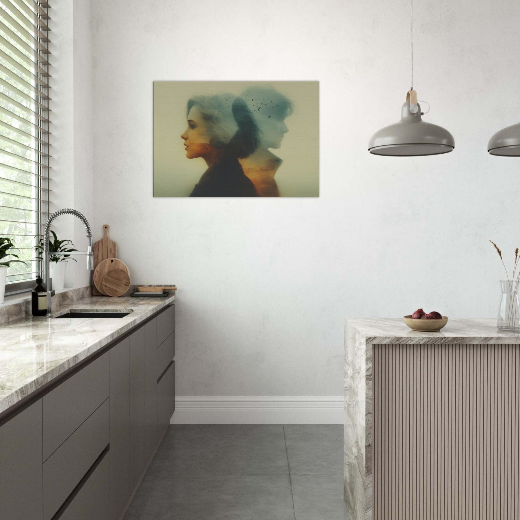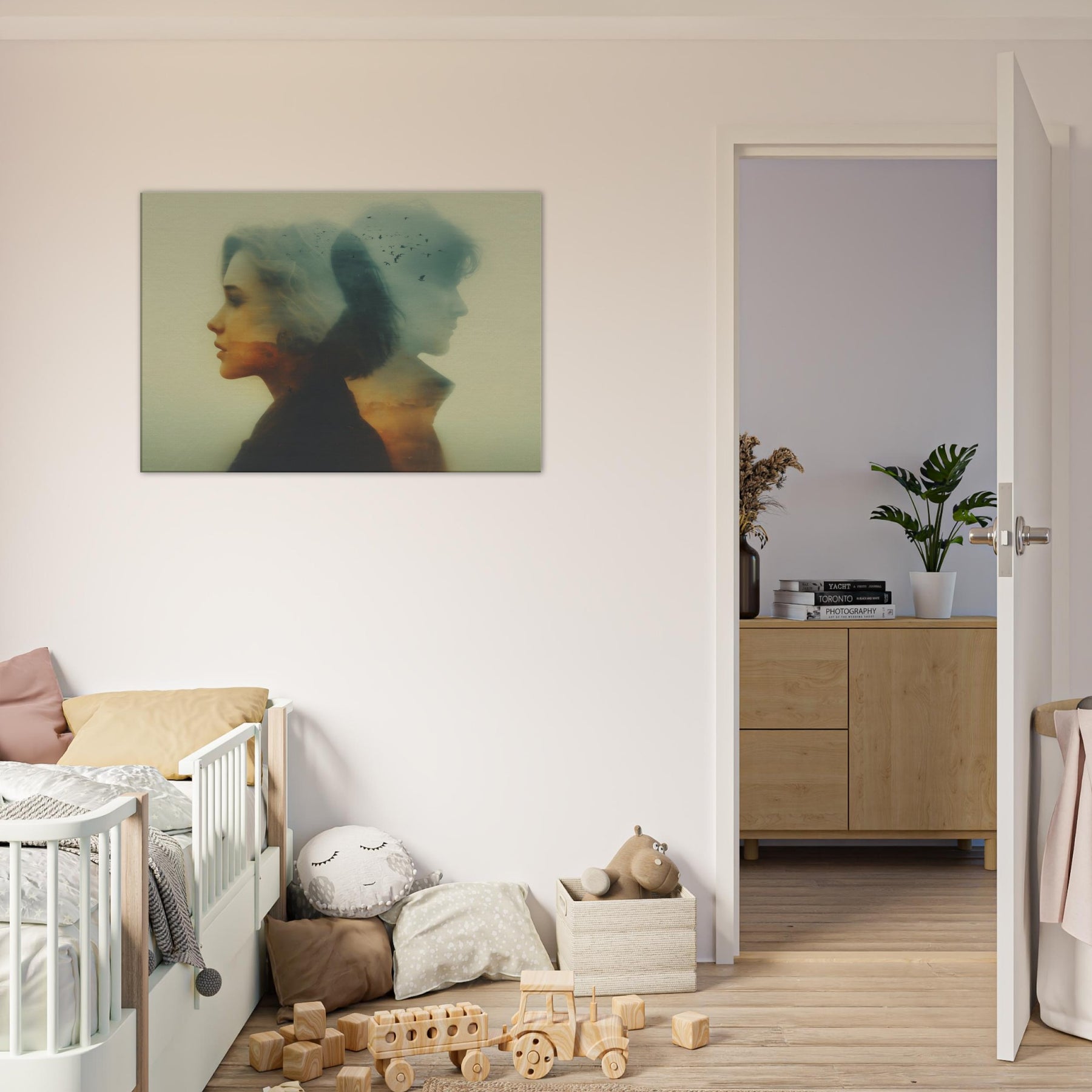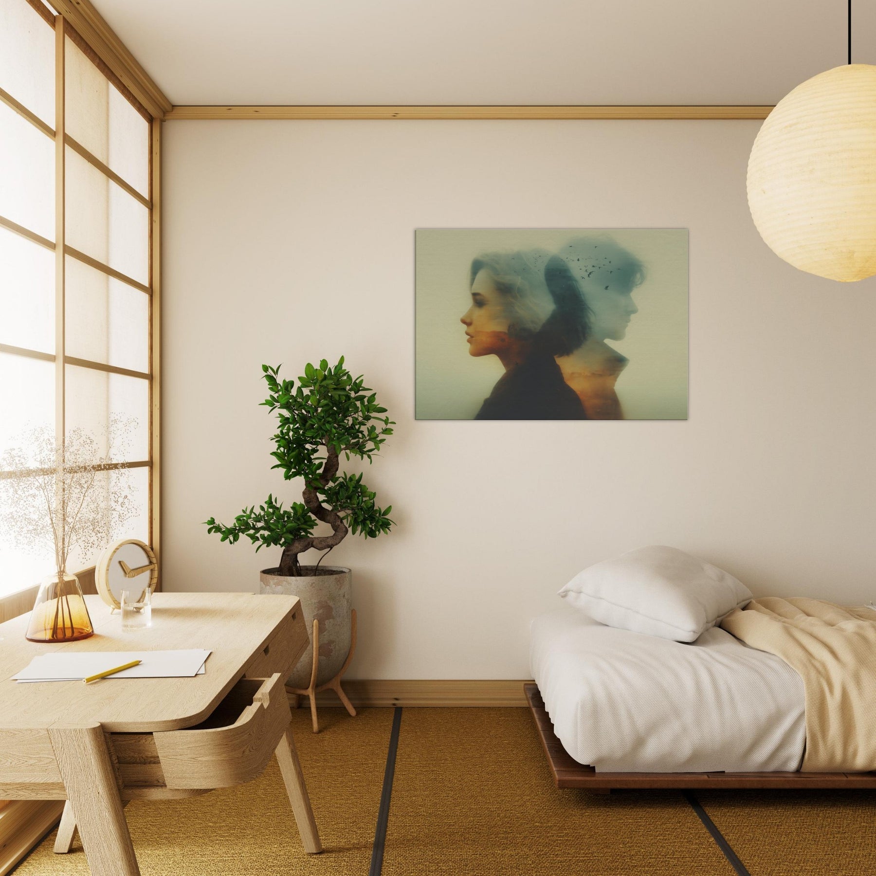 Layered like a dream you can hang on a wall, this piece presents the Primary Subject, the Couple Silhouette, as if memory and moment share a single breath. Soft, hazy tones drift between two faces, while a distant flock of birds and a muted blur the line between inner feeling and outer space. The atmosphere is calm yet charged, inviting quiet reflection. In a living room, it adds depth, intimacy, and a surreal glow that makes every conversation feel gentler and more cinematic.