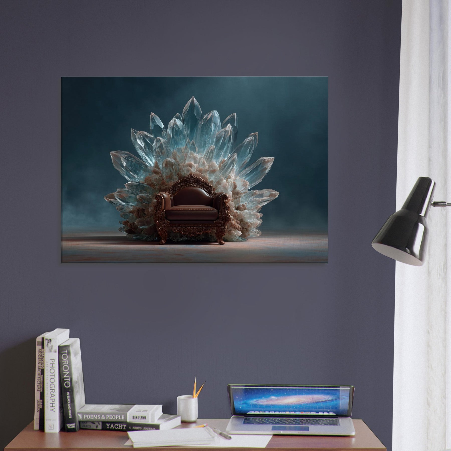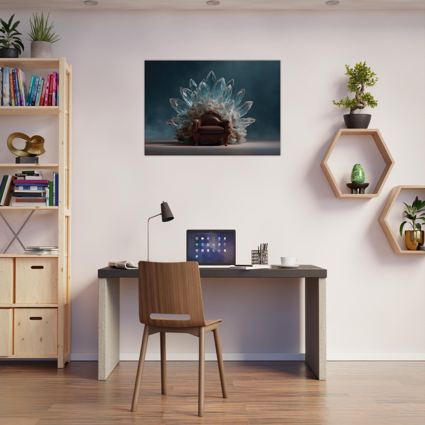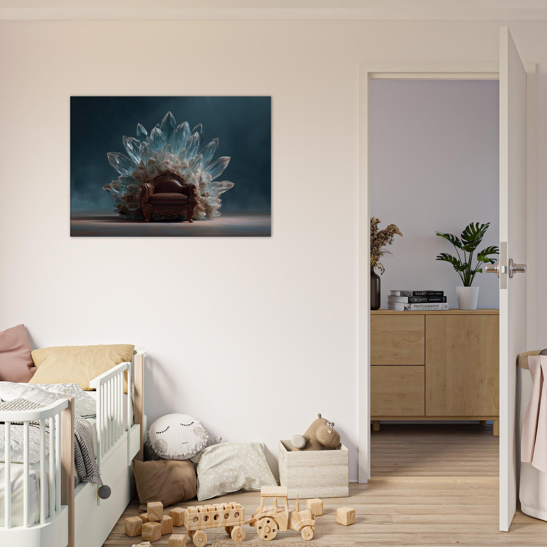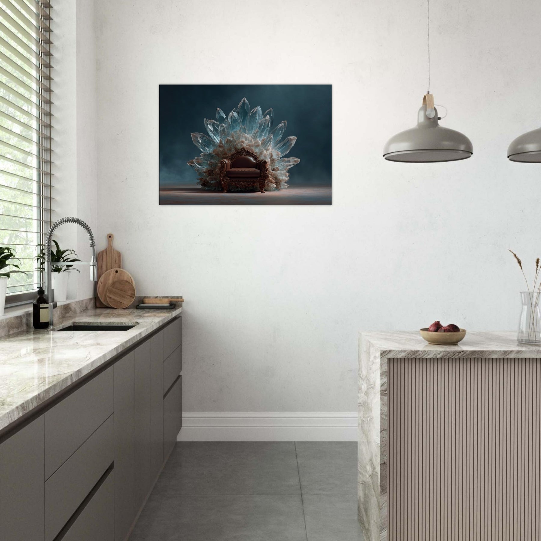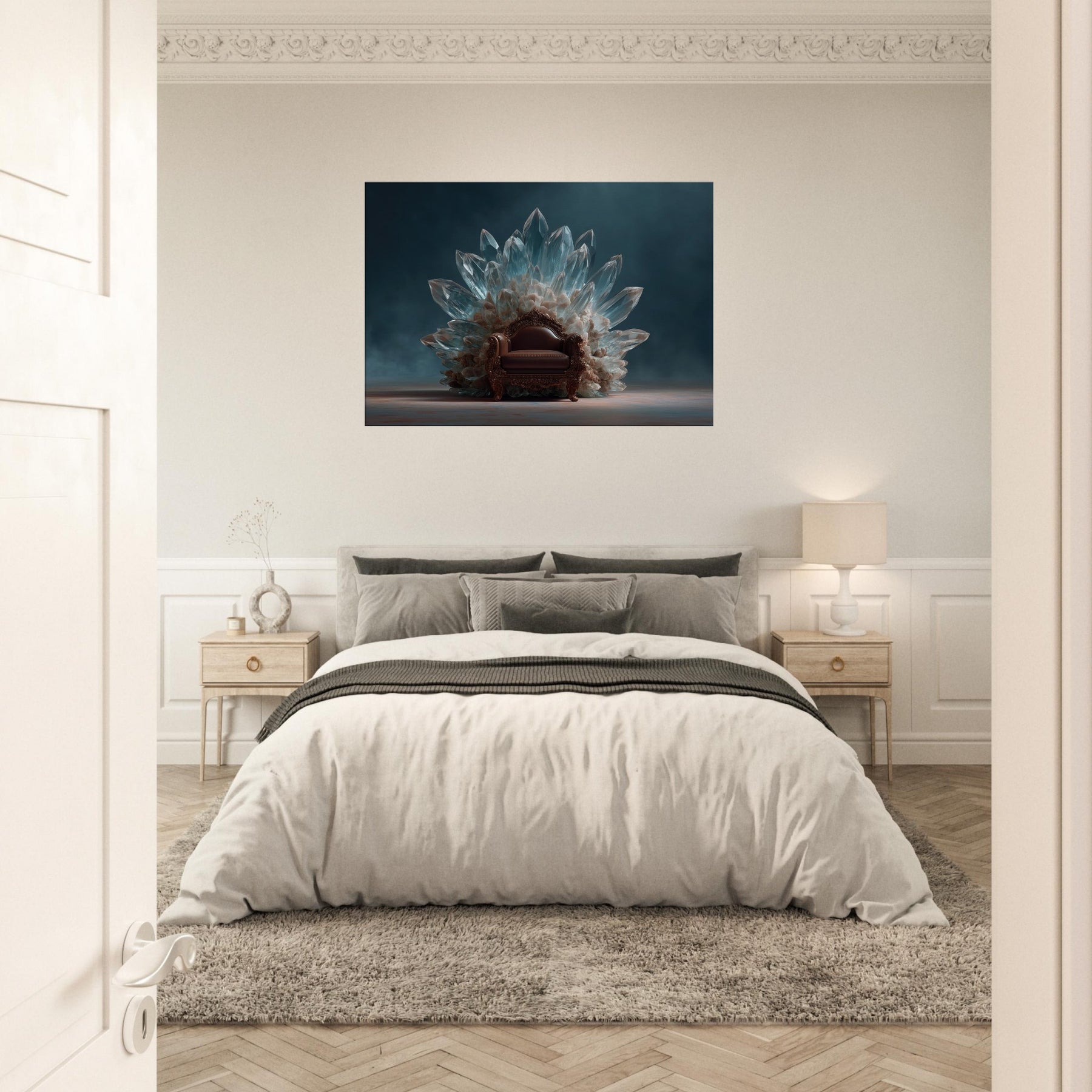 This surreal tableau places a jewel toned throne at the heart of a blooming halo of crystal petals. The Lotus Throne seems to rise from quiet mist, inviting contemplation as air seems to shimmer with memory. The artwork blends opulent vintage carving with crystalline geometry, a dreamlike fusion that brings a sense of sanctuary to living rooms, bedrooms, or study. Its luminous blues and warm browns create a conductor for calm, a focal point that quiets conversation and invites meditative presence.