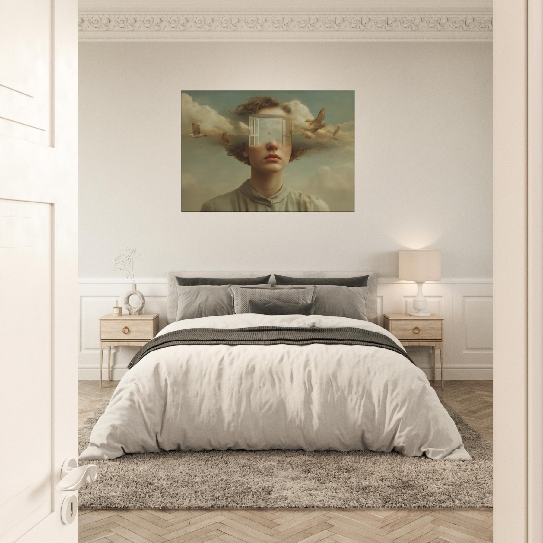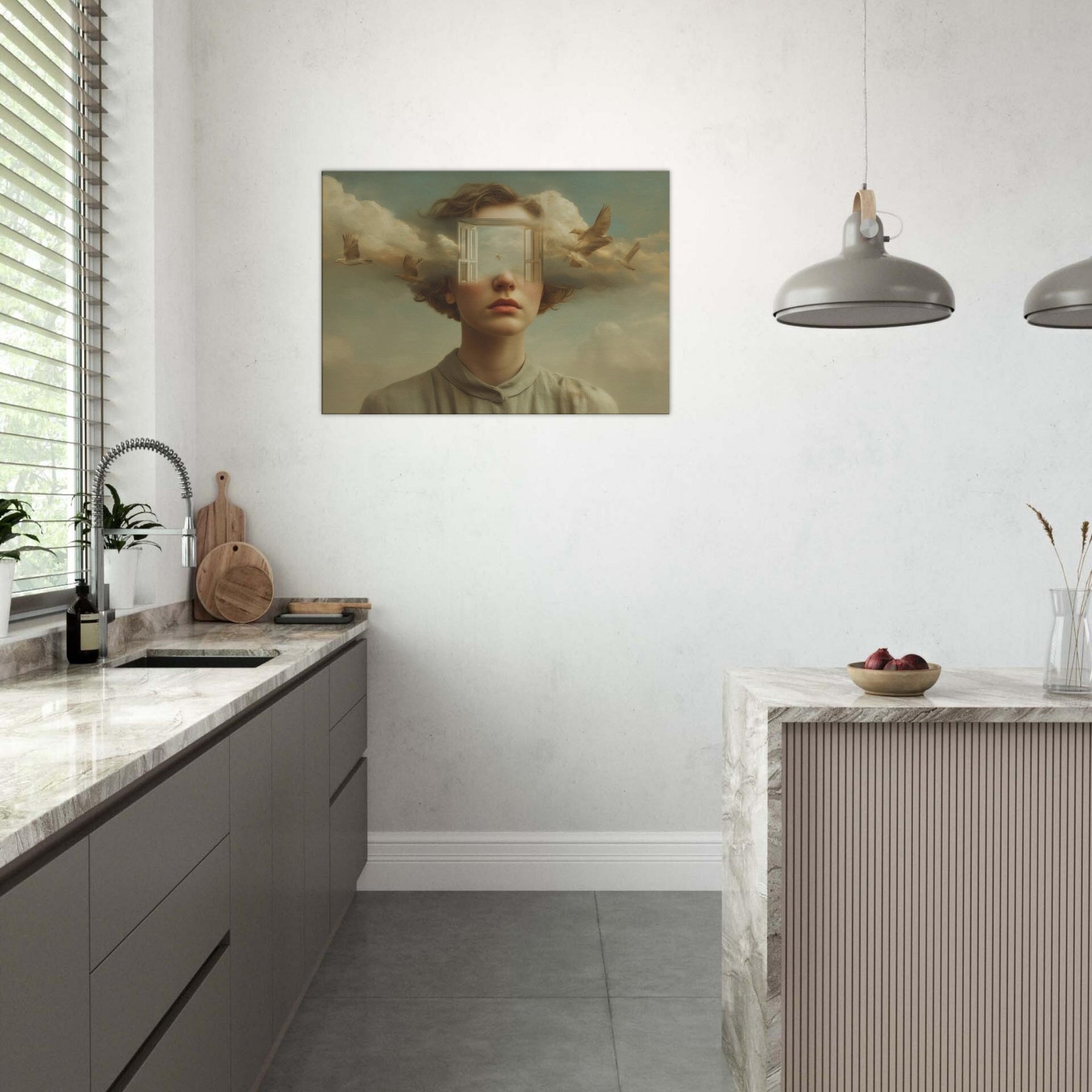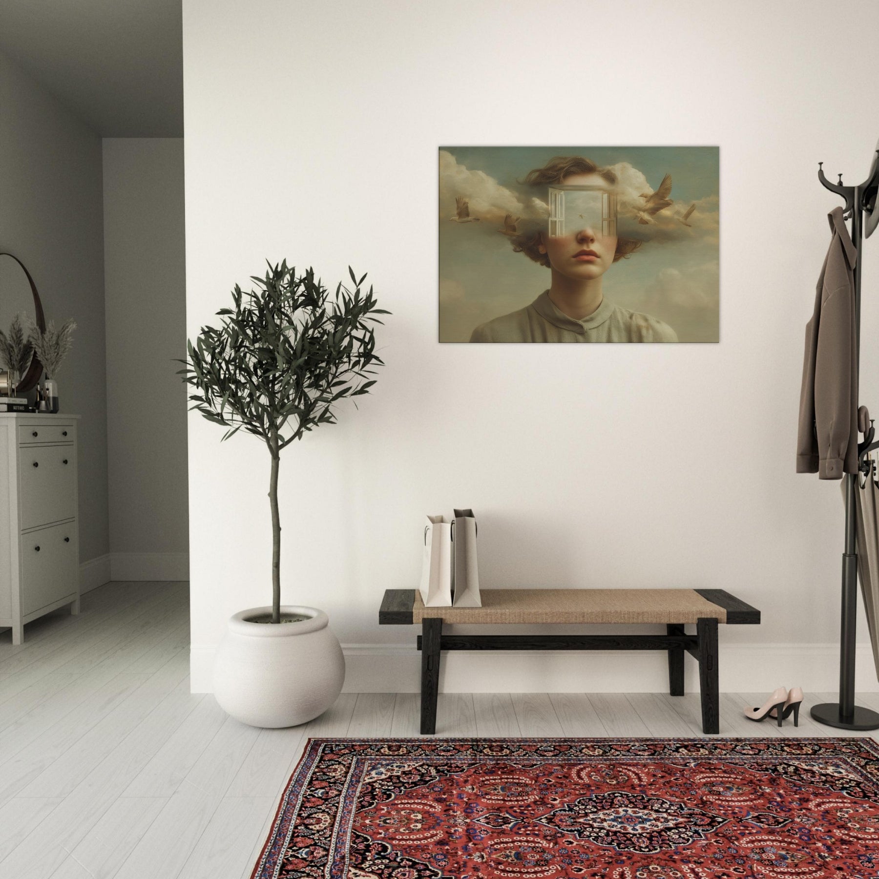 An Asian Woman emerges from a dreamlike haze, where a doorway opens across the upper half of the face and birds drift through the sky of memory. This surreal composition invites quiet reverie, as soft edges and warm light blend the boundary between inside and out. Hang it in a living room or study to conjure a serene, contemplative mood a tactile invitation to pause, breathe, and drift between worlds whenever you gaze upon it.