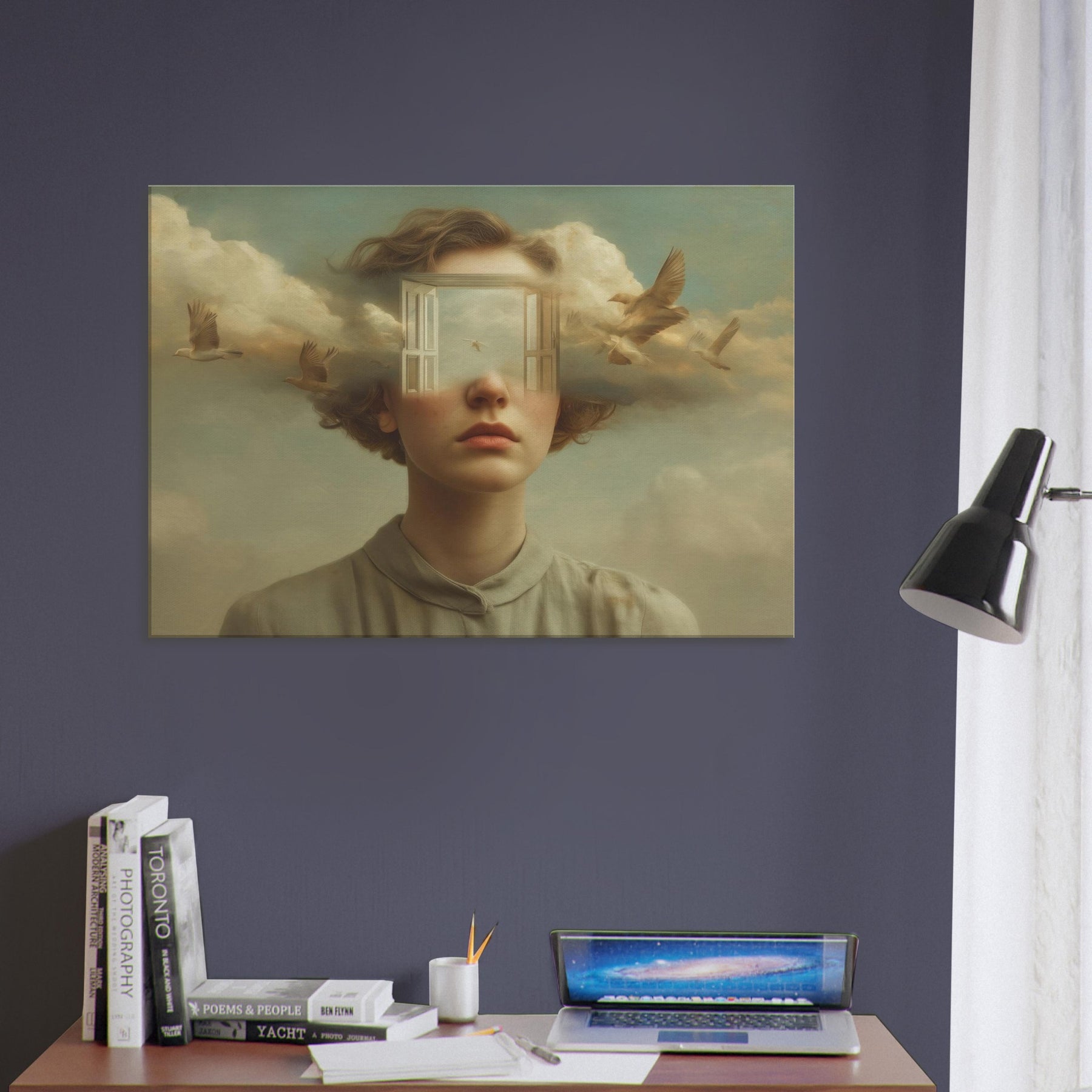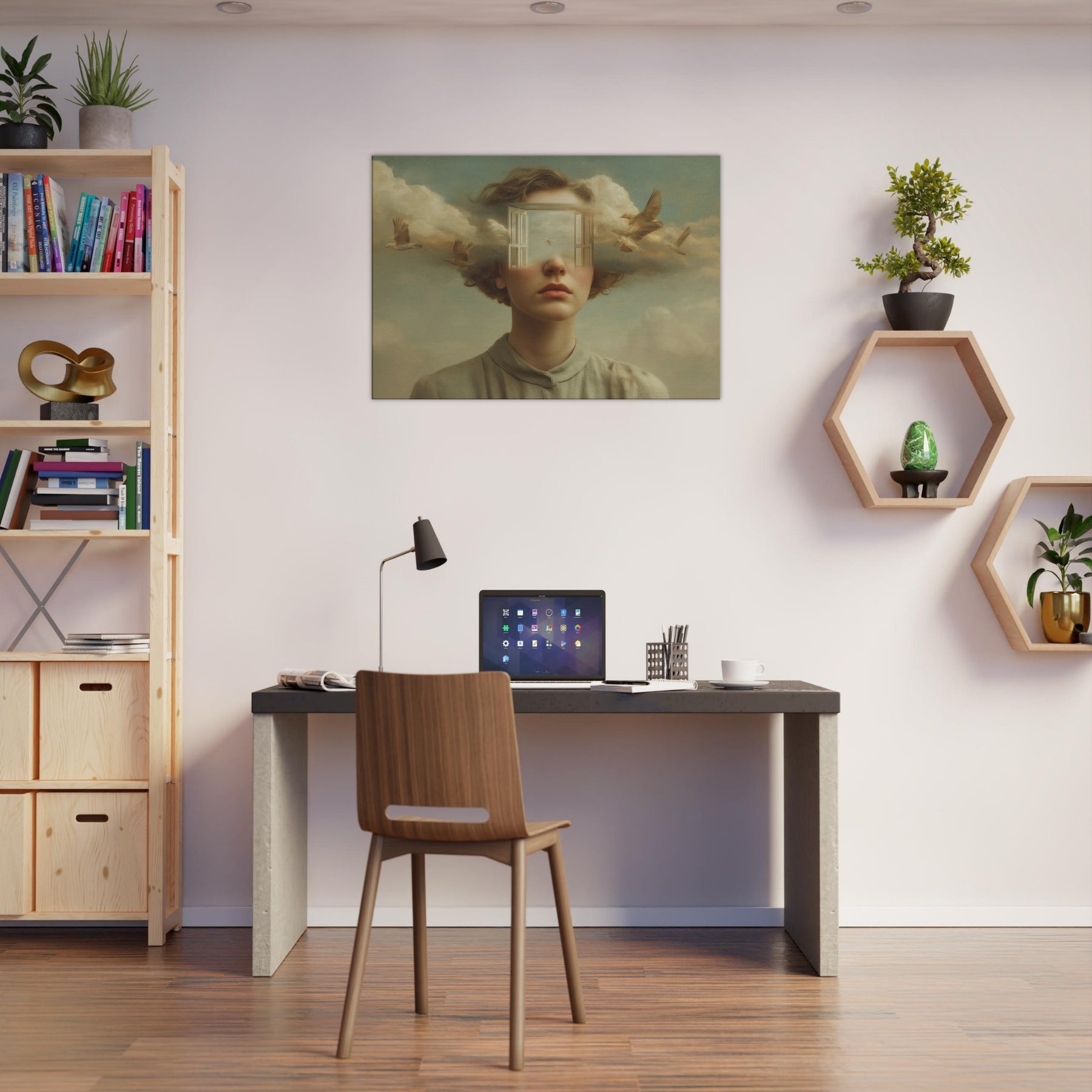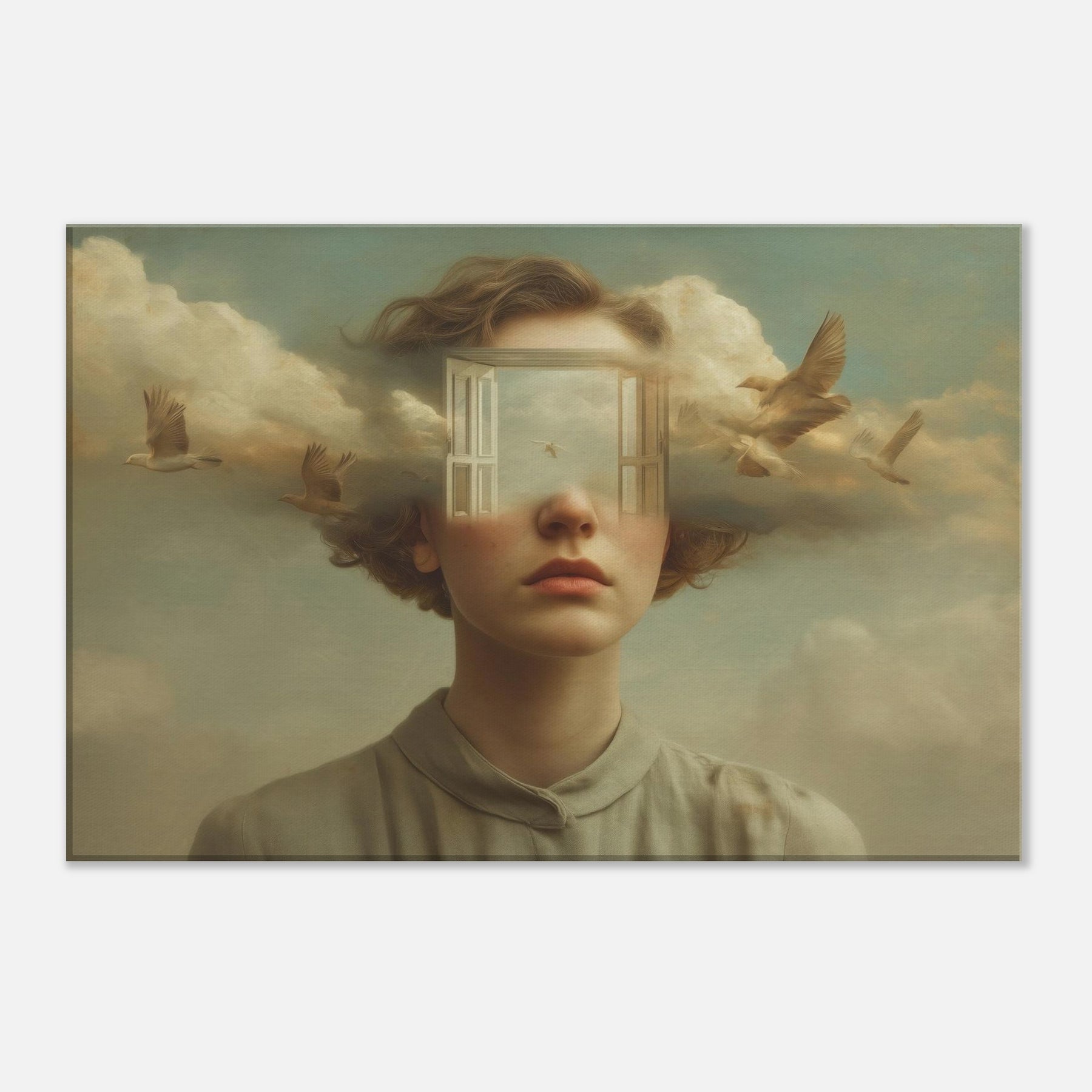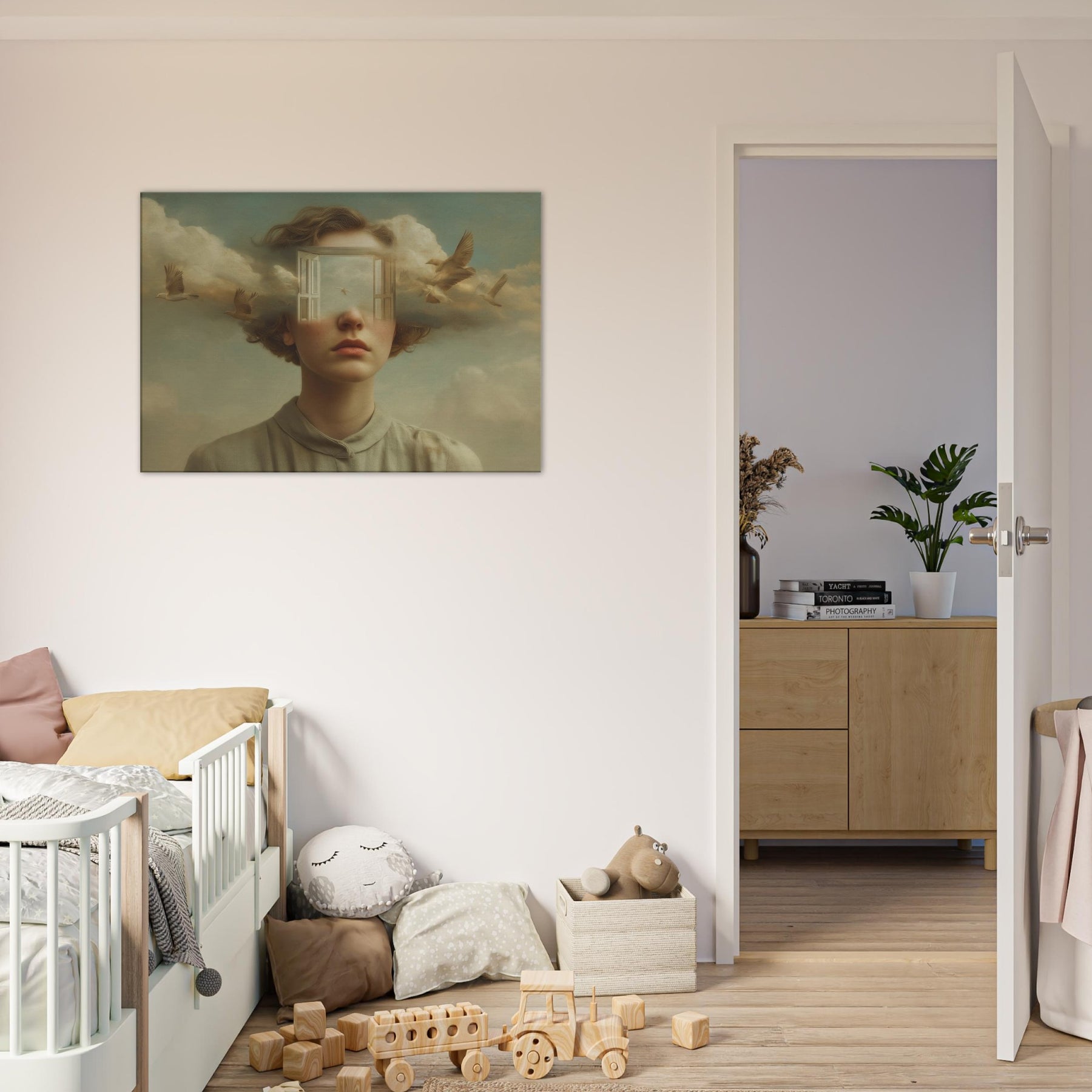 An Asian Woman emerges from a dreamlike haze, where a doorway opens across the upper half of the face and birds drift through the sky of memory. This surreal composition invites quiet reverie, as soft edges and warm light blend the boundary between inside and out. Hang it in a living room or study to conjure a serene, contemplative mood a tactile invitation to pause, breathe, and drift between worlds whenever you gaze upon it.