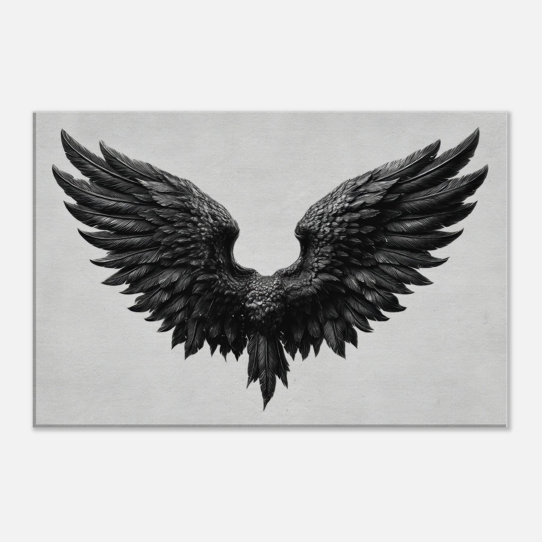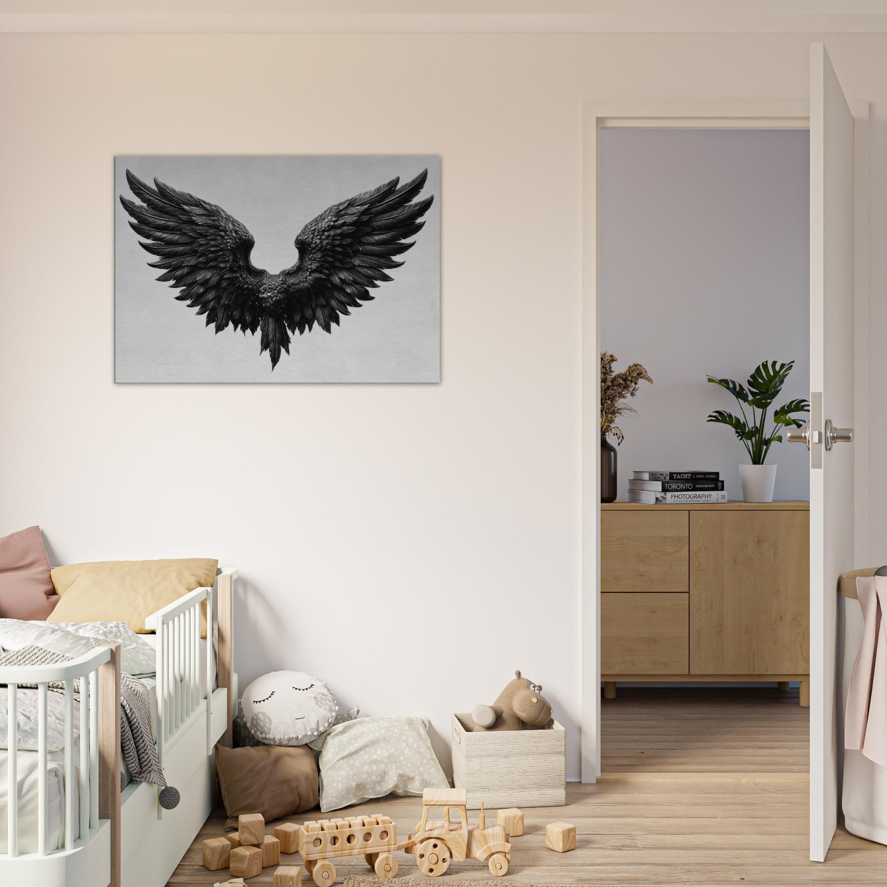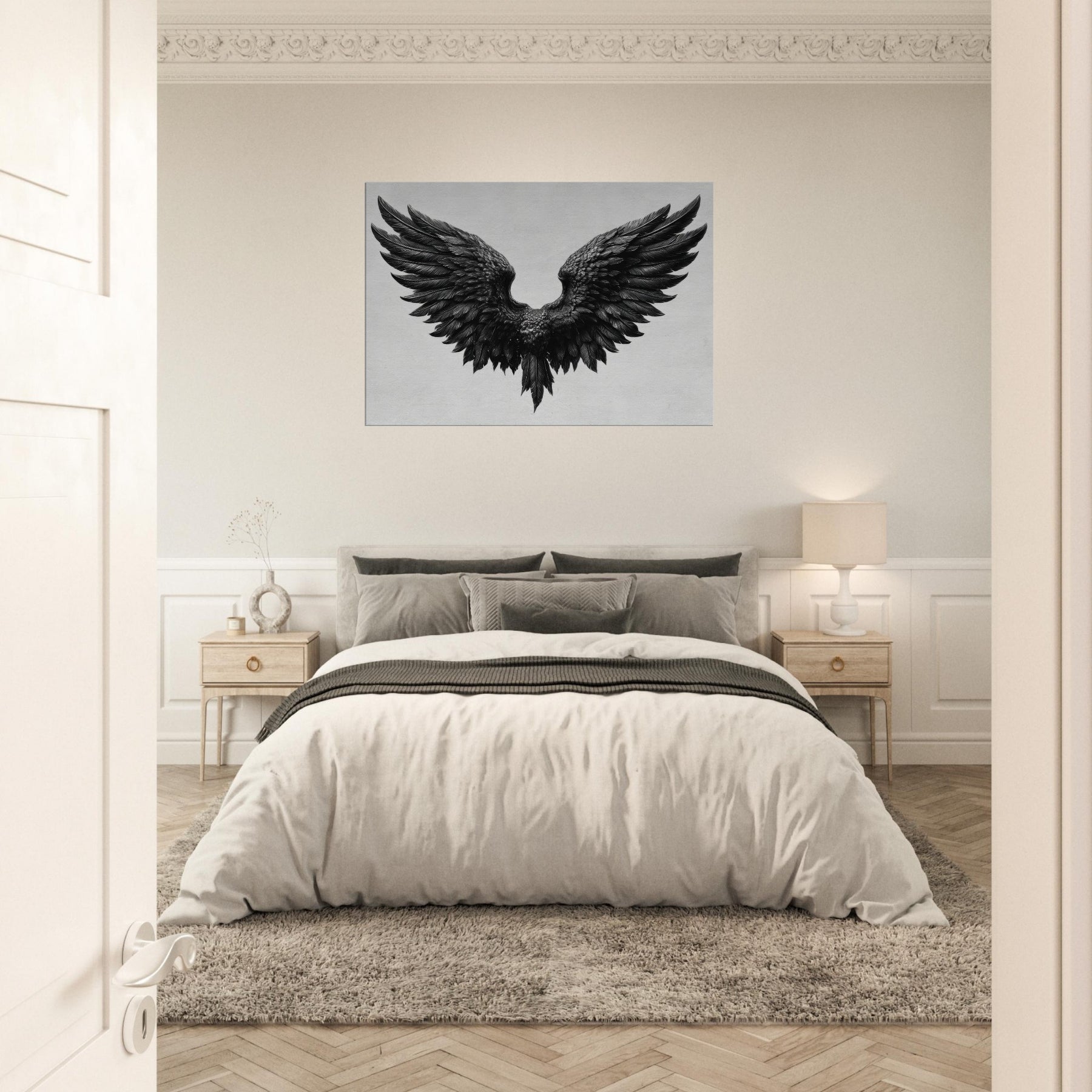 Guardian Angel Wings unfurl in a hush of ink and light, a bold black and white study that feels both ancient and immediate. The feathers cascade in a tactile, wind driven arc, shaping a protective, mystical presence that invites quiet reflection. This wall art softens hard surfaces with its sensuous contrast, turning a living space into a sanctuary where sound slows and ambience deepens. A striking focal point for modern interiors, it lends the room a quiet grace and a sense of guardian vigilance.