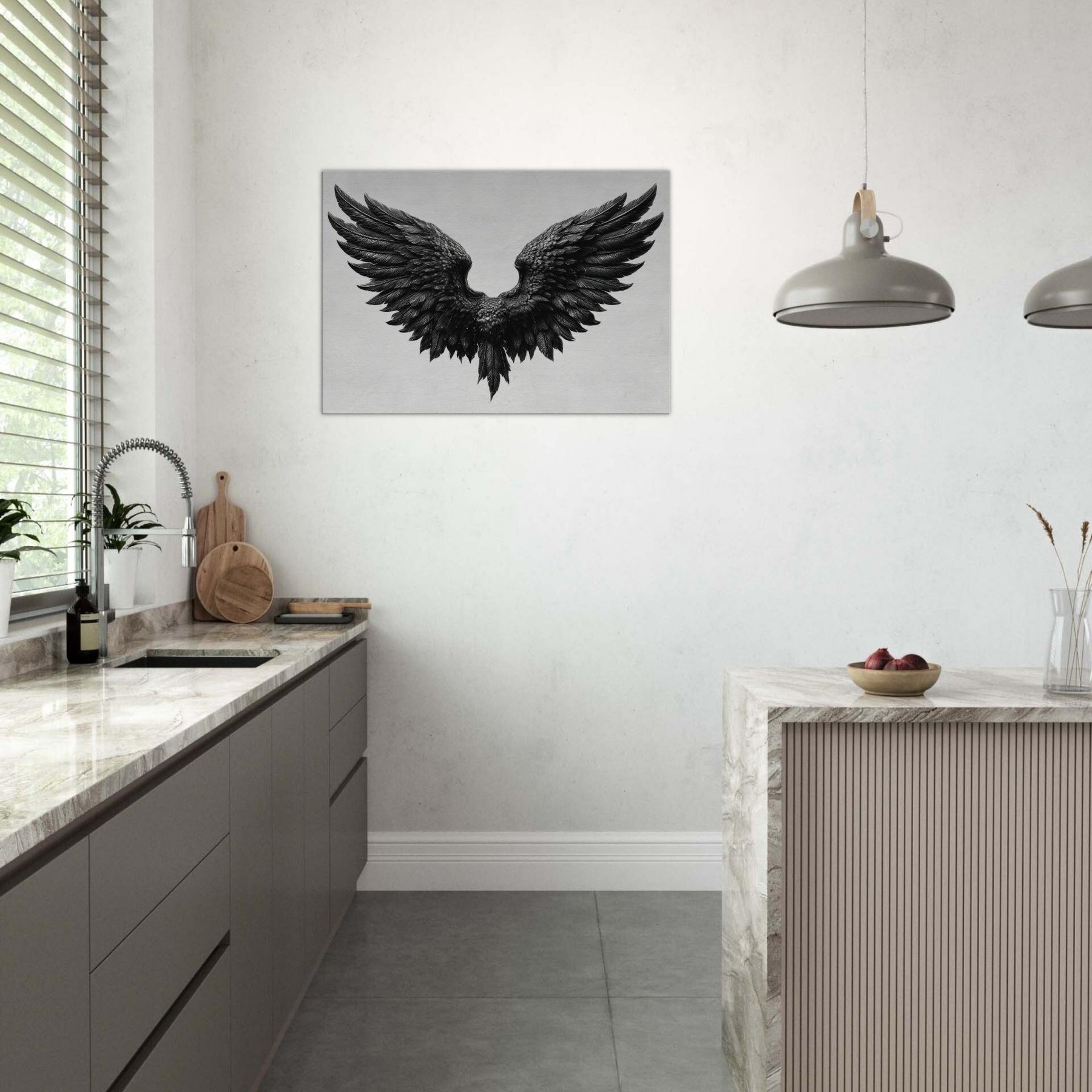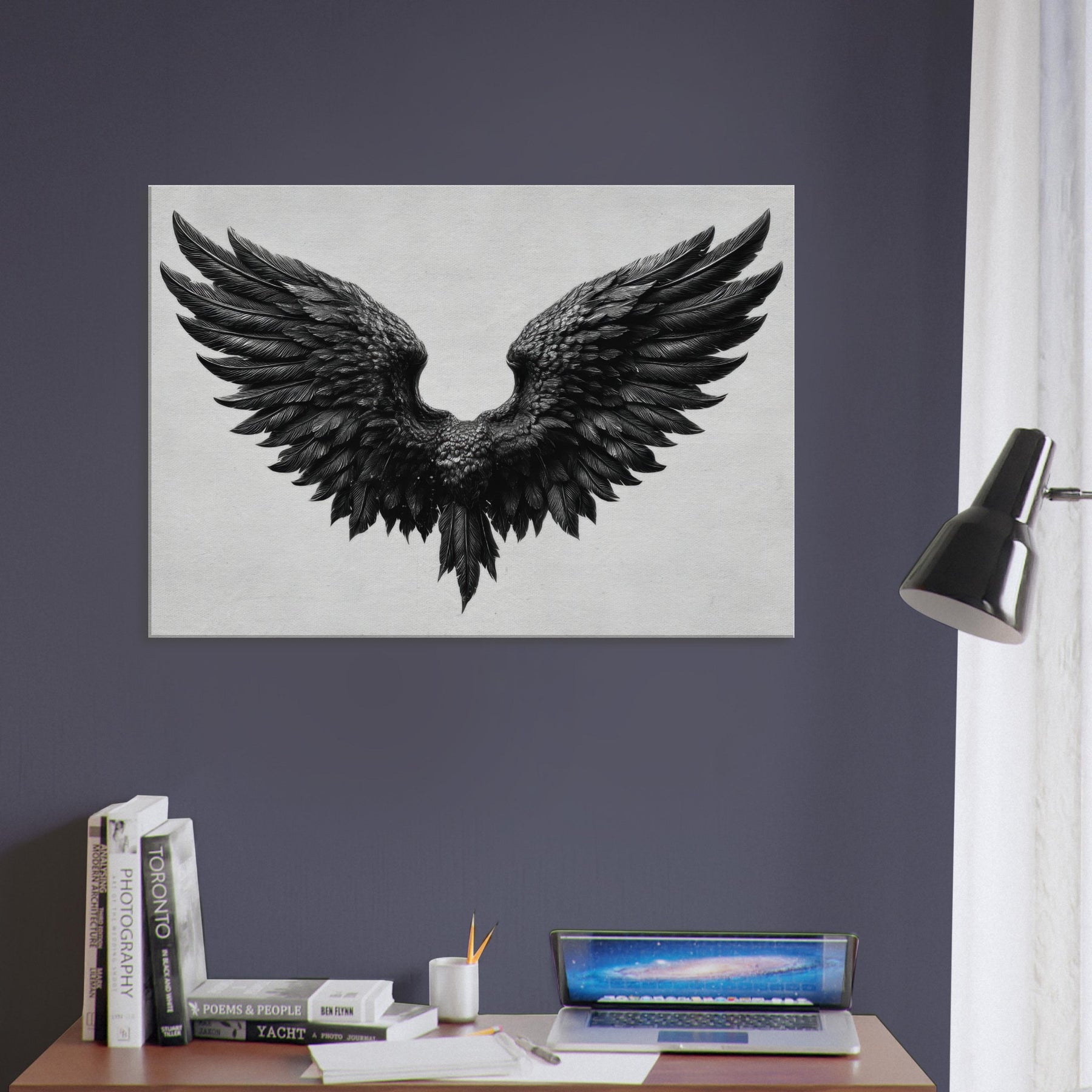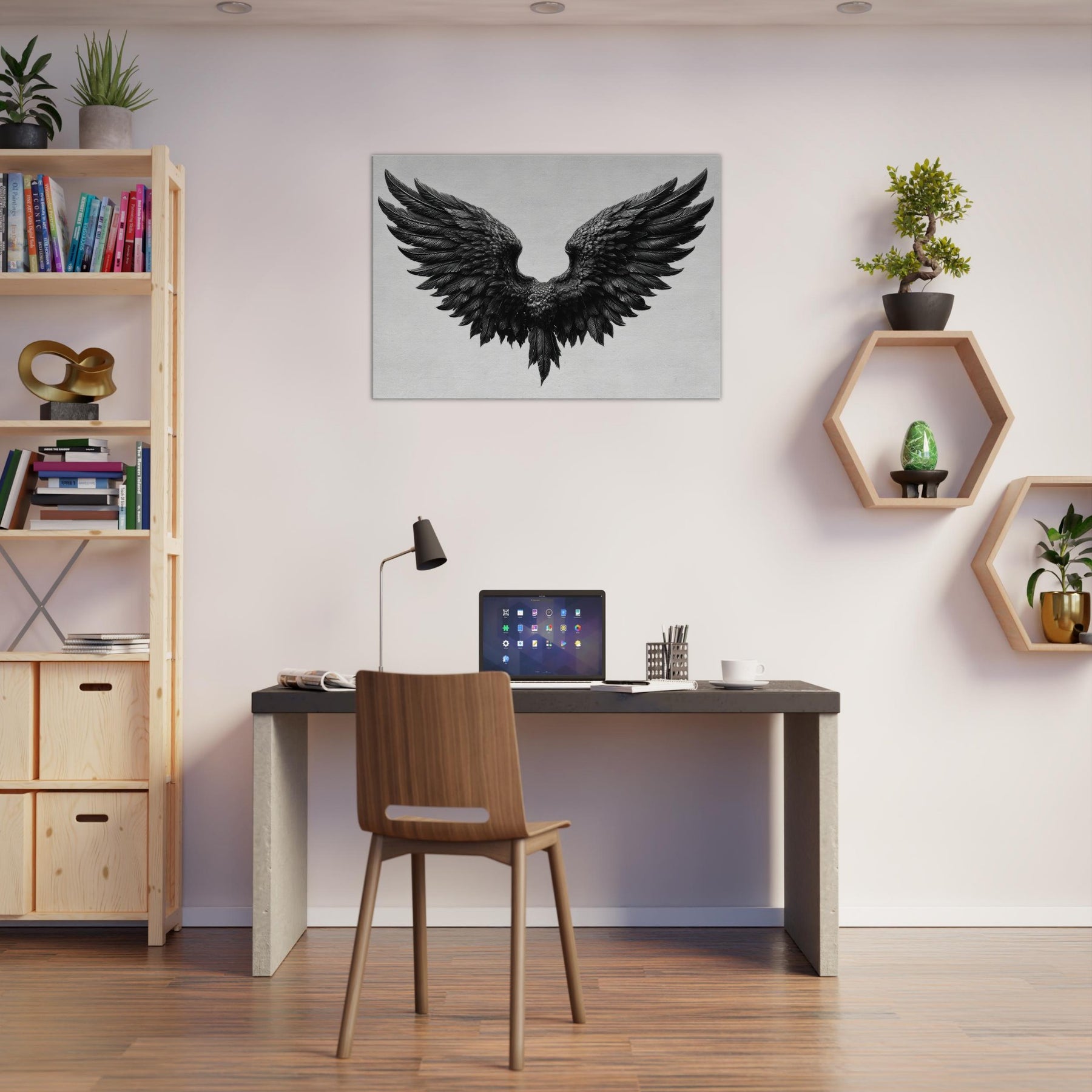 Guardian Angel Wings unfurl in a hush of ink and light, a bold black and white study that feels both ancient and immediate. The feathers cascade in a tactile, wind driven arc, shaping a protective, mystical presence that invites quiet reflection. This wall art softens hard surfaces with its sensuous contrast, turning a living space into a sanctuary where sound slows and ambience deepens. A striking focal point for modern interiors, it lends the room a quiet grace and a sense of guardian vigilance.