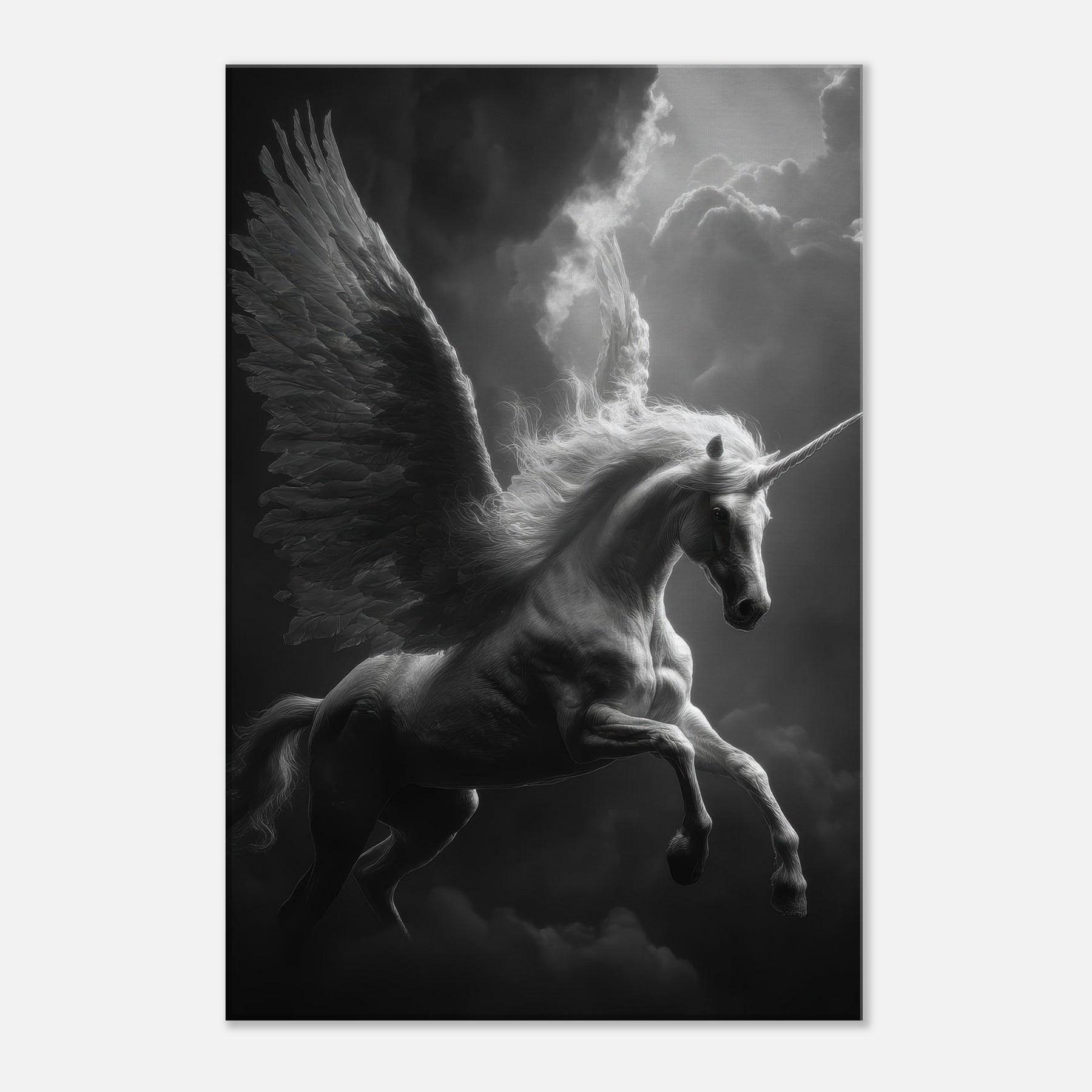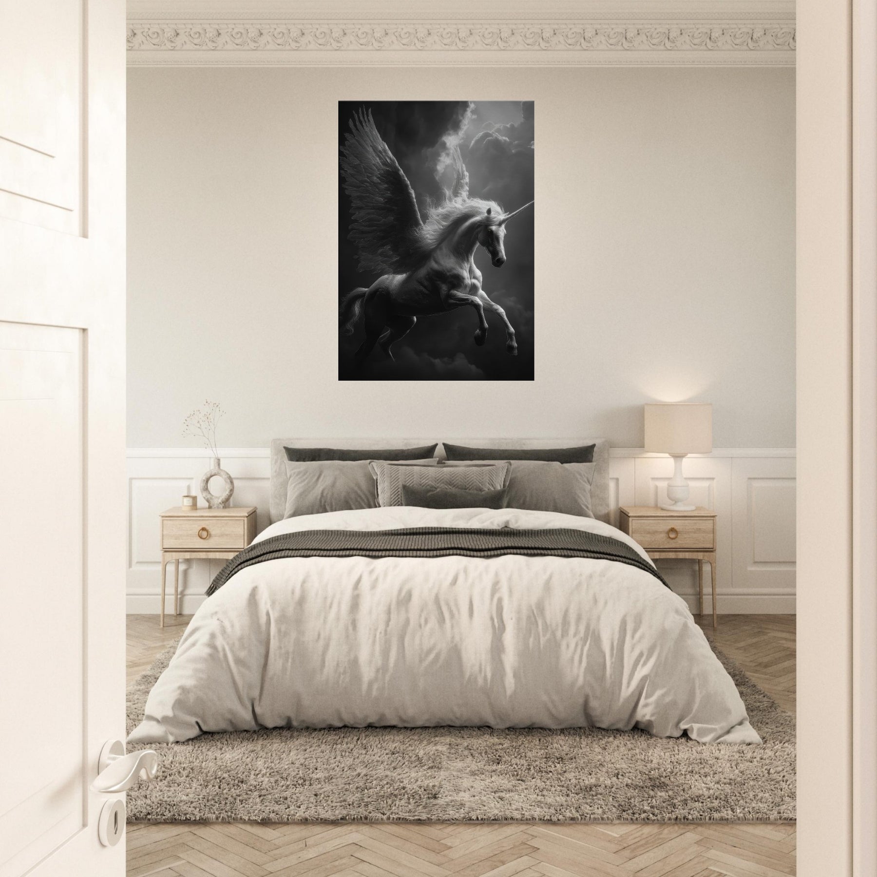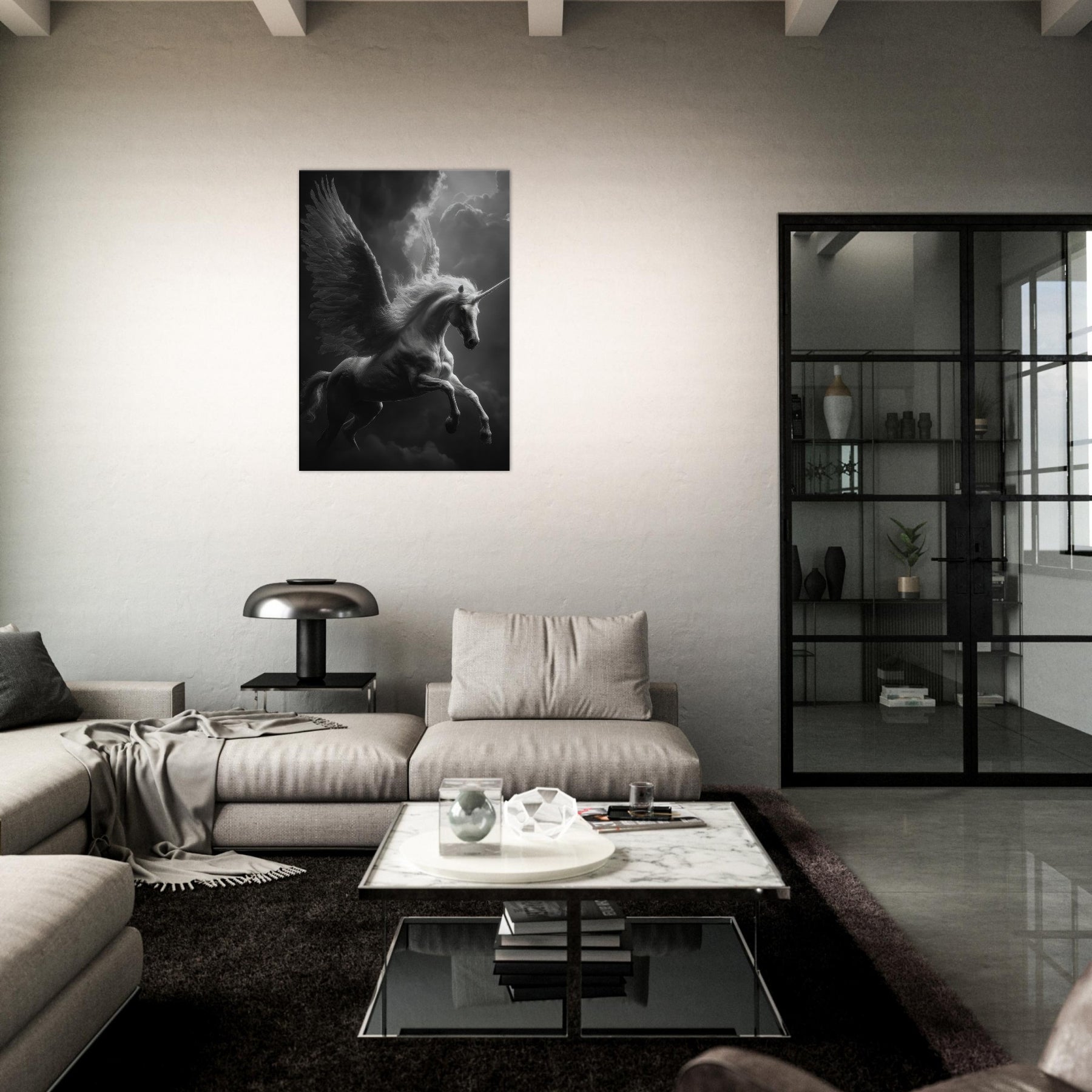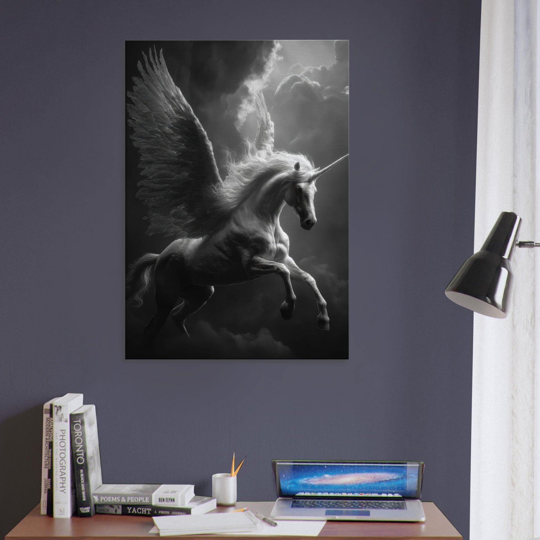 A lone Celestial Pegasus glides through the clouds in a hush of black and white light, a study in motion and stillness. This sculpture like print invites the room to breathe shadows curling around its hooves, wings unfurled in a whisper of feathered wind. The monochrome drama lends timeless elegance to a living room or study, pairing modern decor with mythic wonder. Hang it where morning sun or lantern glow can catch the gloss of its mane and the quiet strength of its flight, transforming walls into a celestial stage. The central subject is Celestial Pegasus flying through clouds.