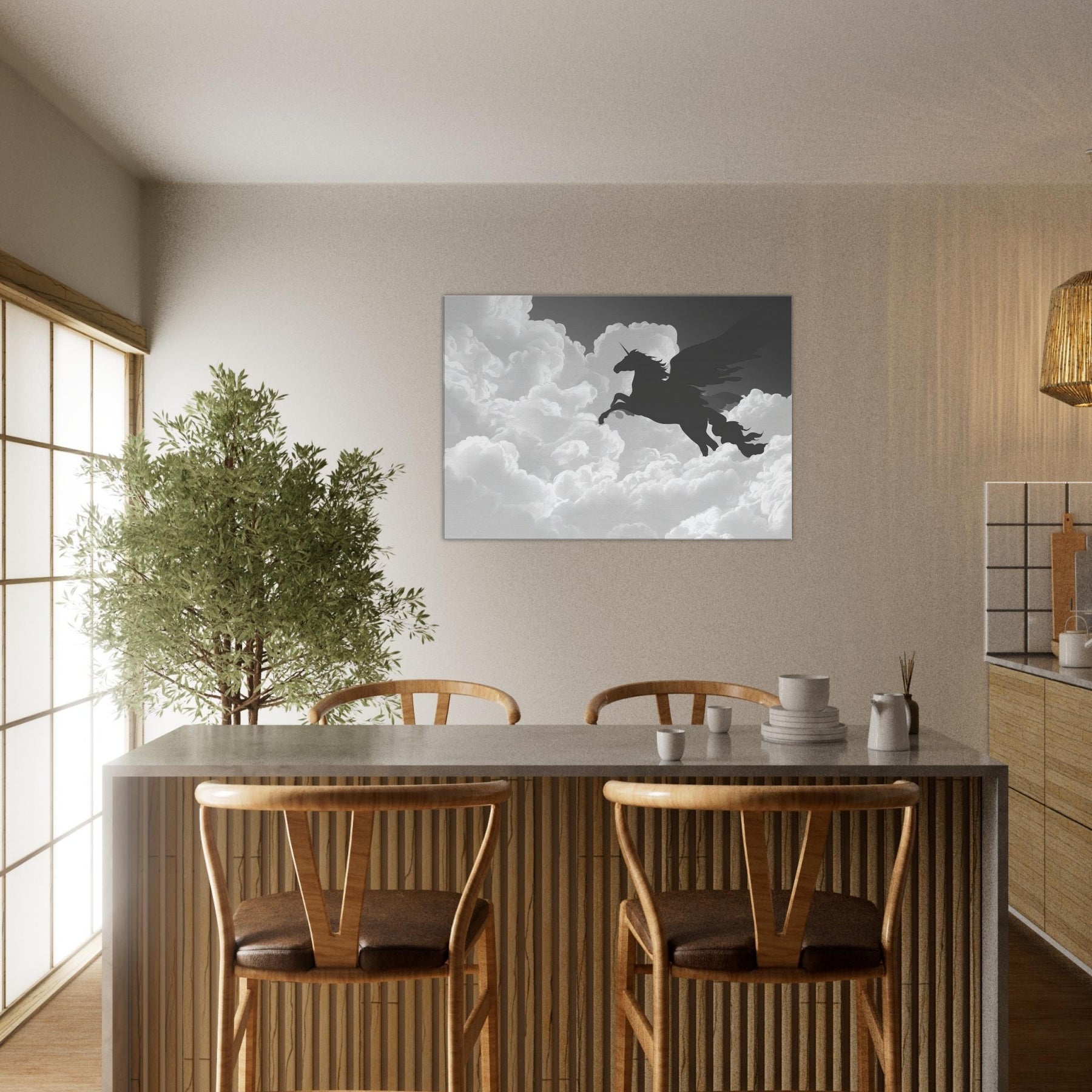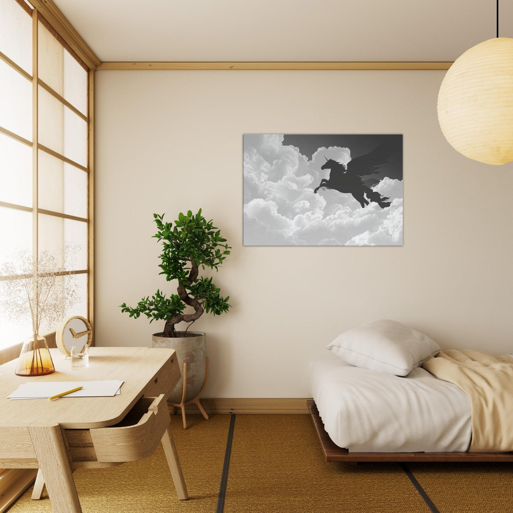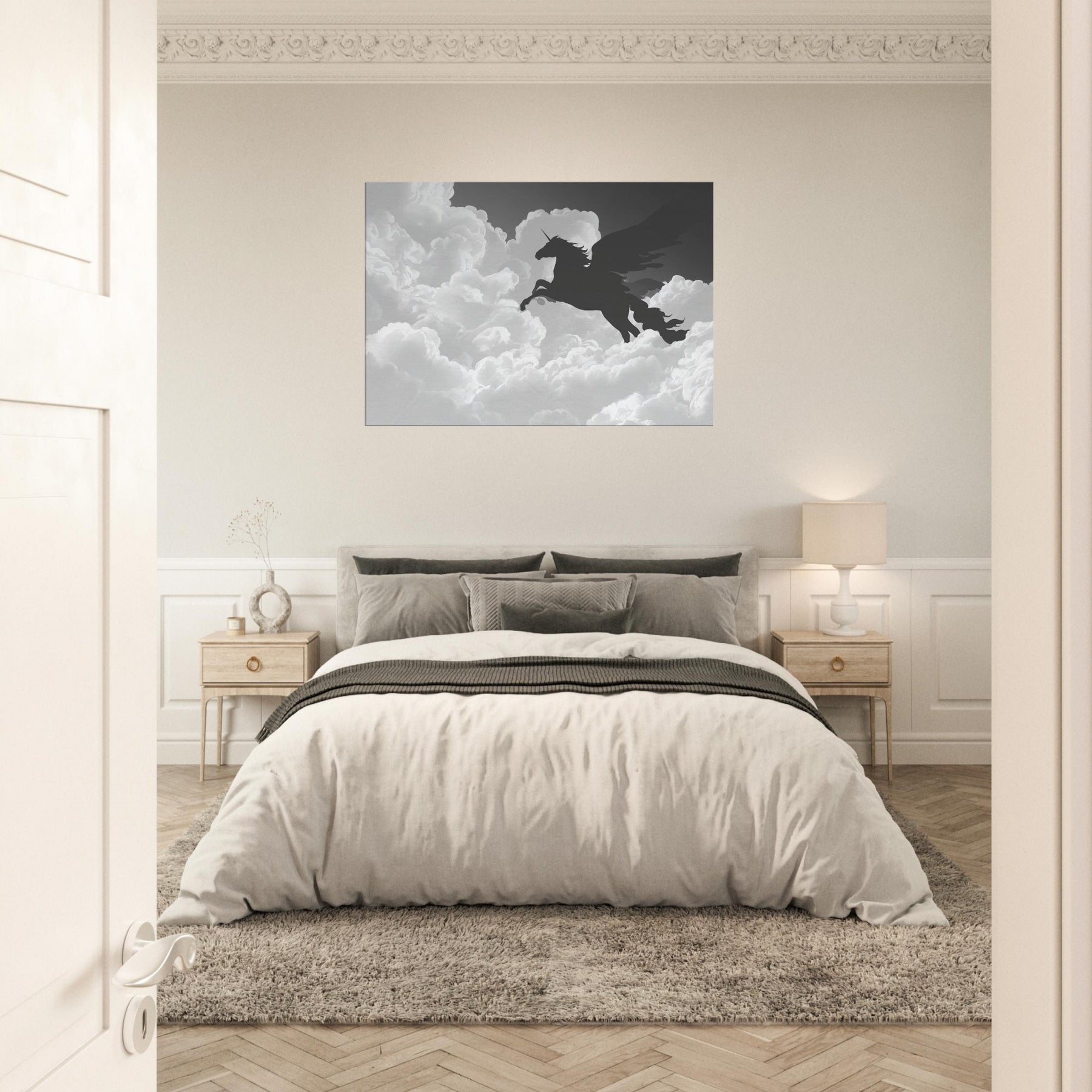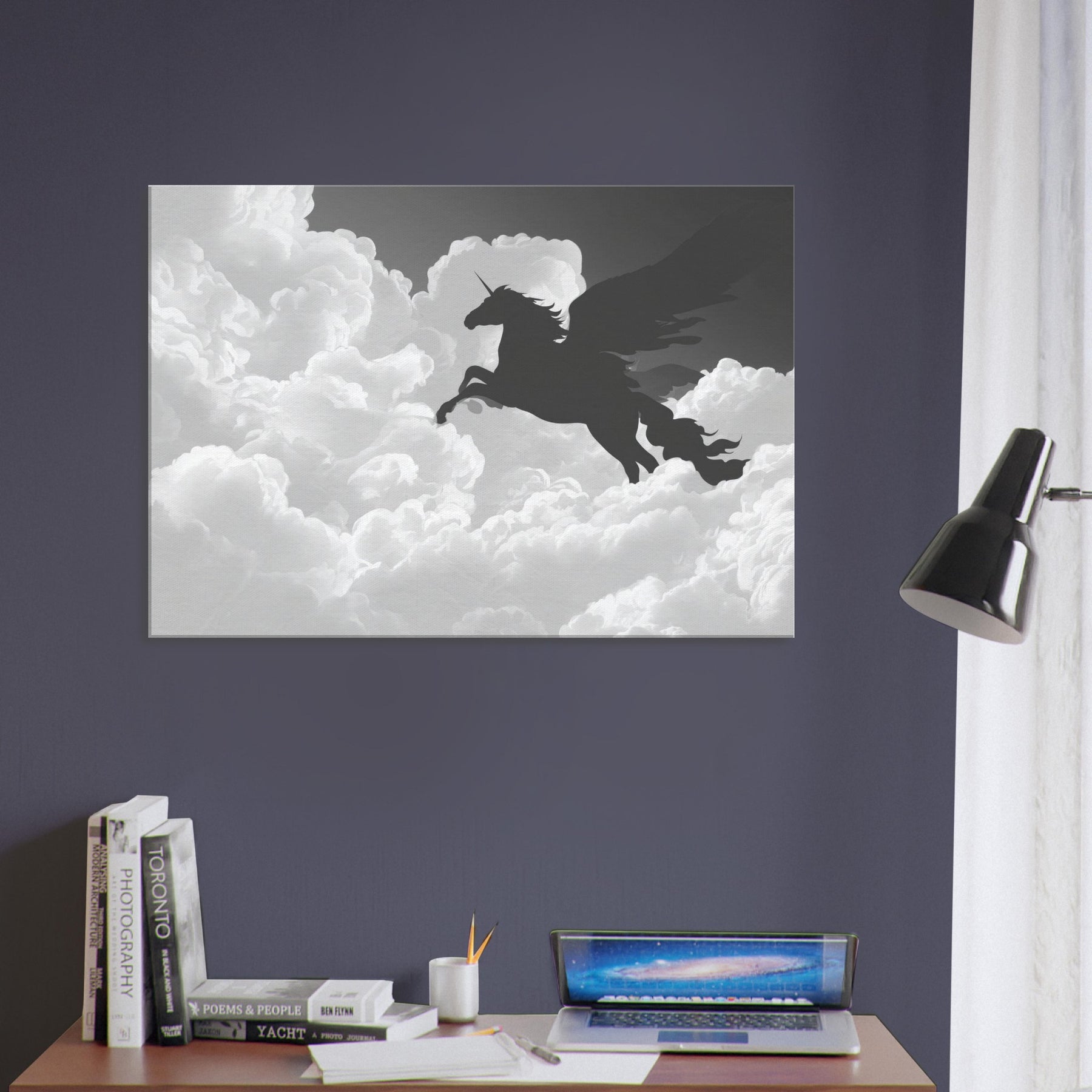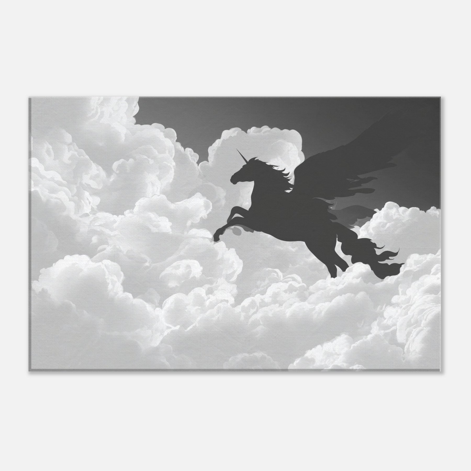 Let the celestial silhouette of Celestial Pegasus Flying Through Clouds drift across your wall, a graceful line art apparition that invites quiet wonder. Its fluid, unbroken contours carve space with breath and light, turning any room into a skyward sanctuary. In cool grayscale, the piece guides the eye and soothes the senses, adding ethereal drama to living rooms or bedrooms. Hang it where daily rituals meet imagination, and watch the mood lift with every soft, mythical glance.
