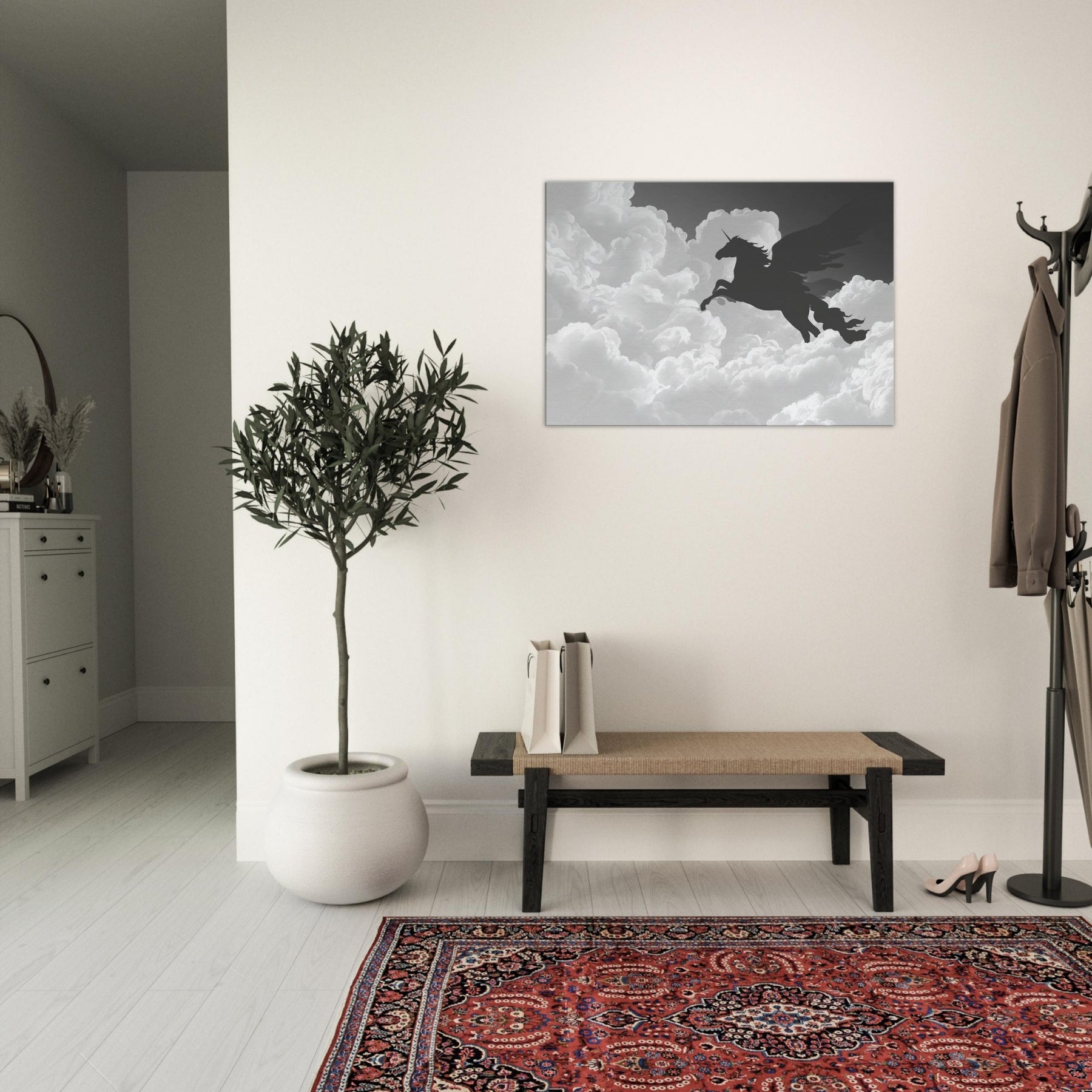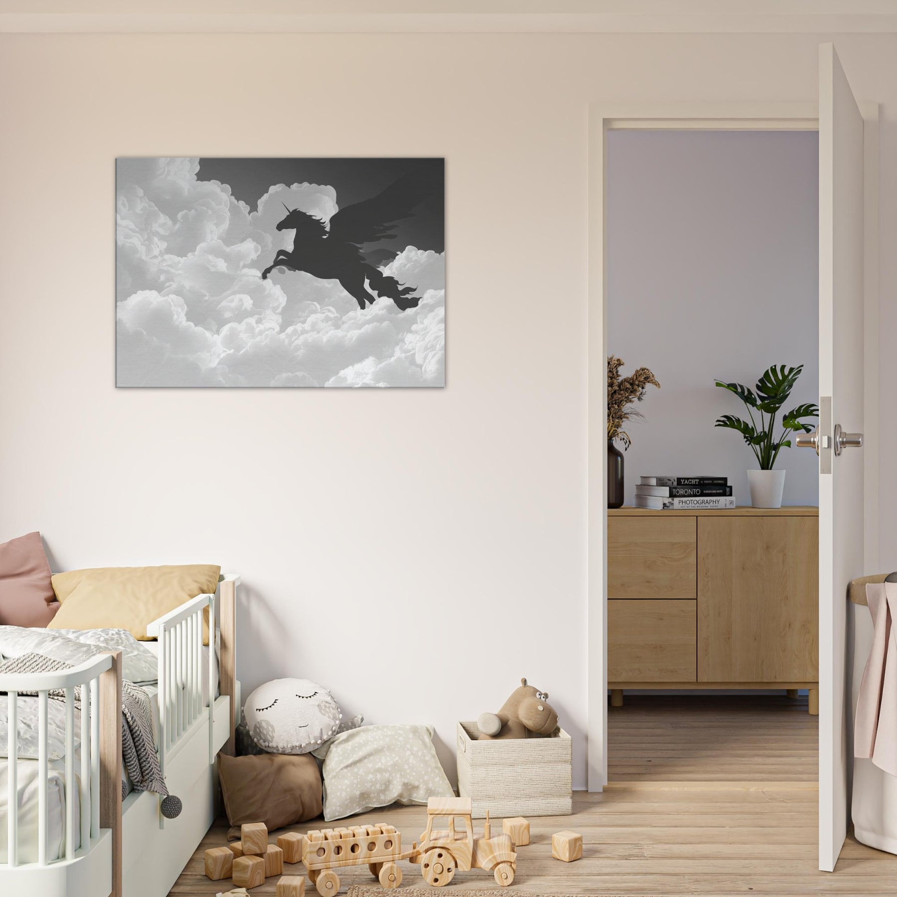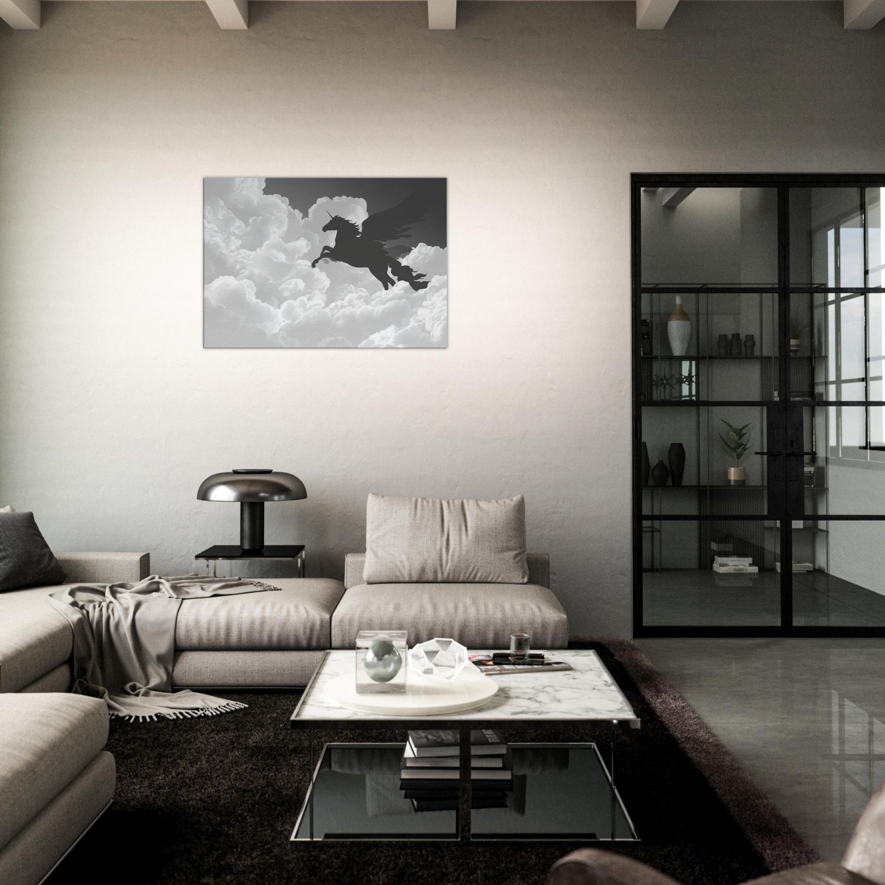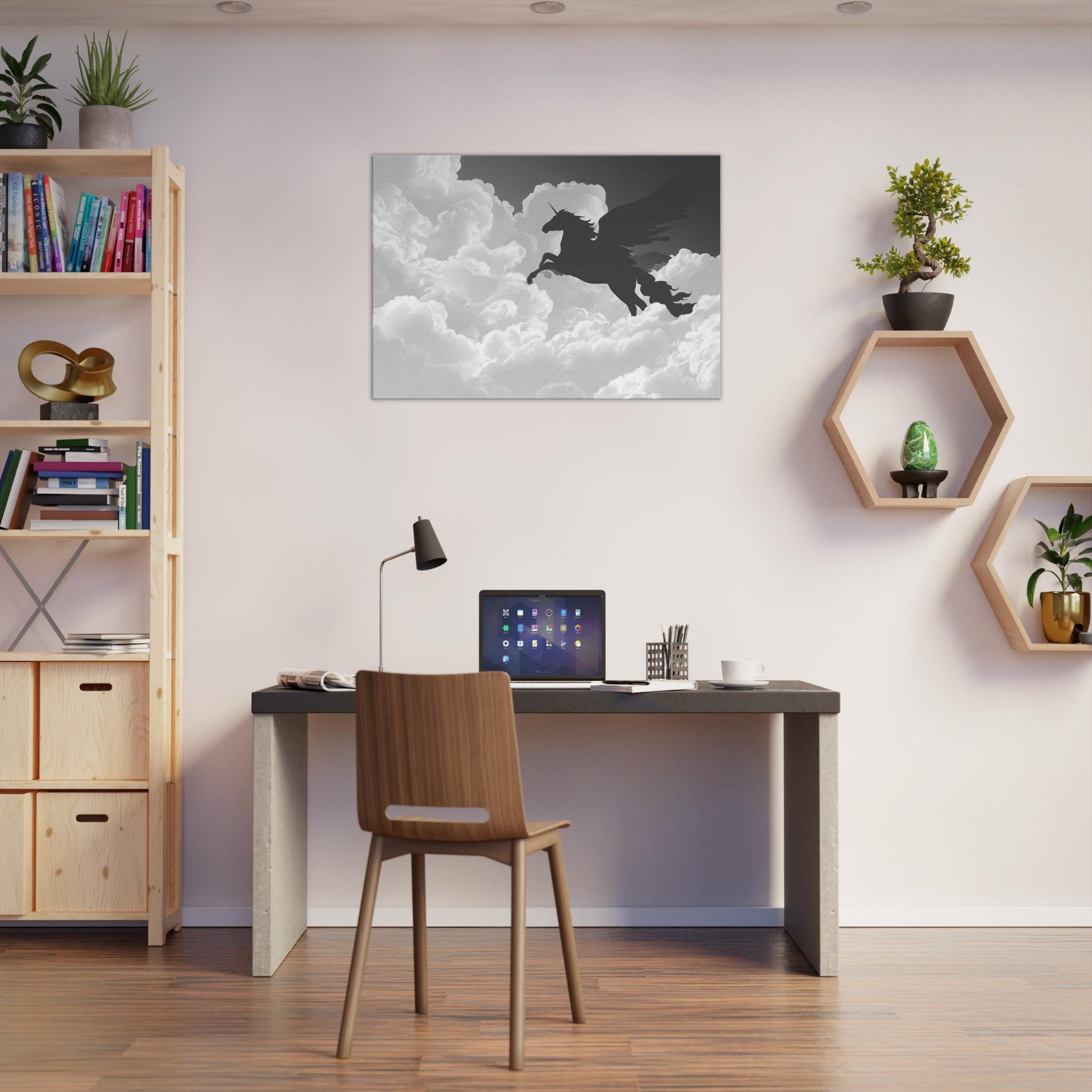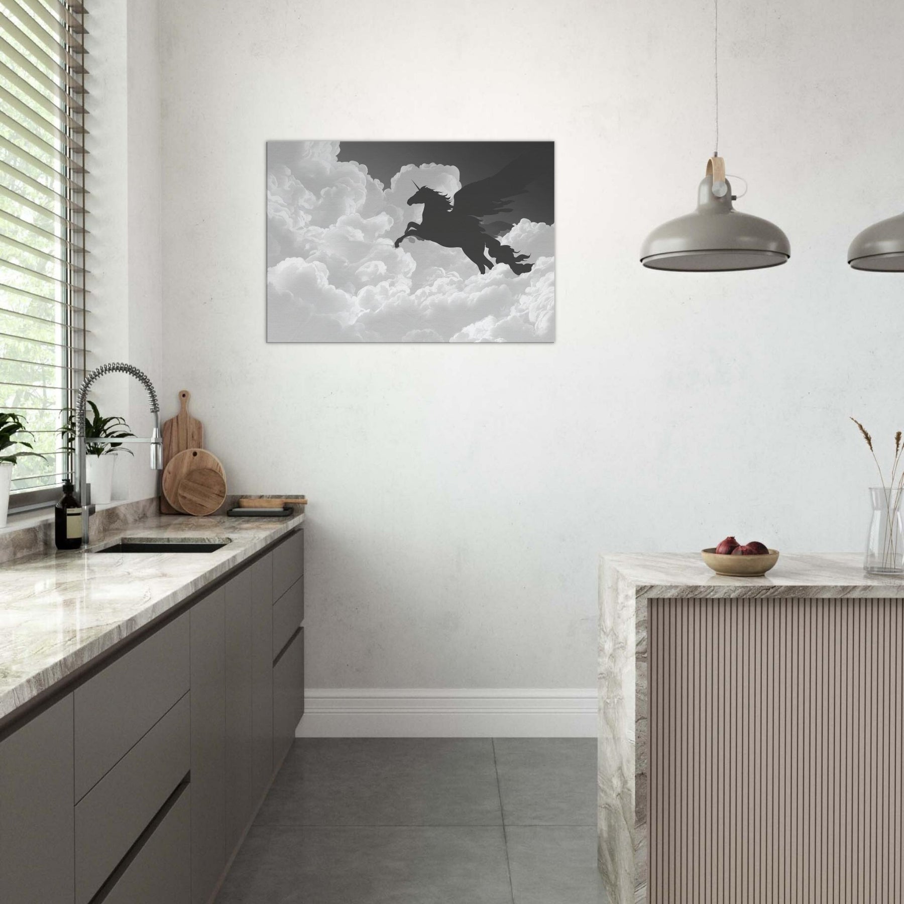 Let the celestial silhouette of Celestial Pegasus Flying Through Clouds drift across your wall, a graceful line art apparition that invites quiet wonder. Its fluid, unbroken contours carve space with breath and light, turning any room into a skyward sanctuary. In cool grayscale, the piece guides the eye and soothes the senses, adding ethereal drama to living rooms or bedrooms. Hang it where daily rituals meet imagination, and watch the mood lift with every soft, mythical glance.