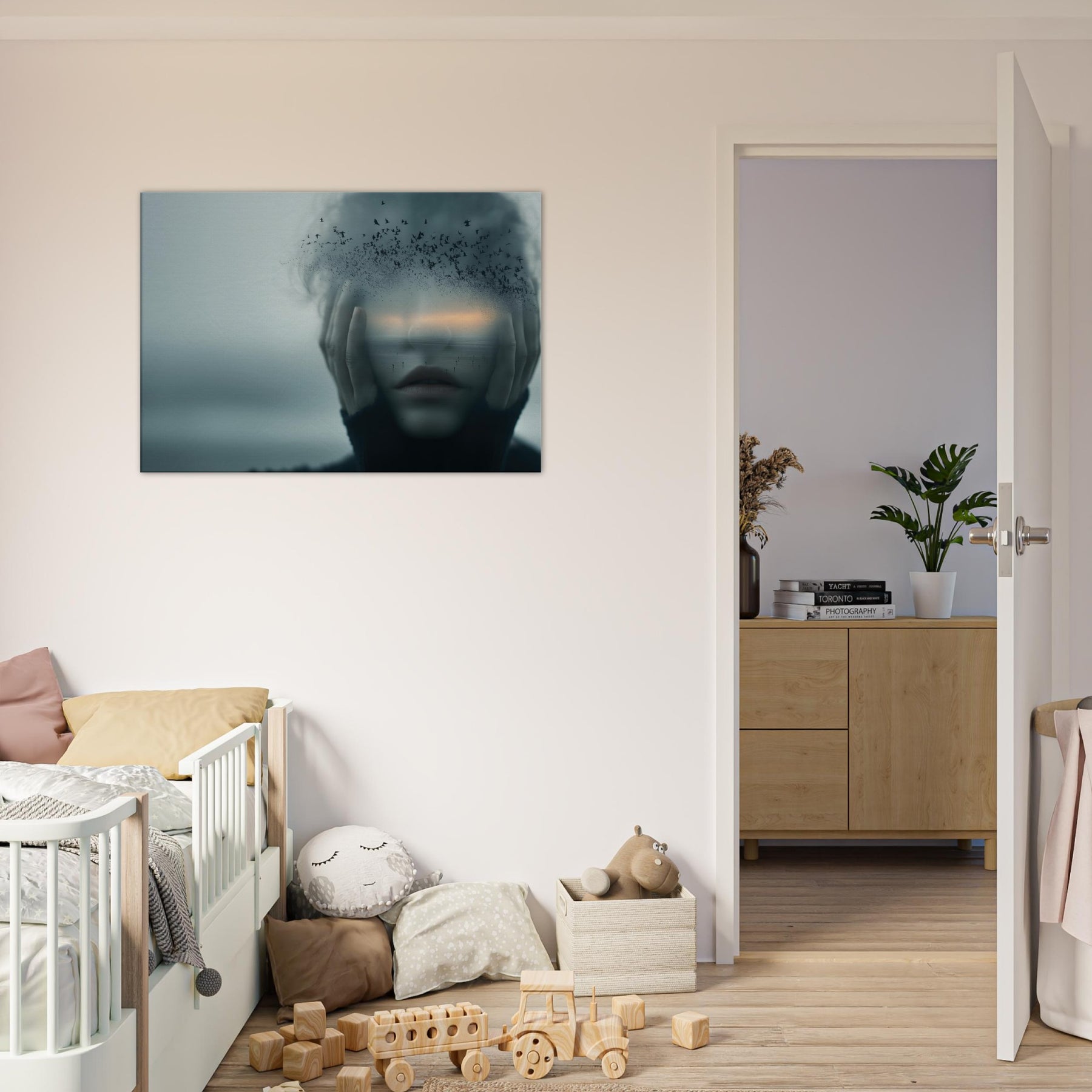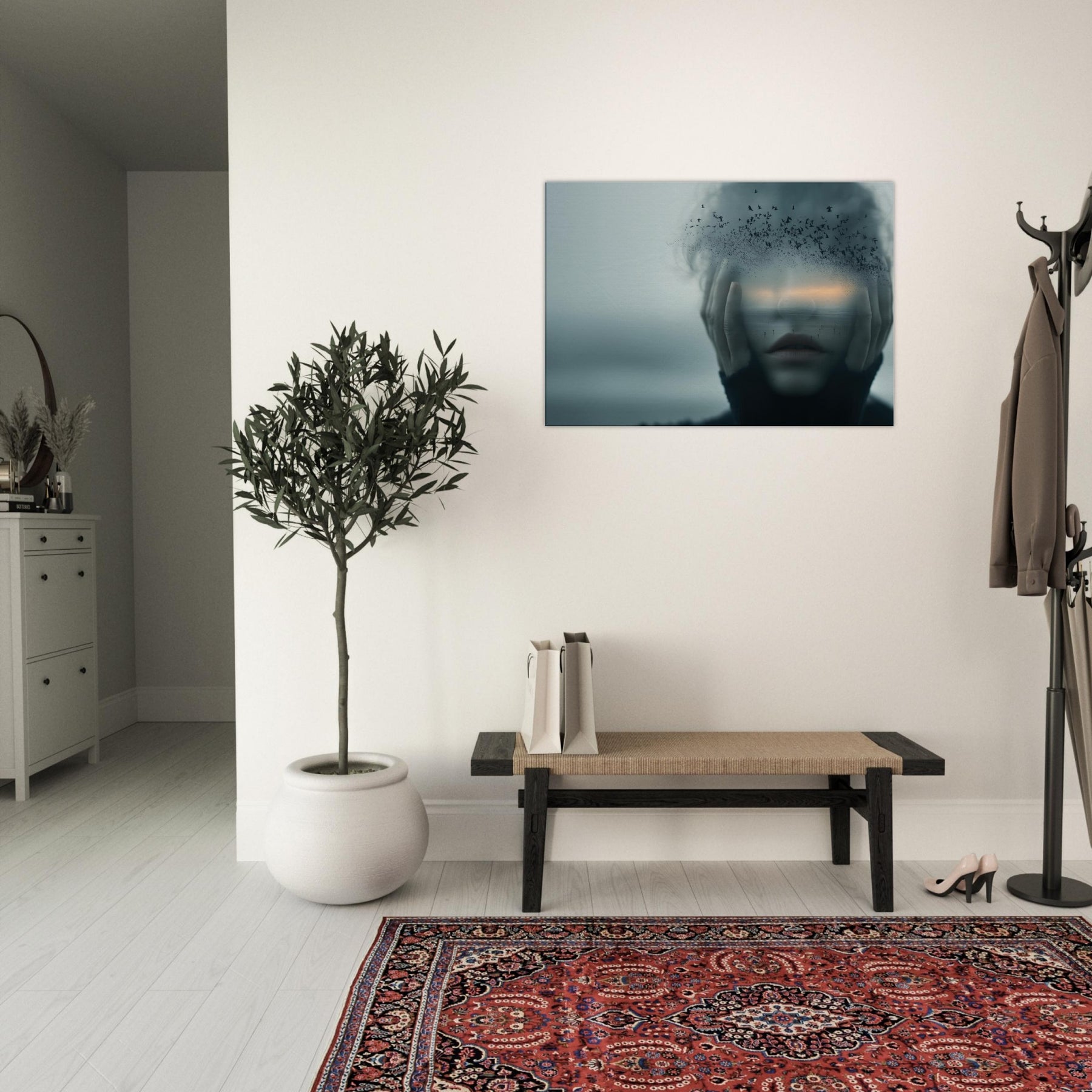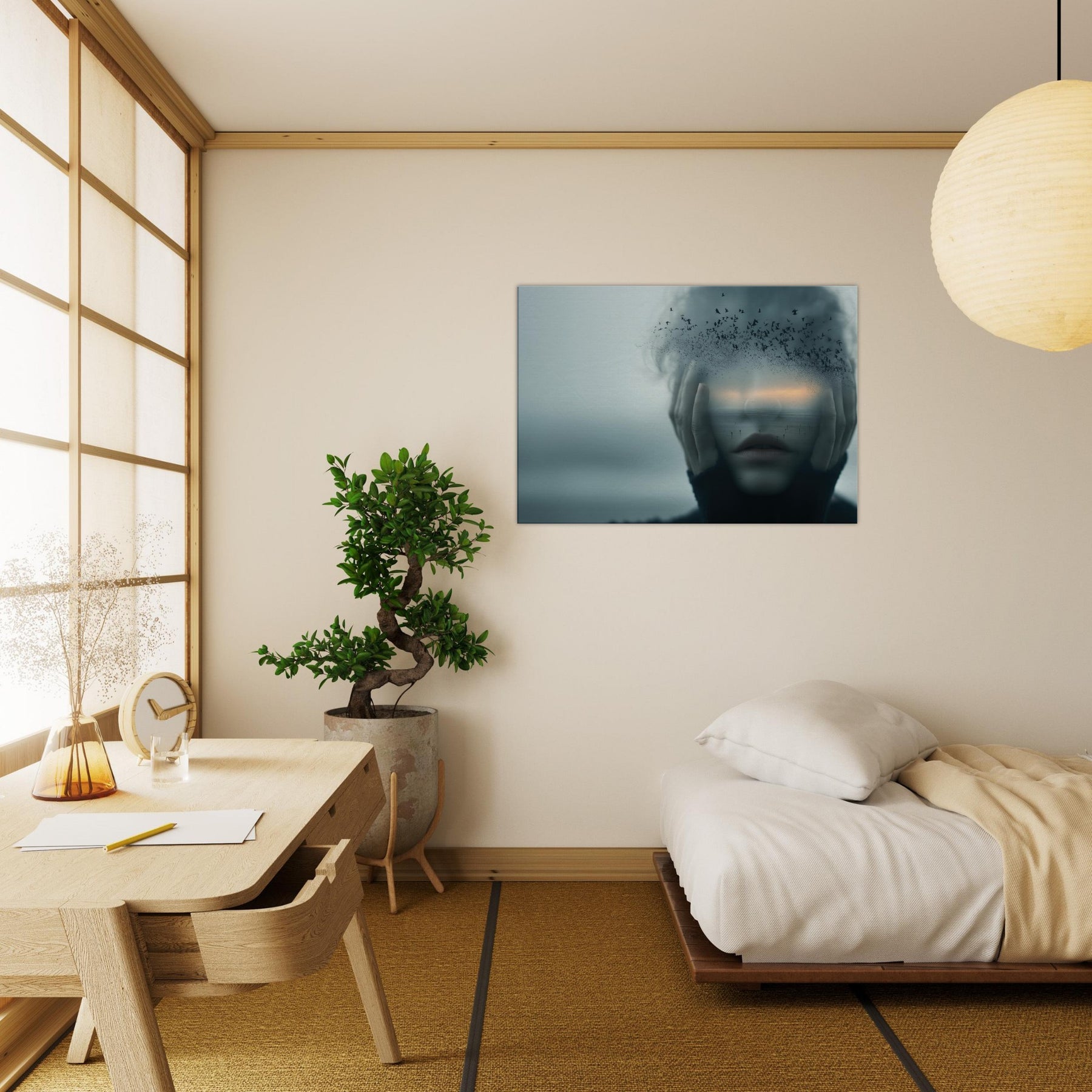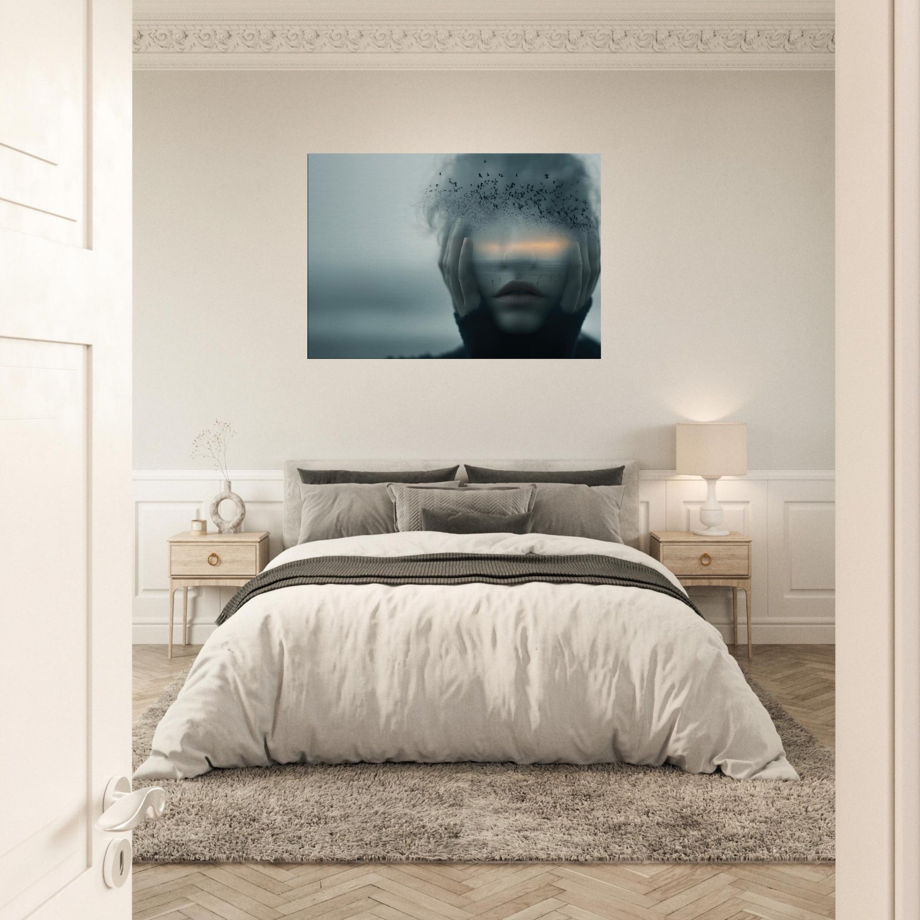 This piece anchors in Hands Line Art, where the human form dissolves into delicate contours and a flock of birds cascades across the mind's horizon. Surreal tones of sea and vaporize the boundary between body and dream, inviting a quiet, intimate contemplation. The soft gradient blues and a hint of sunset glow create a serene atmosphere that enlarges any living space, turning a wall into a portal for memory, imagination, and subtle conversation.