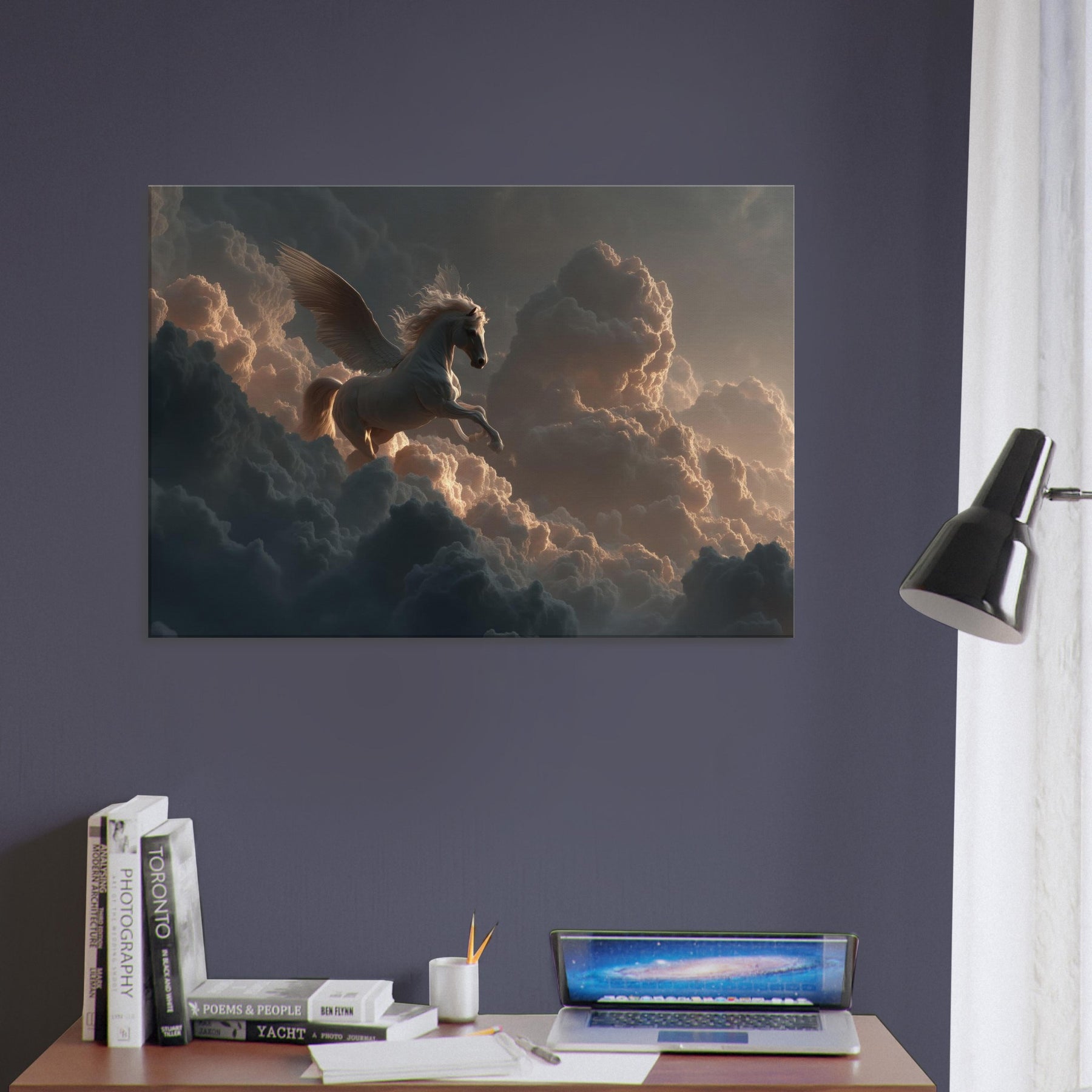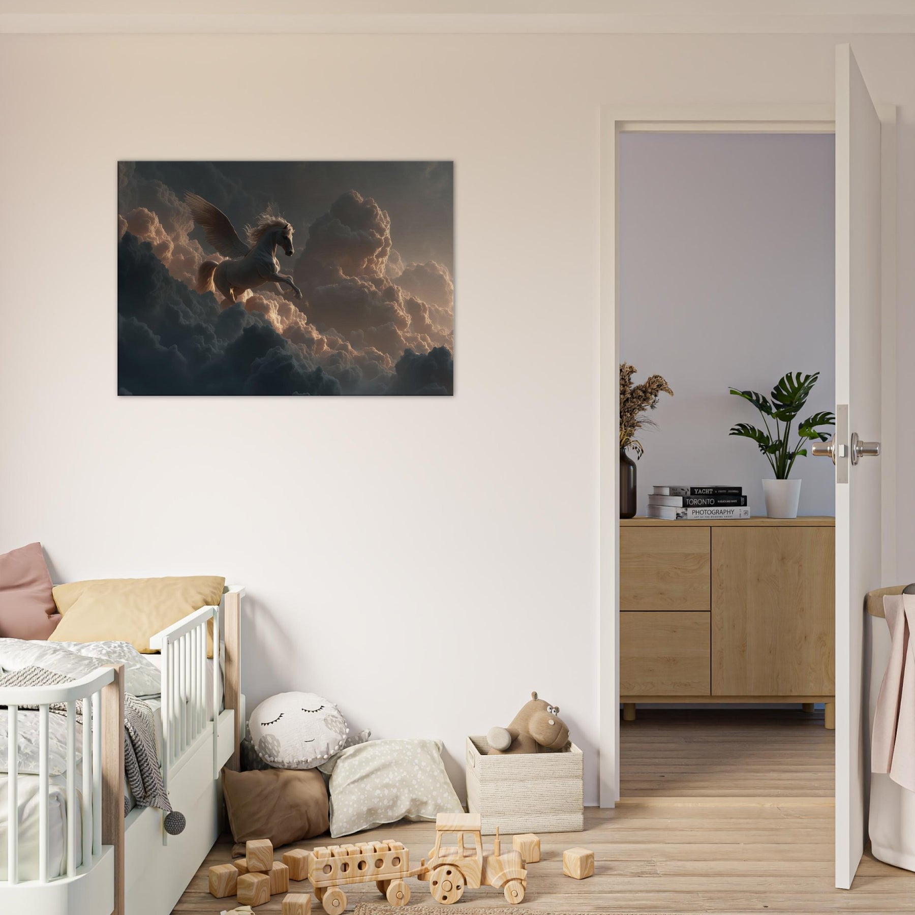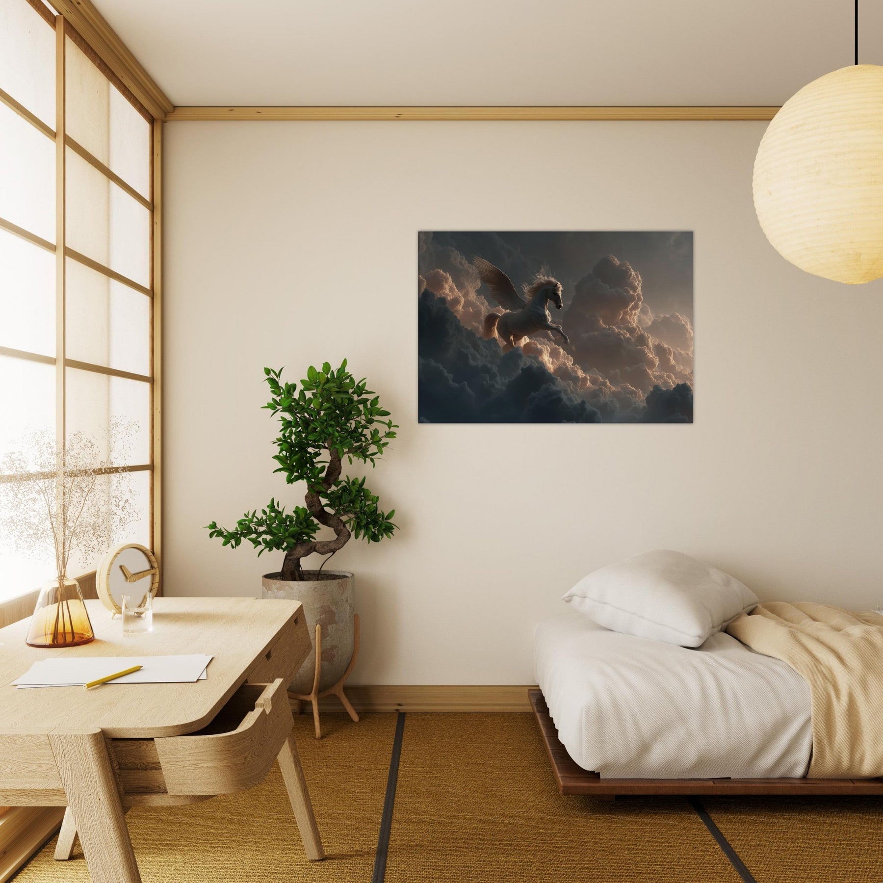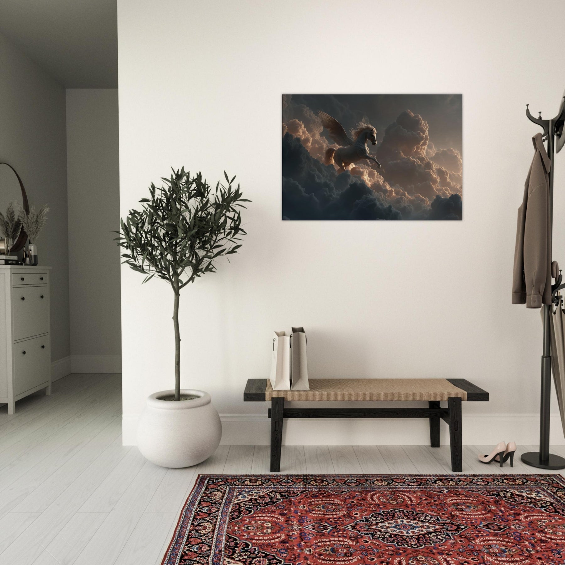 Immerse your space in a dreamlike orbit where the Celestial Pegasus Flying Through Clouds glides above luminous, cloud pulled ripples. Painted in surreal, cinematic light, this wall art invites soft, ambient hues to halo your living room with wonder. The Pegasus’ wings catch the ether, casting gentle shadows that drift across walls and surfaces, while the airy composition enhances height and calm. Perfect for bedrooms, lounges, or study nooks, it elevates mood, sparks imagination, and makes everyday moments feel like a scene from a mythic sky.
