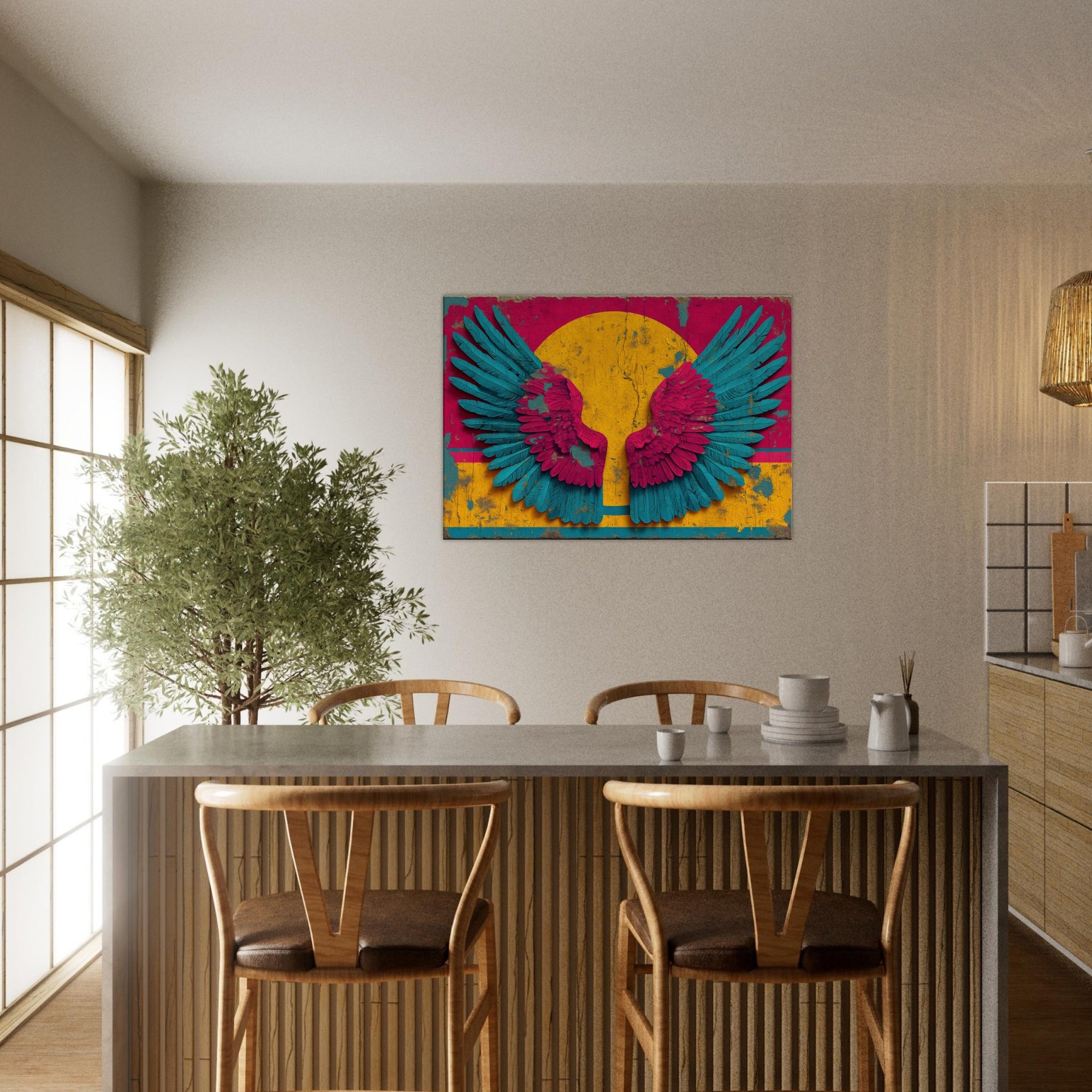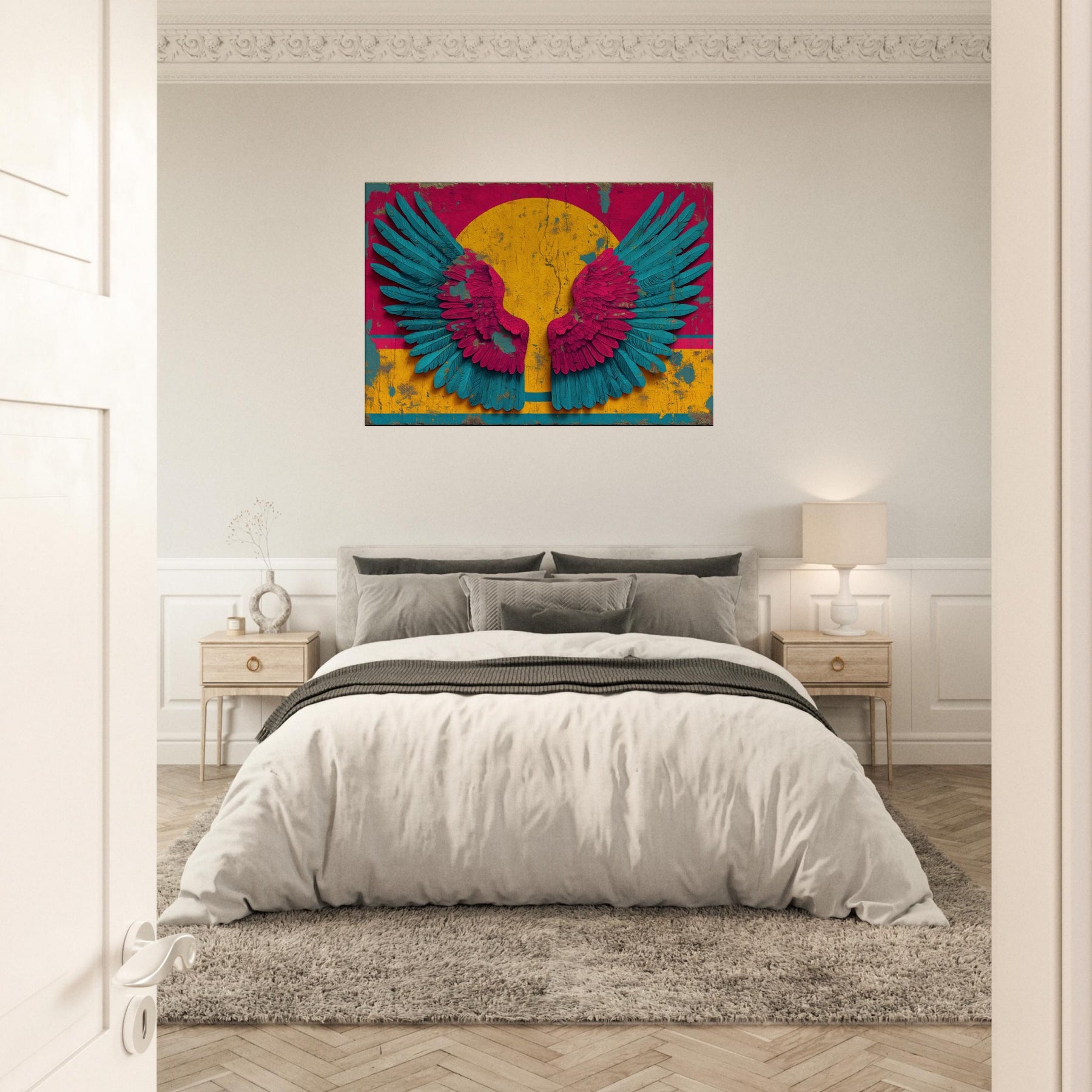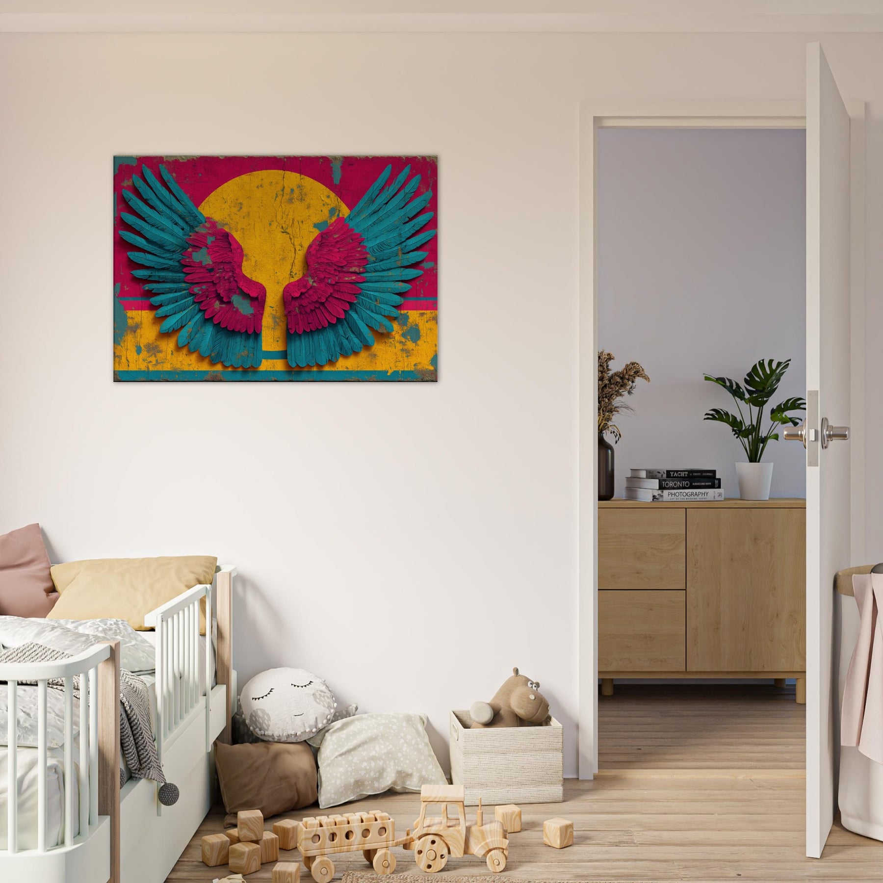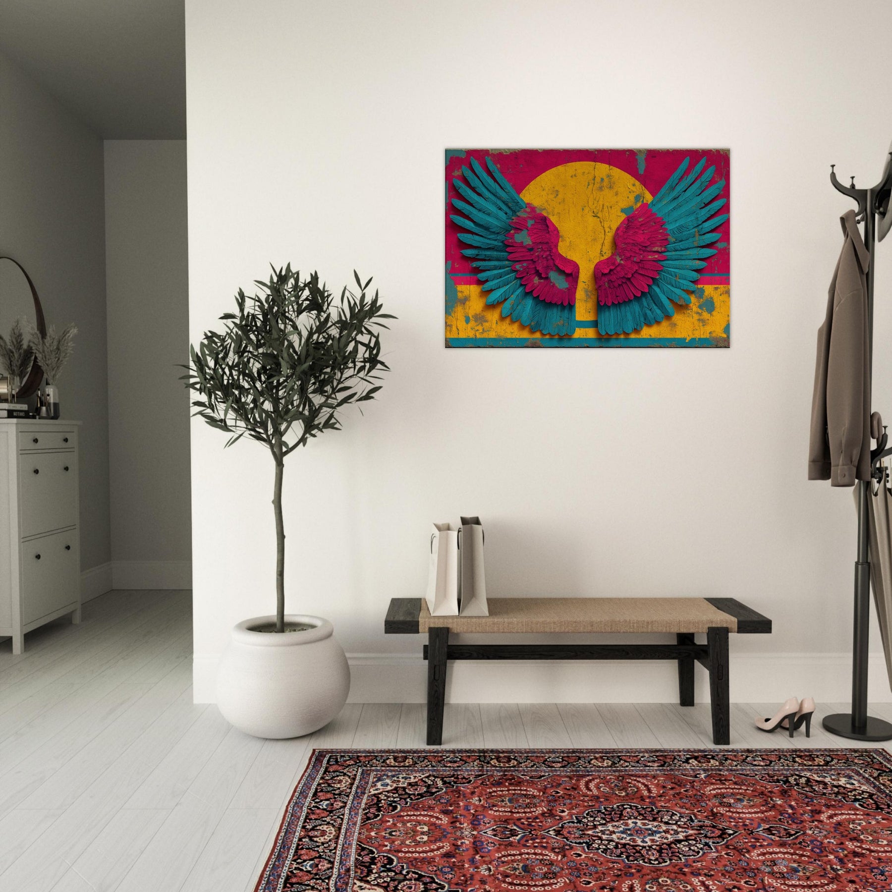 A celestial echo rises from this striking wall sculpture: the Cherub (Wings Only) rendered as a bold, sculptural motif. Vibrant magenta and teal wings unfold across a sun washed, weathered backdrop, inviting light to ripple through a room with mystic energy. The piece breathes a dreamy atmosphere, perfect for a living area or bedroom, creating a sense of airy drama, quiet wonder, and whimsical privacy. Its tactile texture and luminous color pairing keep the space feeling modern, intimate, and infinitely inviteable.