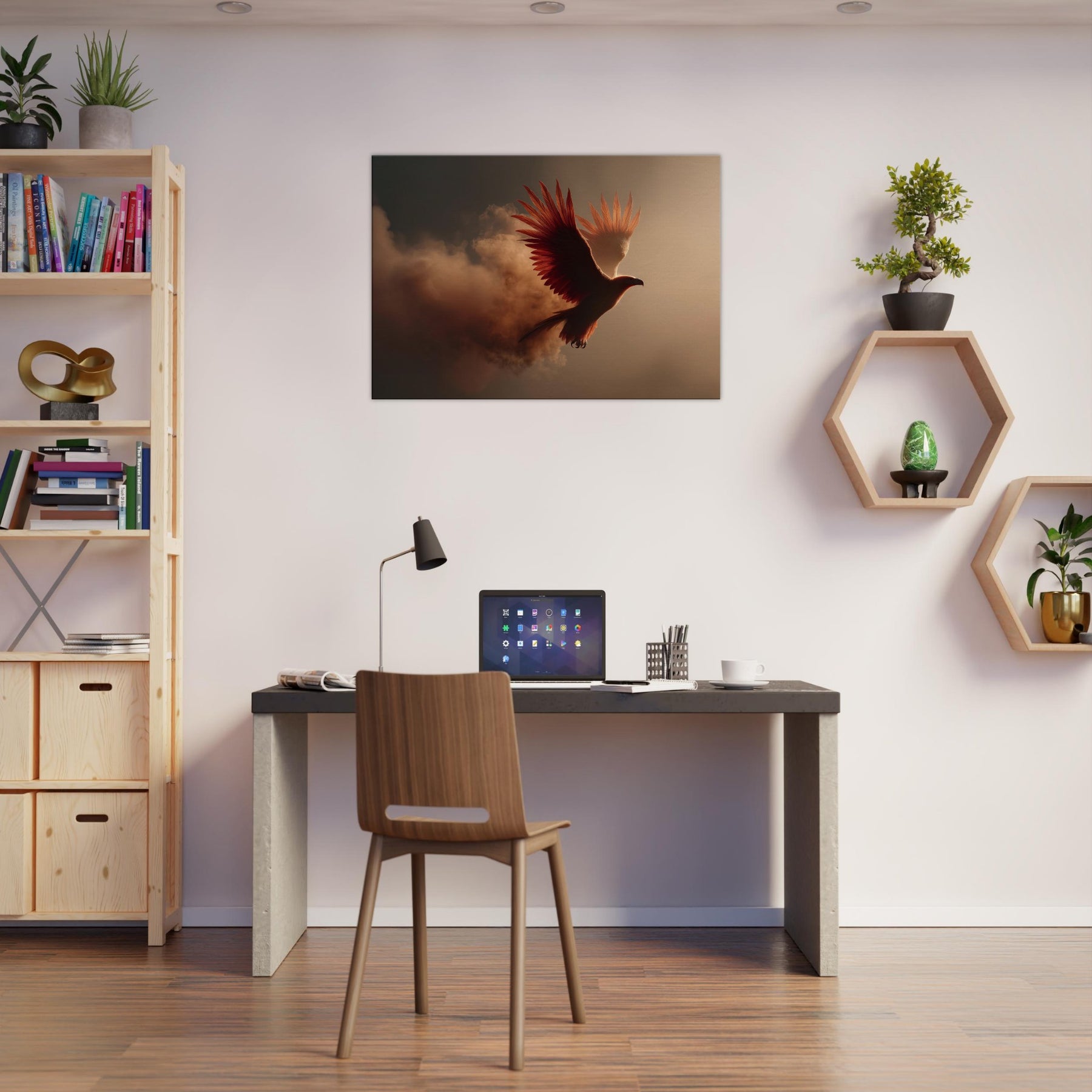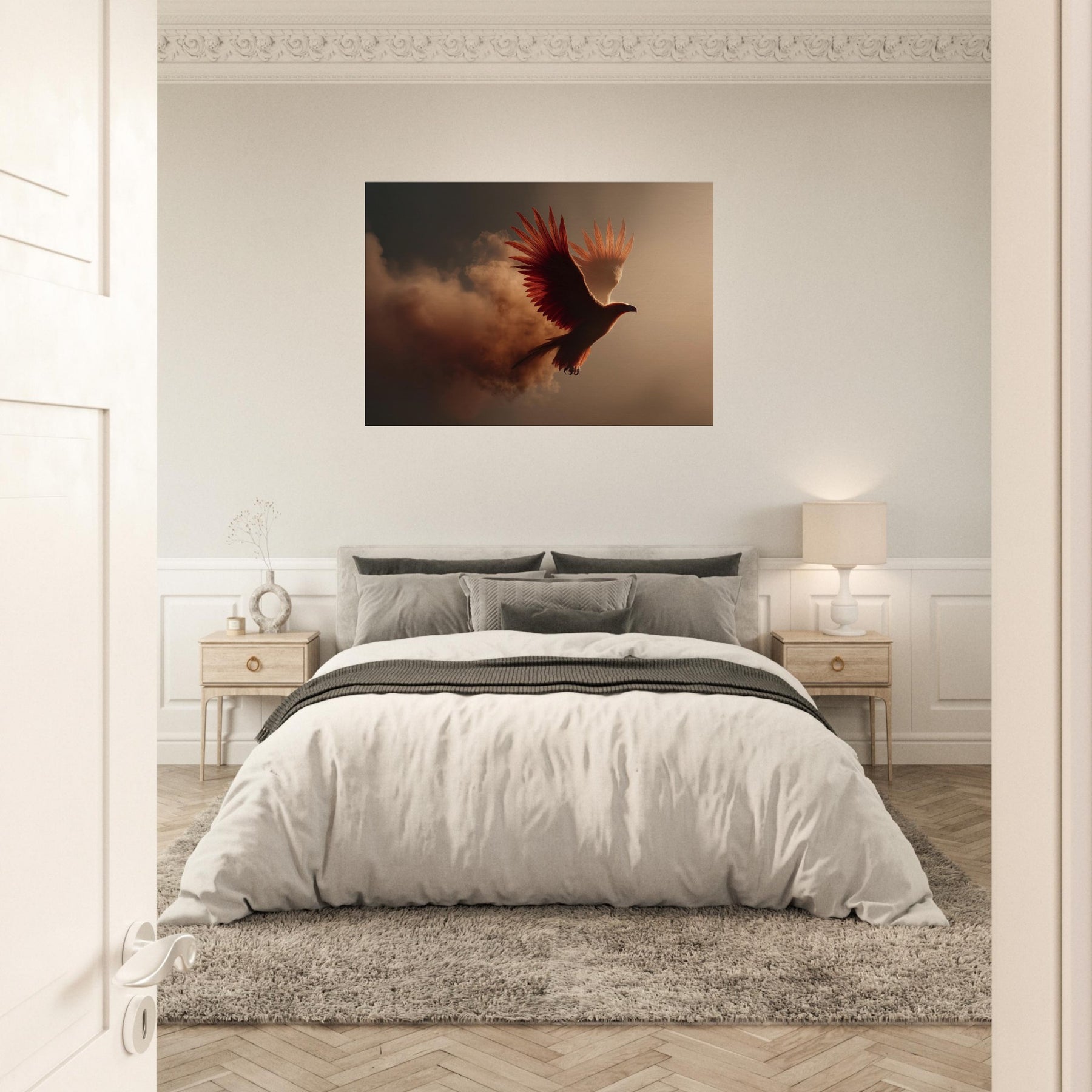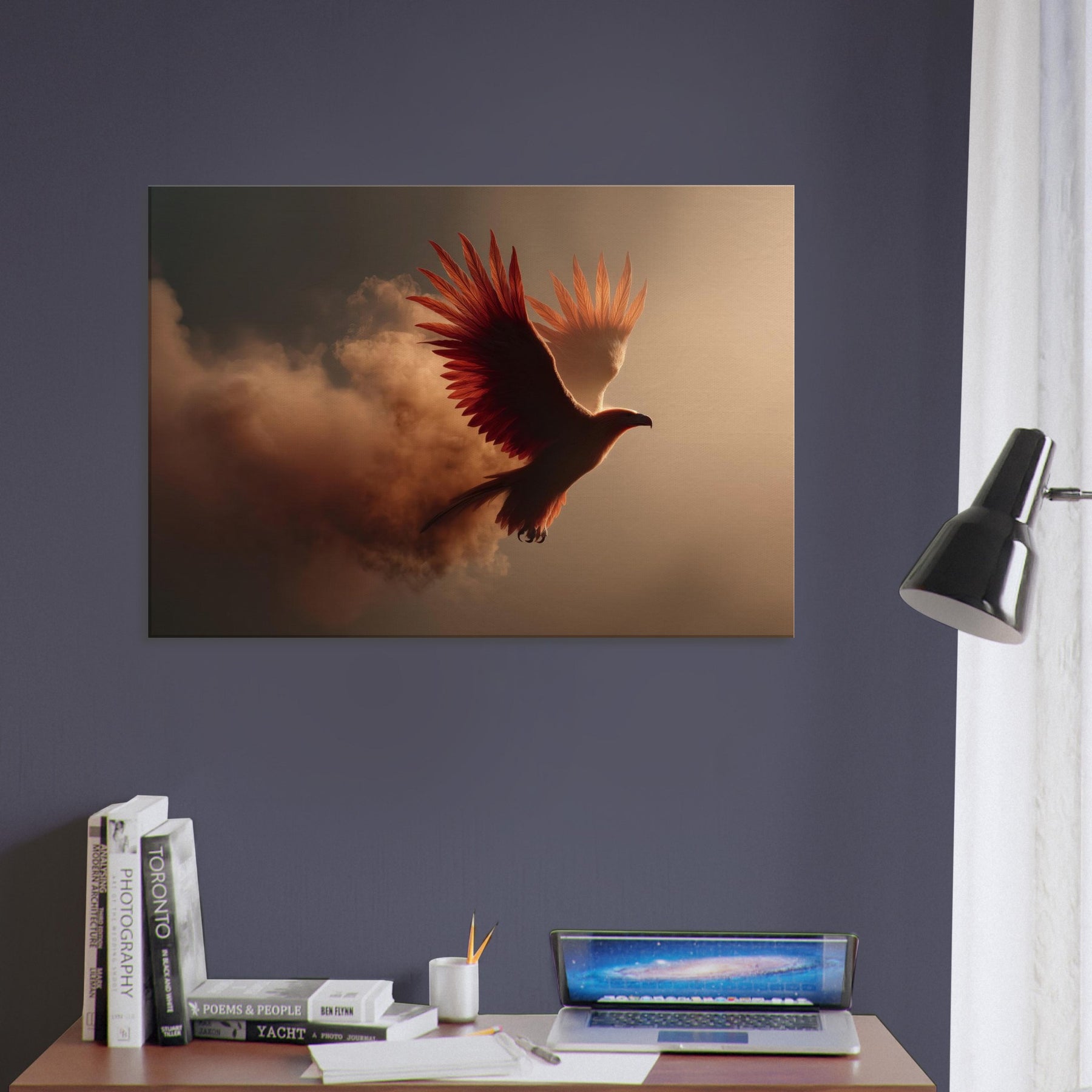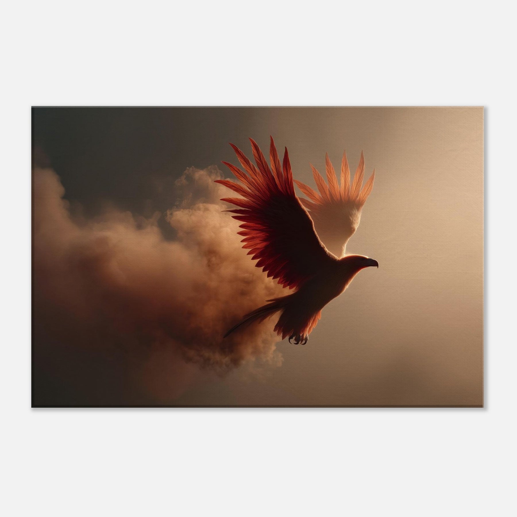 An ethereal flight of the Fiery Phoenix unfolds through a haze of molten light and wind swept clouds. The bird’s plumage blazes with copper, ember, and gold, catching the room’s every shadow and glow. Surreal beyond reason, yet emotionally intimate, this scene invites warmth, courage, and renewal into a living space. Hang it above a sofa or desk and let its radiant arc illuminate conversation, memory, and dreams. It’s a portal to myth made domestic, a constant reminder that light can rise from smoke.