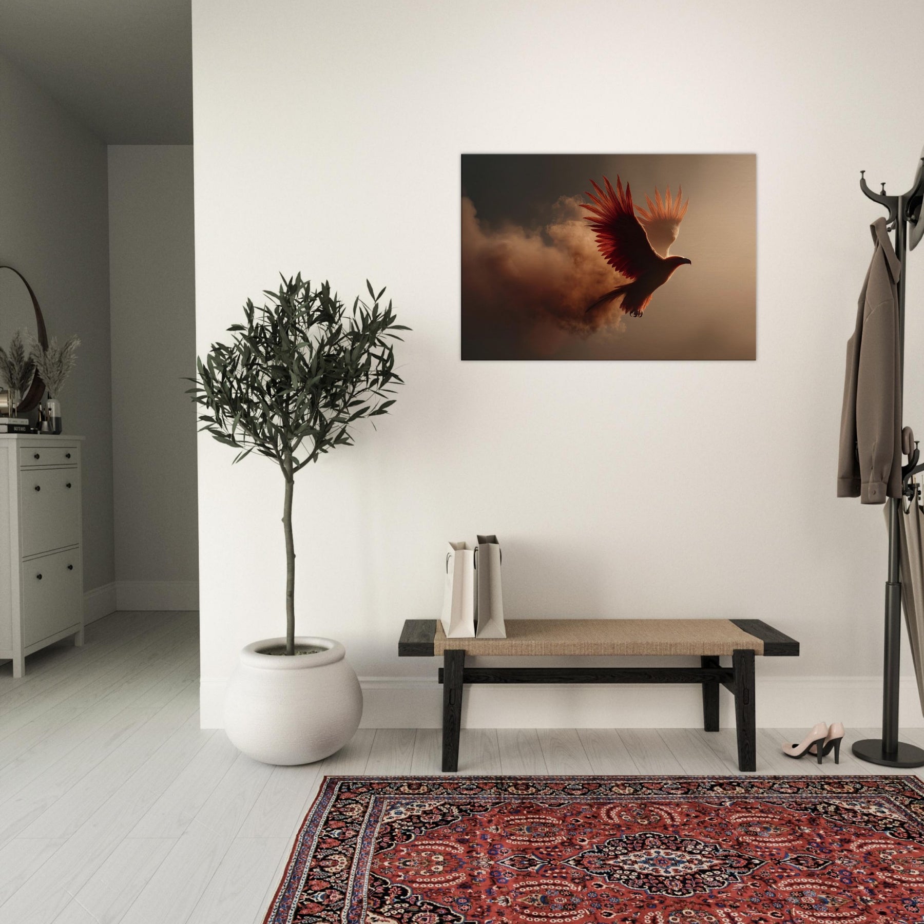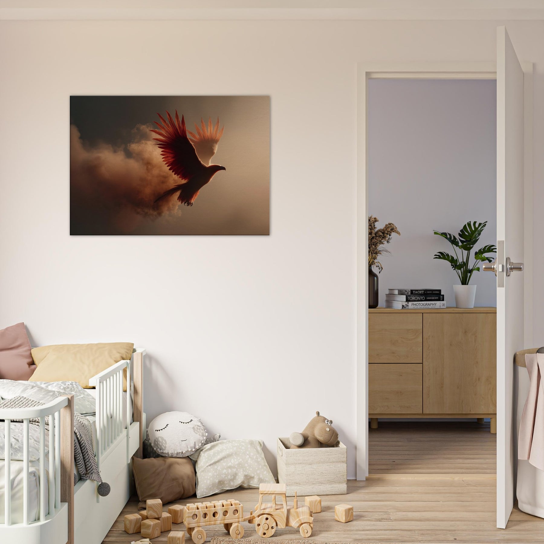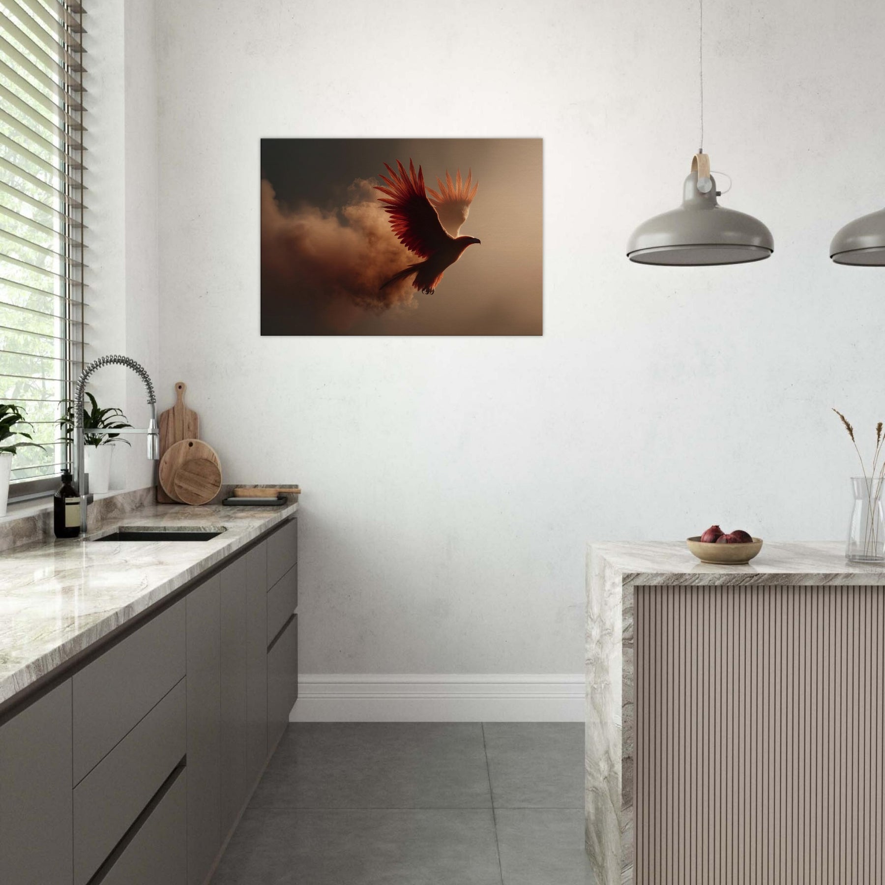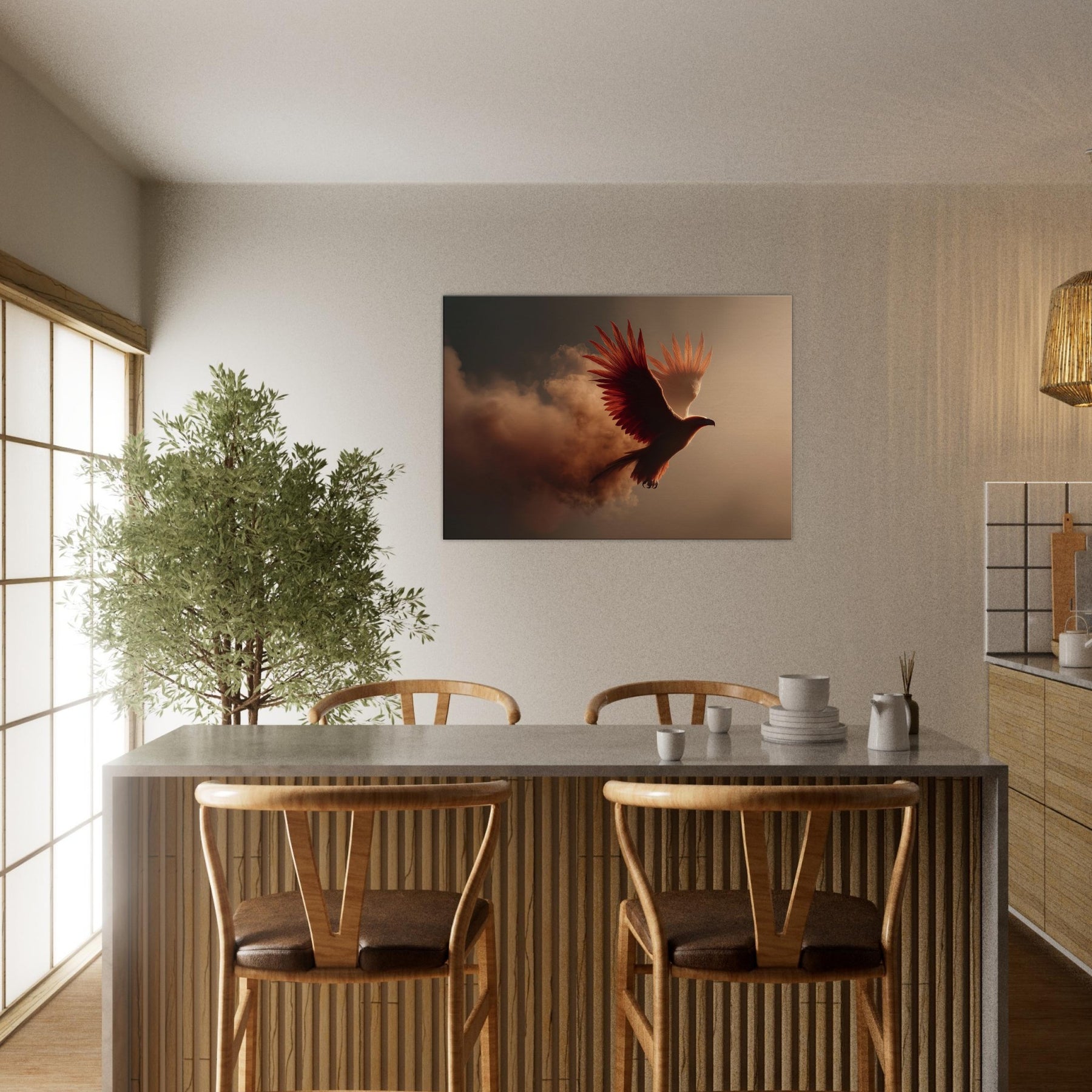 An ethereal flight of the Fiery Phoenix unfolds through a haze of molten light and wind swept clouds. The bird’s plumage blazes with copper, ember, and gold, catching the room’s every shadow and glow. Surreal beyond reason, yet emotionally intimate, this scene invites warmth, courage, and renewal into a living space. Hang it above a sofa or desk and let its radiant arc illuminate conversation, memory, and dreams. It’s a portal to myth made domestic, a constant reminder that light can rise from smoke.