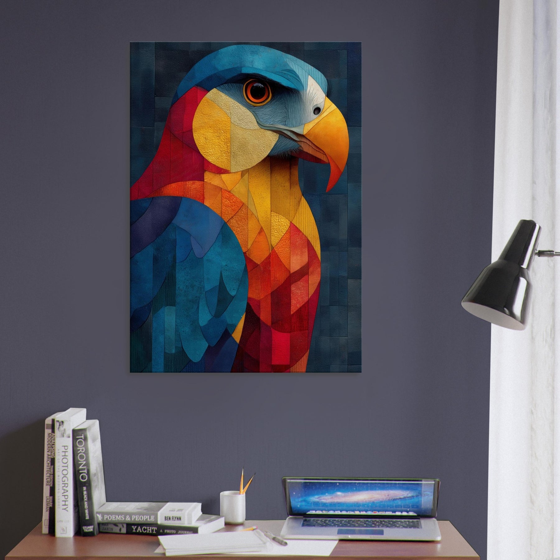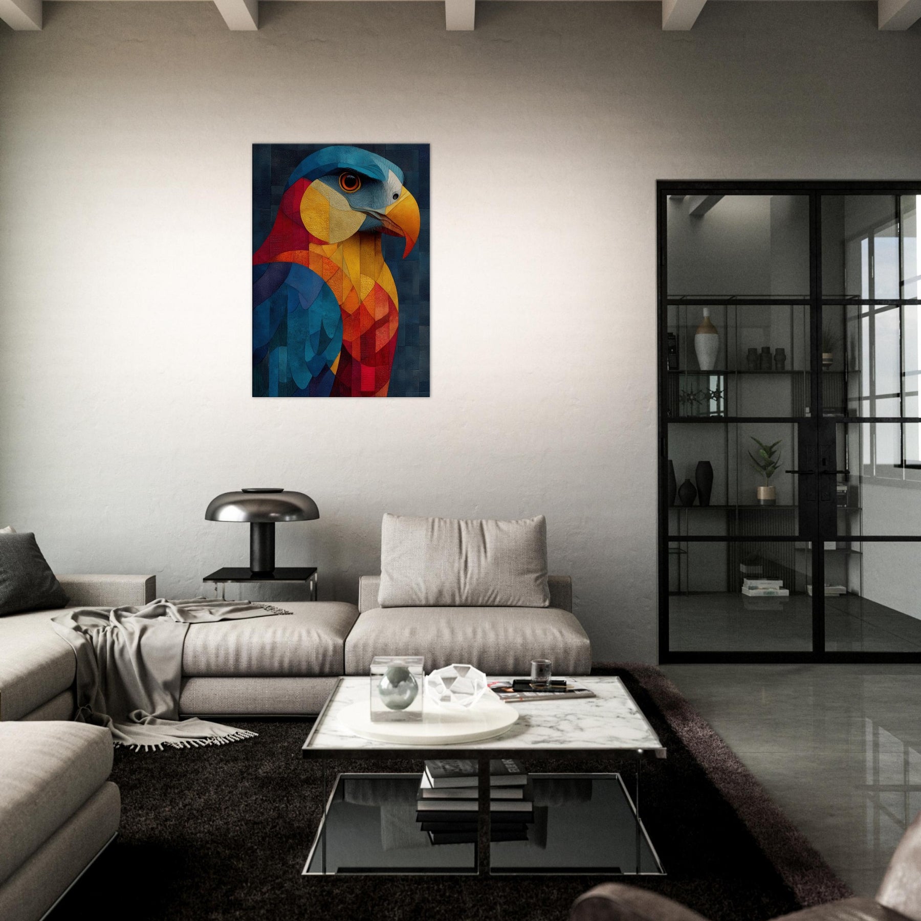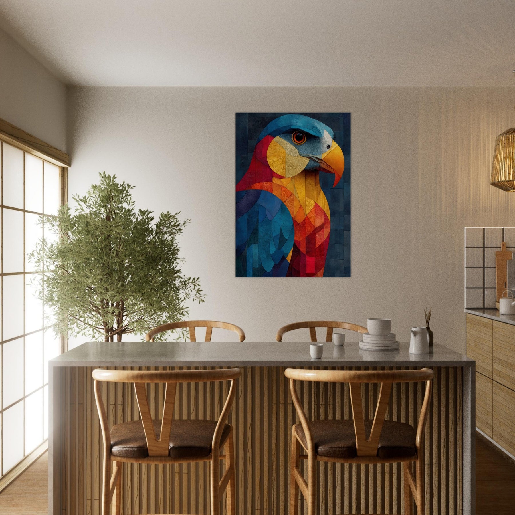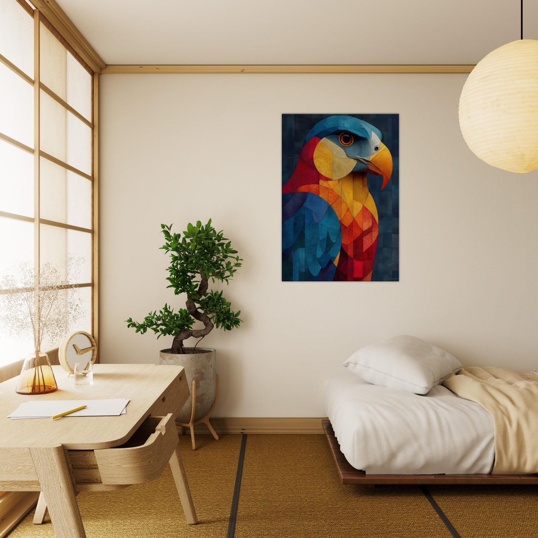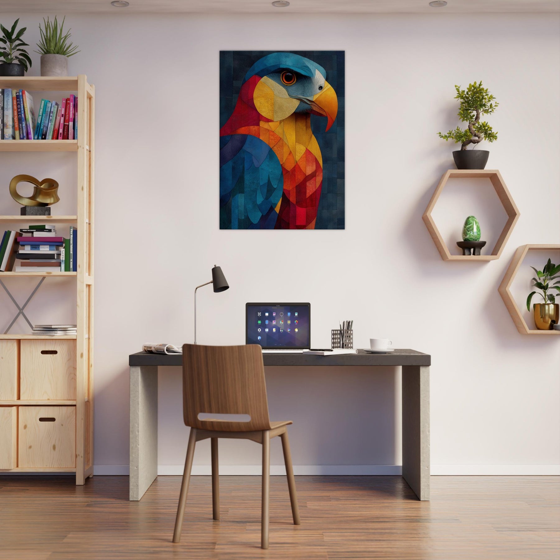 This abstract eagle soars across a field of color, its gaze both ancient and immediate. The mosaic of warm ochre, coral, and sapphire glows with kinetic energy, inviting the room to breathe in slow, bright electricity. The Primary Subject, the eagle, is rendered not as a single creature but as a sunlit constellation every shard of pigment catching the light, every curve suggesting motion and precision. Hung in a living room or study, it reframes space as a sanctuary of bold clarity and quiet strength.