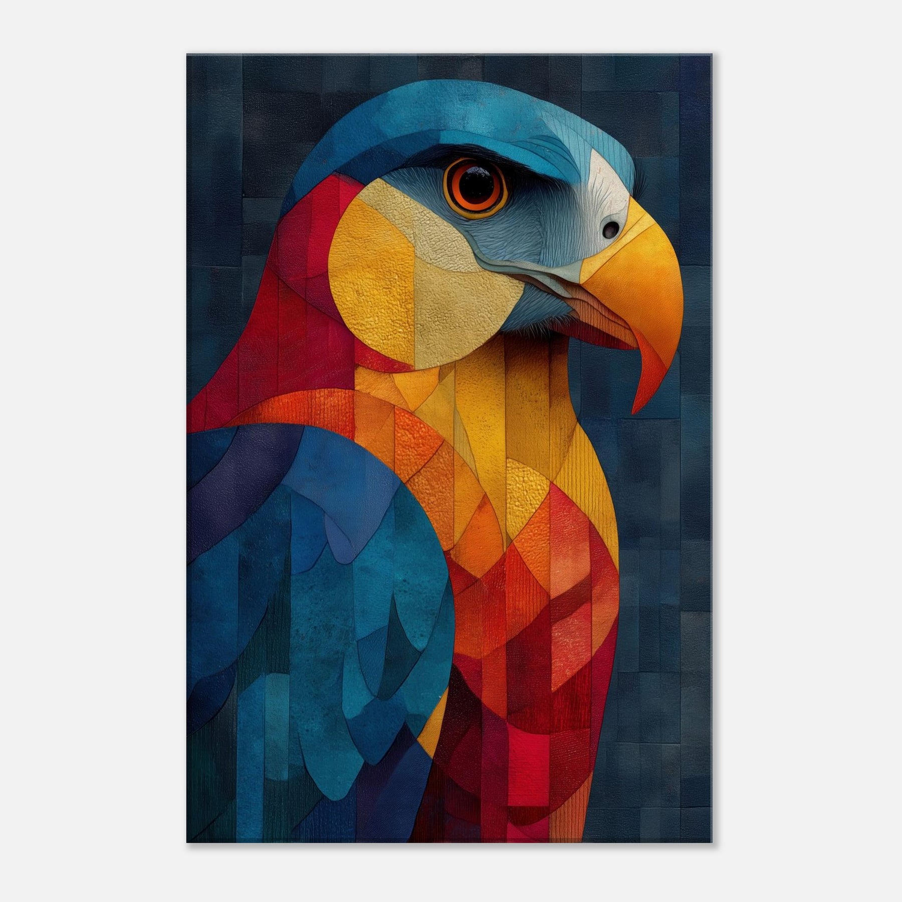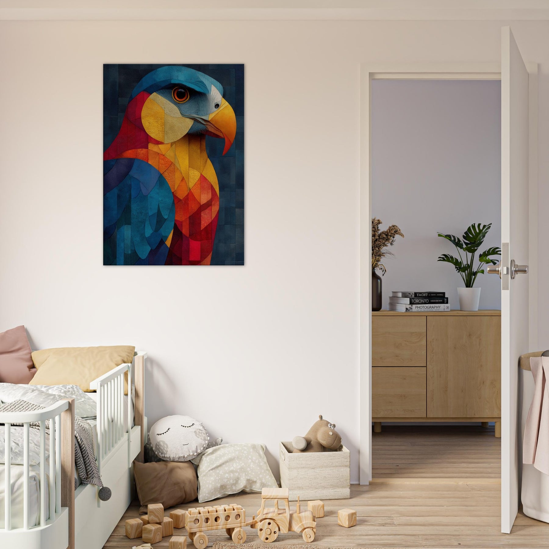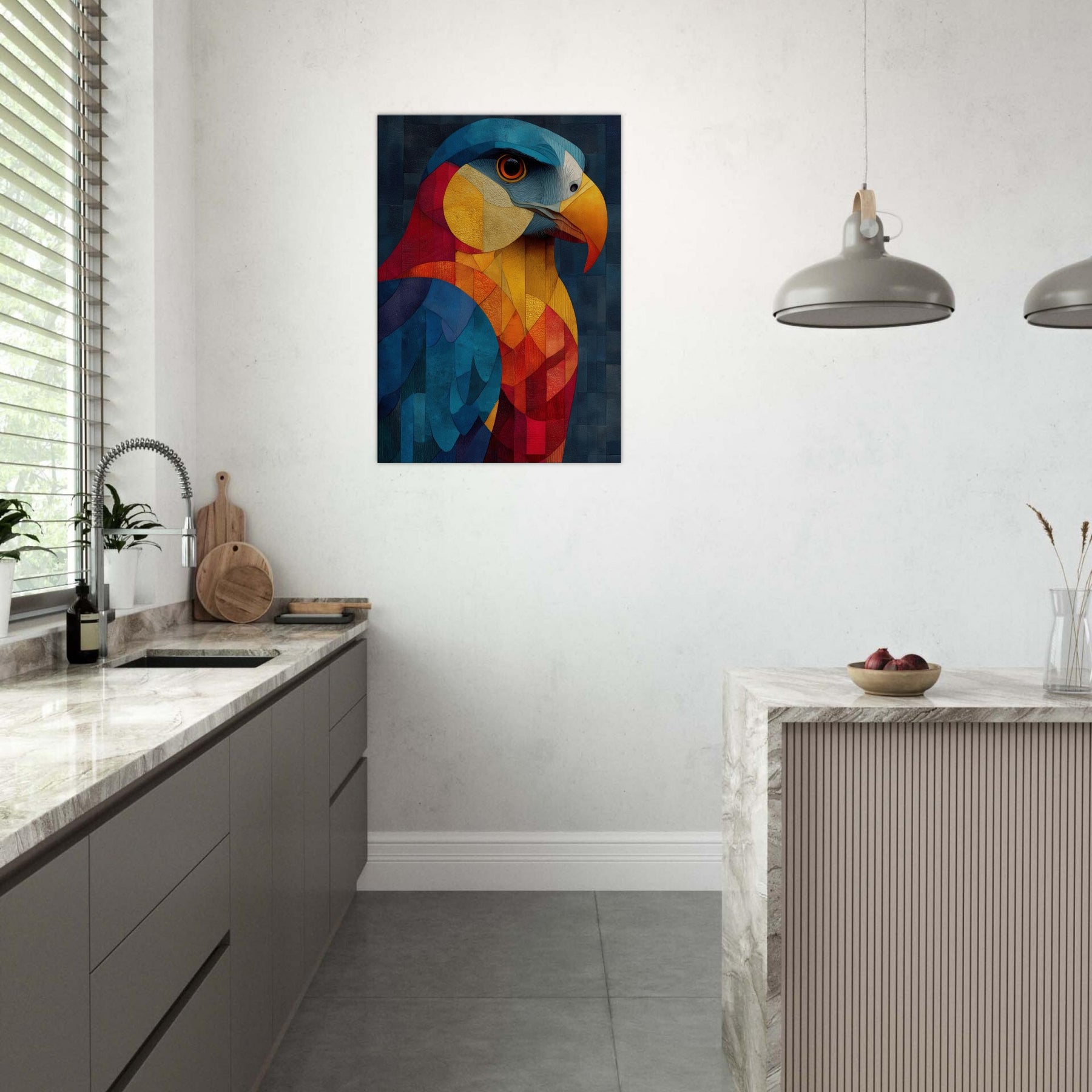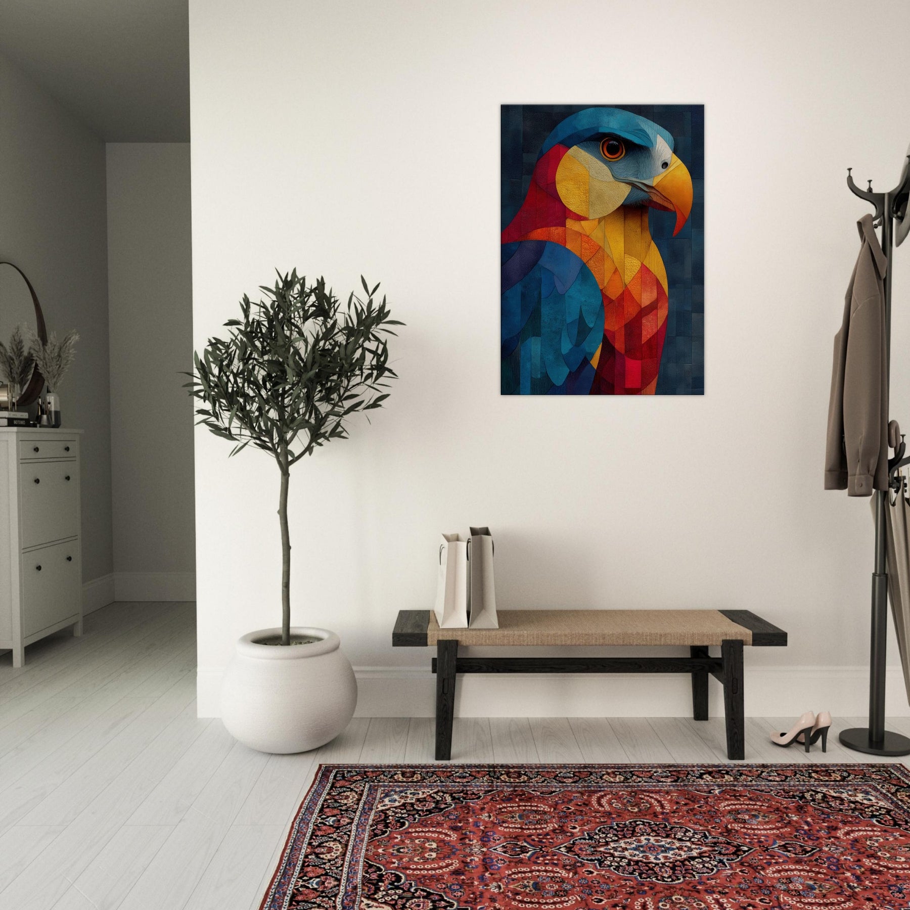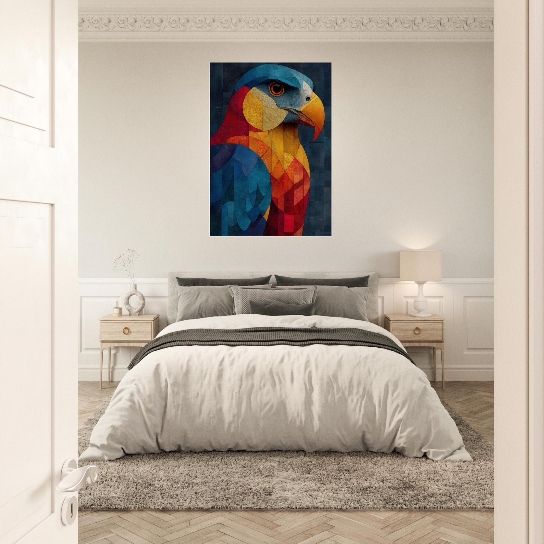 This abstract eagle soars across a field of color, its gaze both ancient and immediate. The mosaic of warm ochre, coral, and sapphire glows with kinetic energy, inviting the room to breathe in slow, bright electricity. The Primary Subject, the eagle, is rendered not as a single creature but as a sunlit constellation every shard of pigment catching the light, every curve suggesting motion and precision. Hung in a living room or study, it reframes space as a sanctuary of bold clarity and quiet strength.