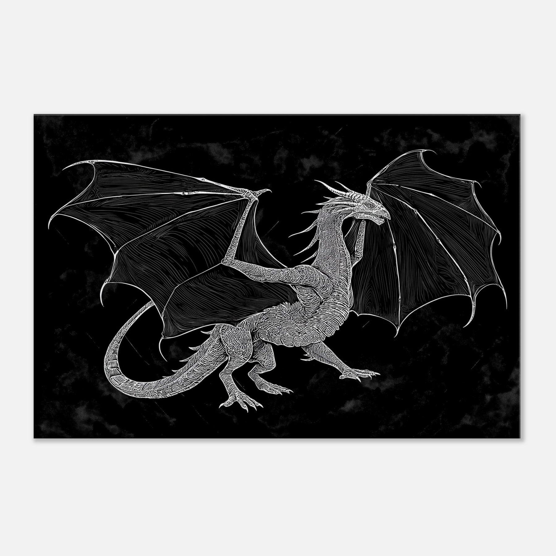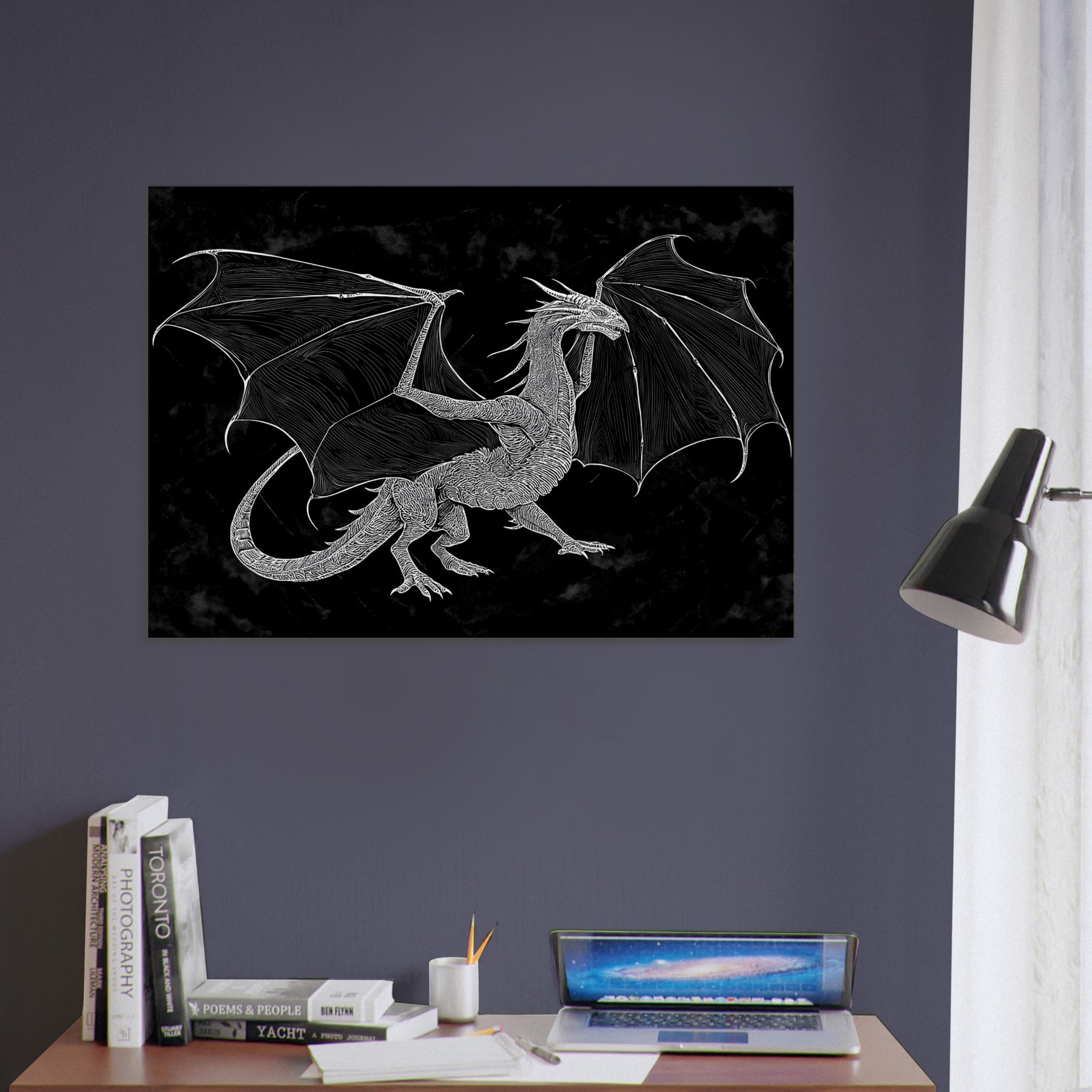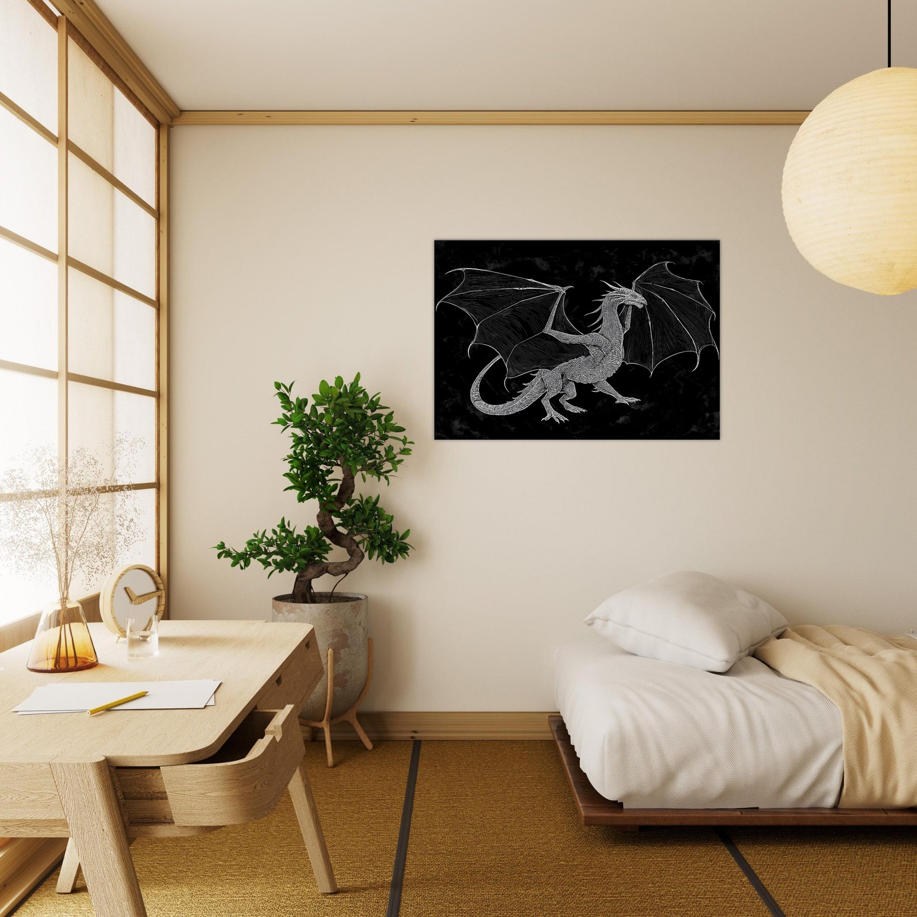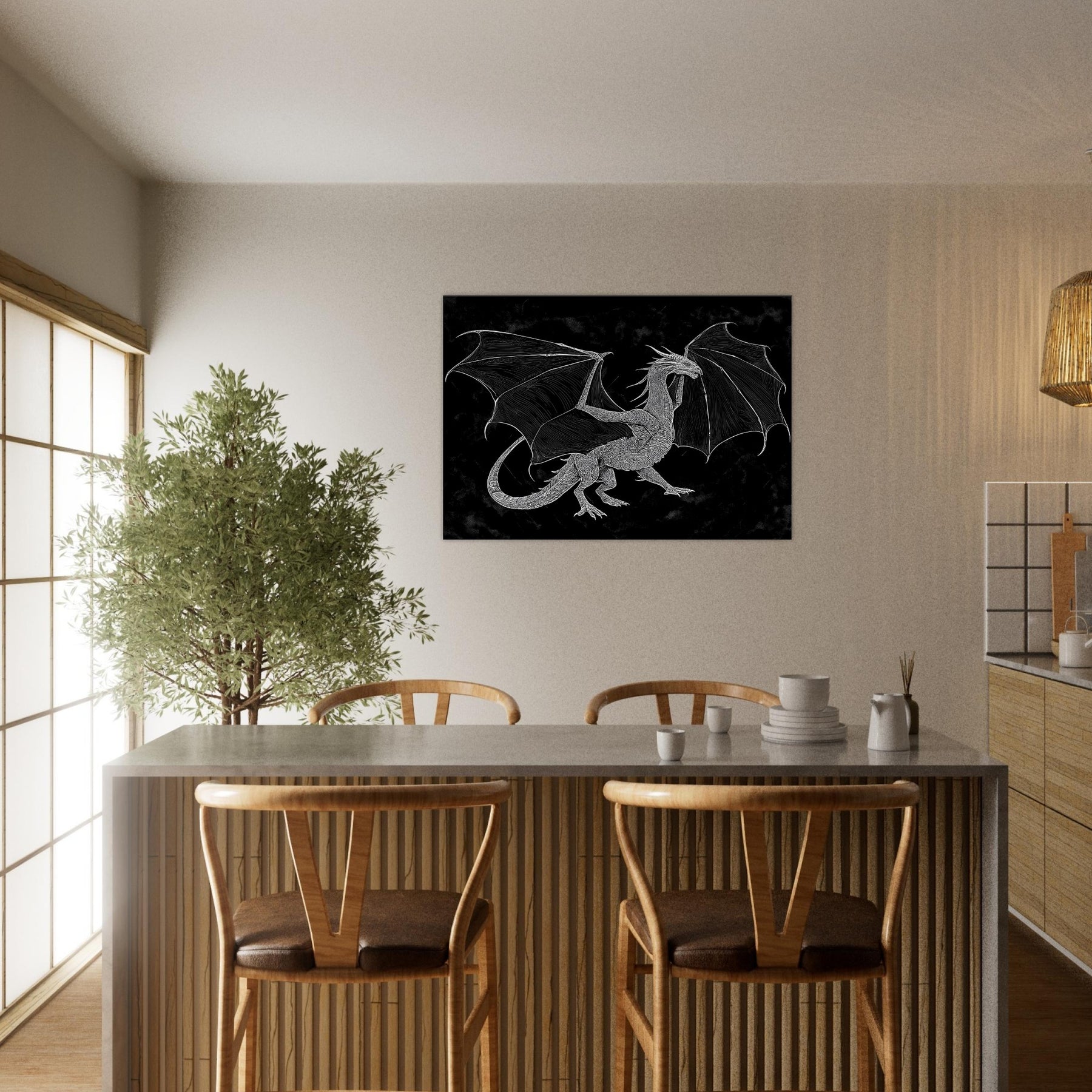 Immerse your space in the lingering hush of a starlit night with this line art of the Majestic Dragon. Every sinewy contour and teardrop of white ink against ink black sky feels carved from memory a quiet, ceremonial reminder of power and grace. The stark contrast and careful rhythm of the lines invite contemplation, turning a wall into a portal of myth. Perfect above a sofa or in a study, it adds drama, focus, and a touch of gold fired fantasy to any living space.