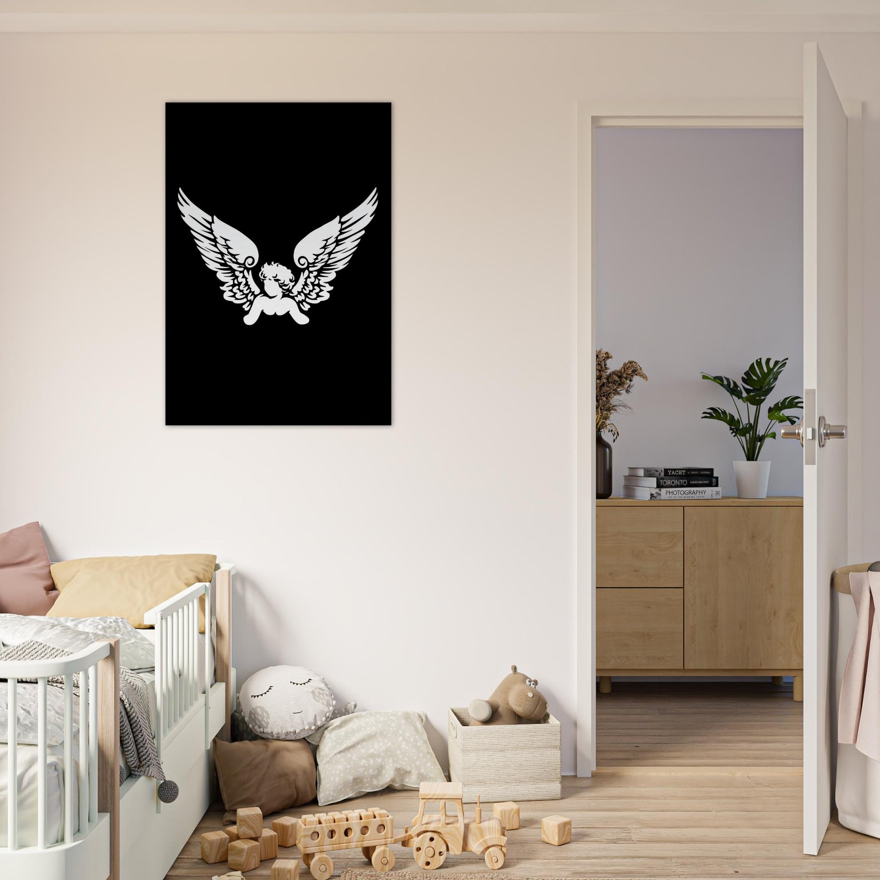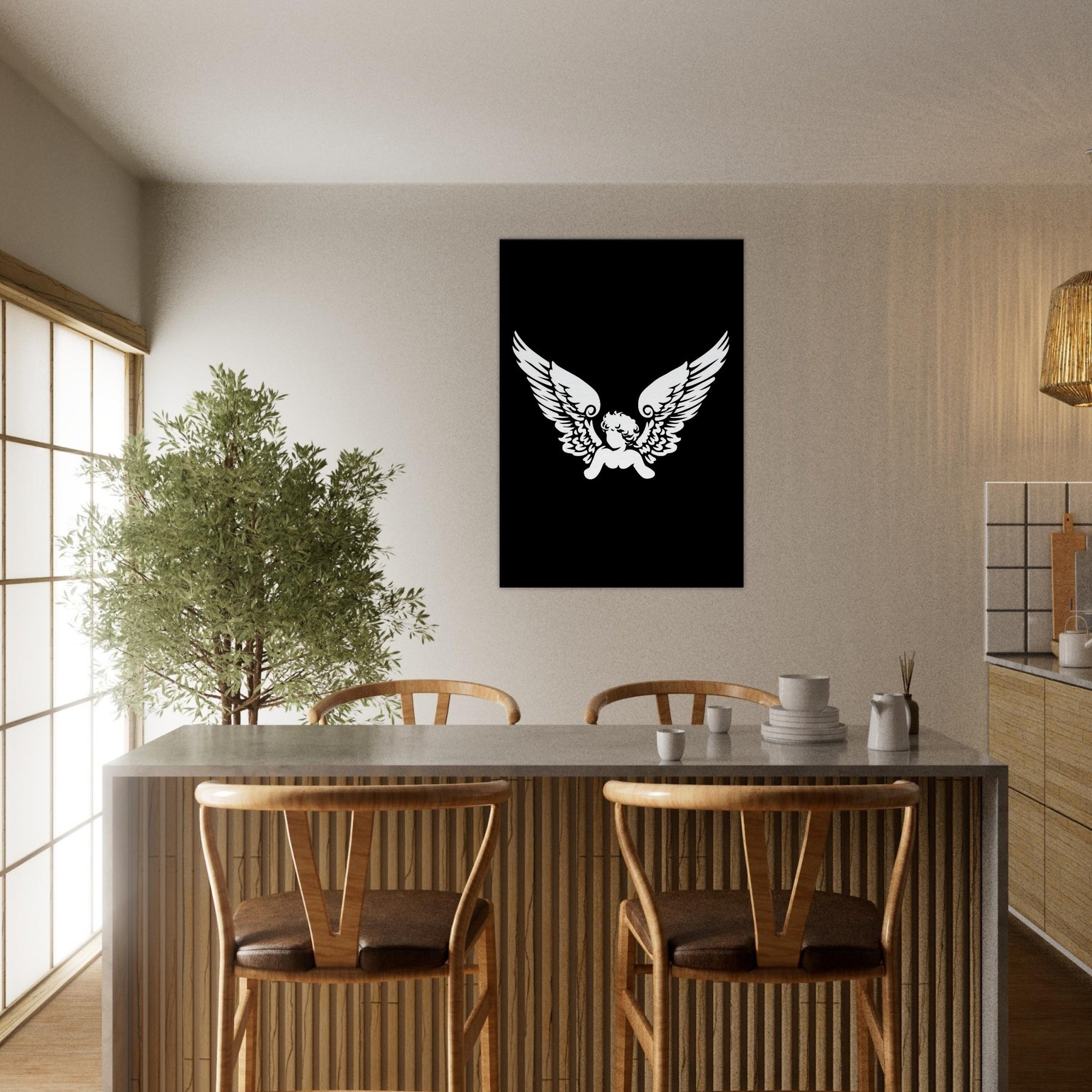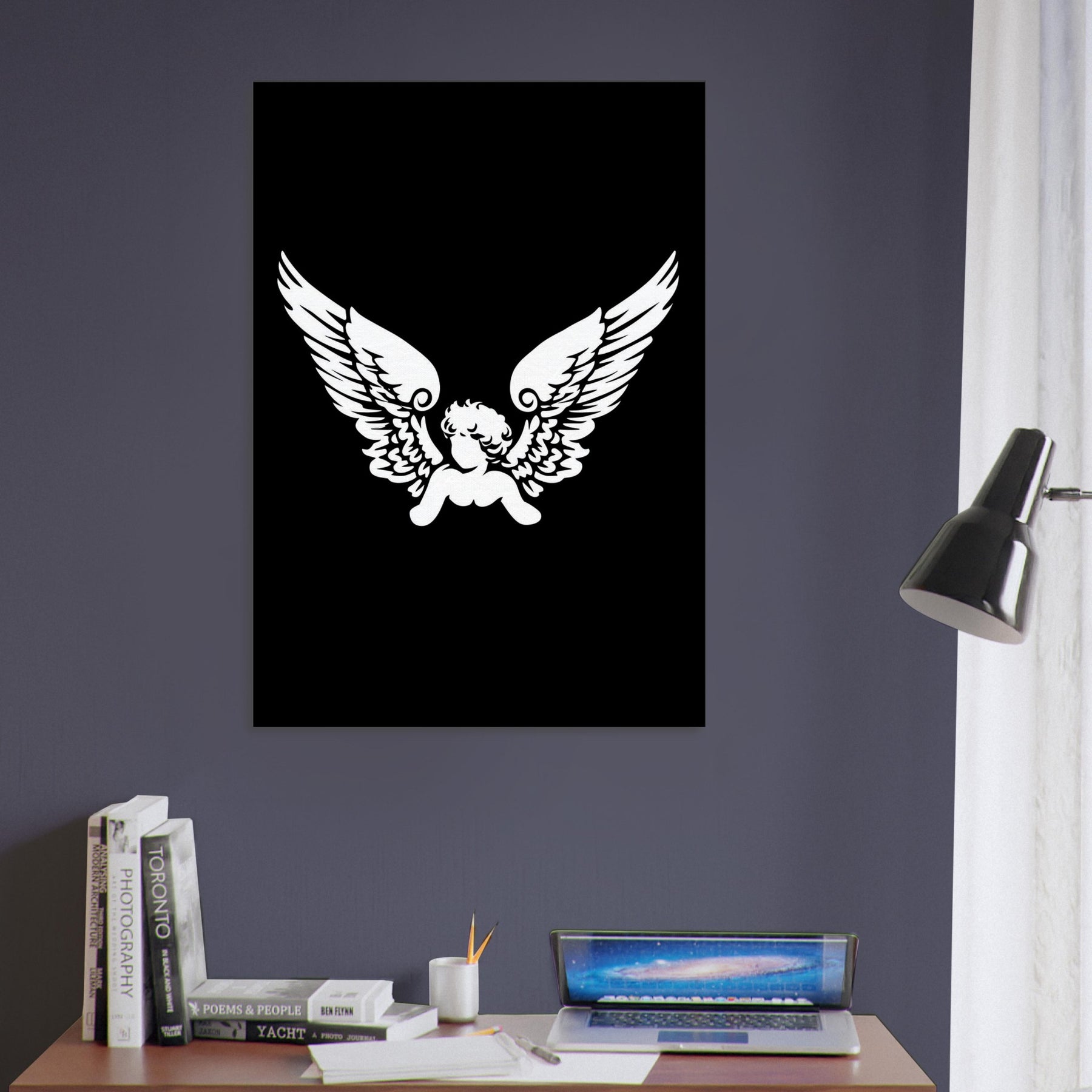 An intimate silhouette, the Cherub (Wings Only) unfolds in stark white on midnight black. This line art study captures a moment of suspended grace the soft whisper of feathers, the hush of air, the tremor of a dream. Hang it to bring a celestial hush to a living room or boudoir; the stark contrast and airy lines invite contemplation, guiding color and texture toward serenity.