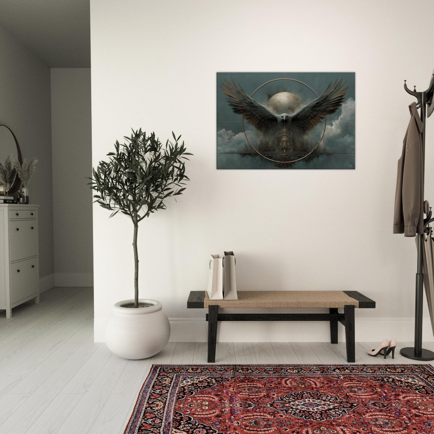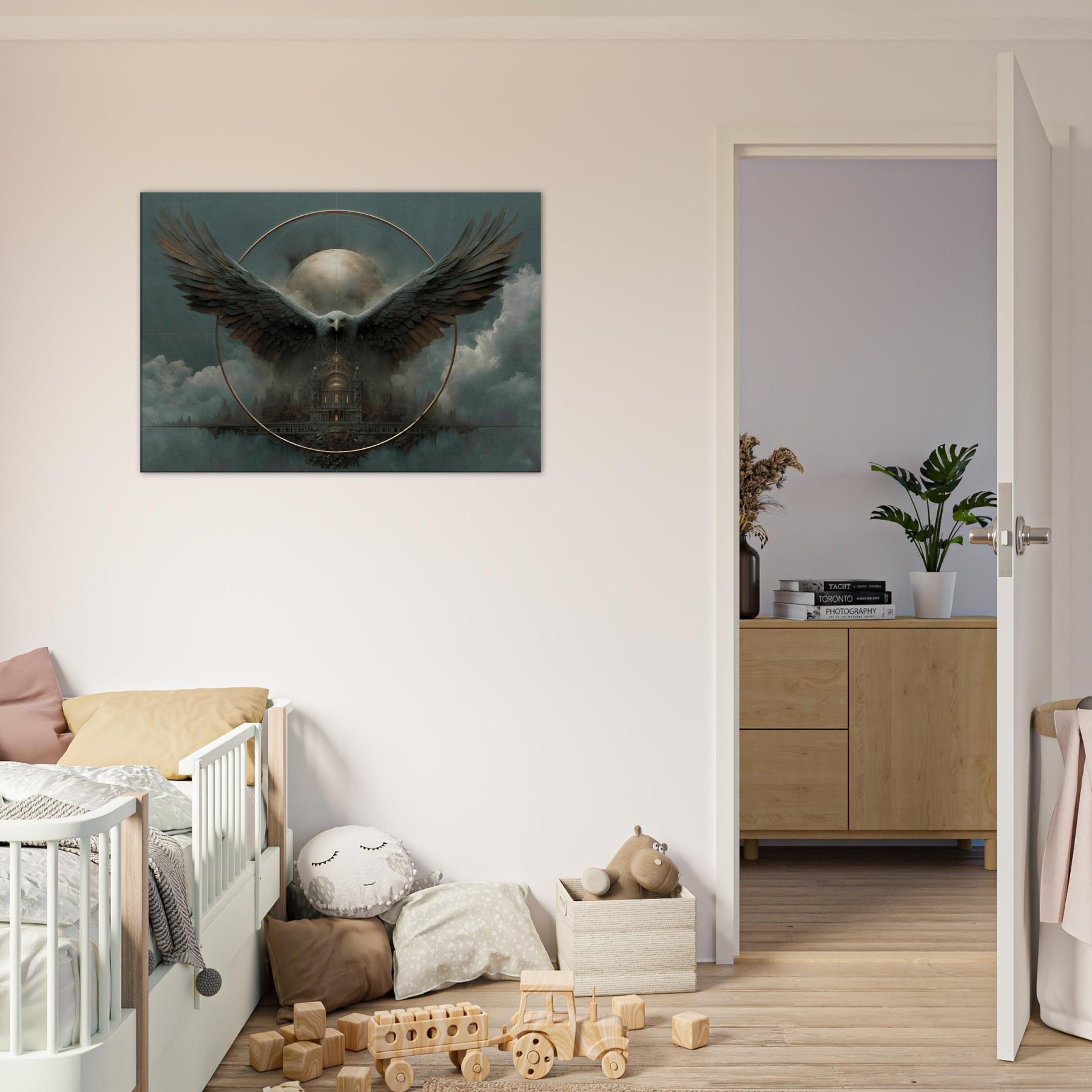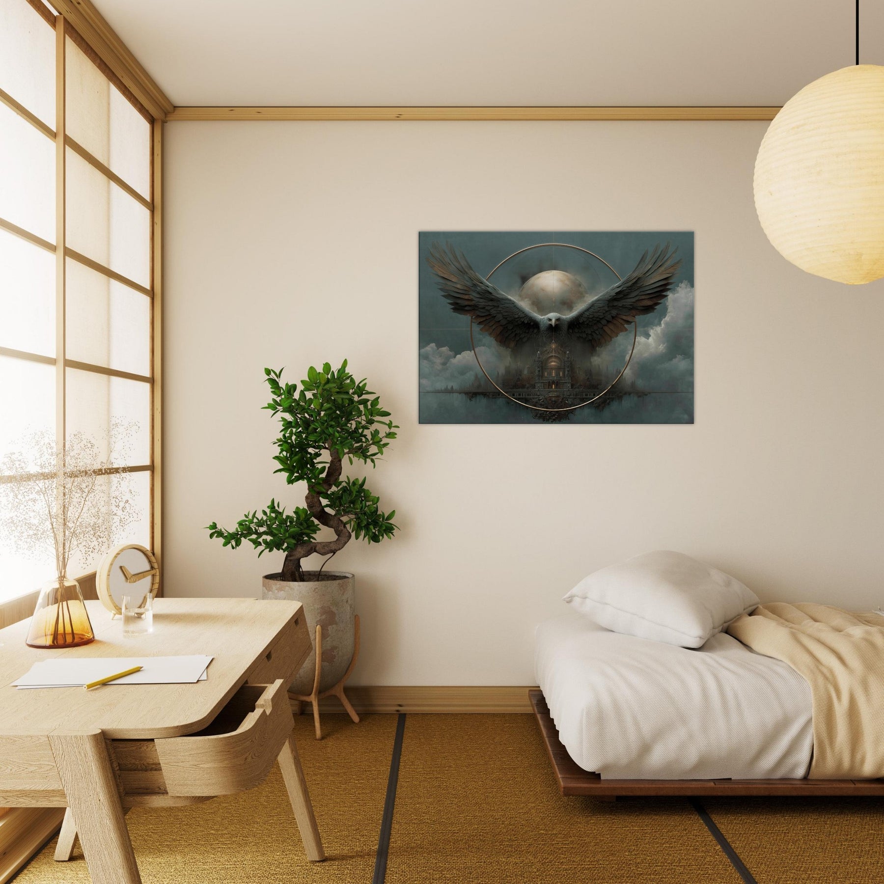 With a Nebula unfurling at its center, this surreal composition envelops the room in a quiet, otherworldly hush. A winged form arches across a suspended ring, descending into a shadowed temple of memory, where light threads weave through cloud and metal. The atmosphere feels expansive yet intimate, a meditative counterpoint to daily life. Hung in a living room or study, it invites the eye to travel, soften, and rest transforming walls into a doorway to wonder and calm.