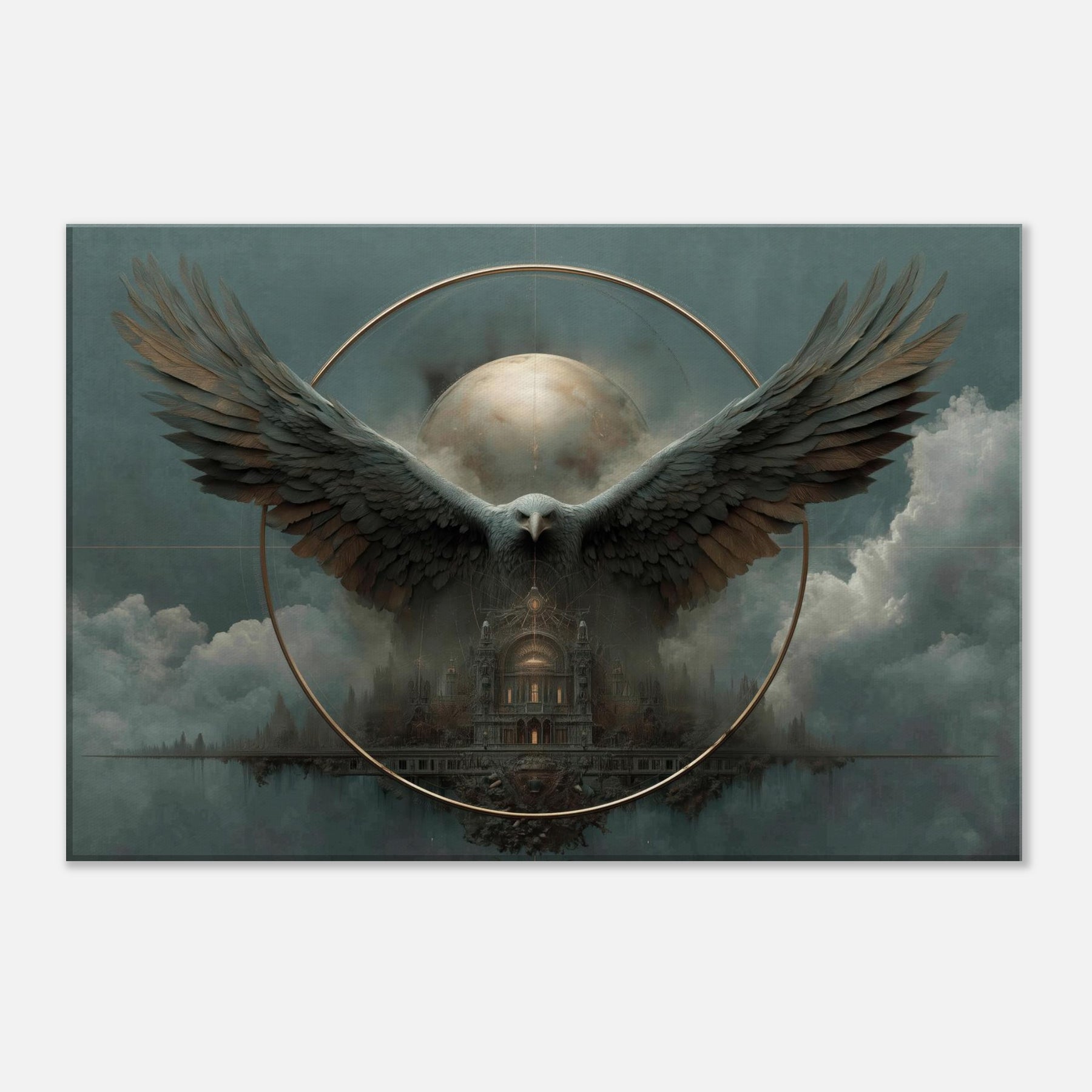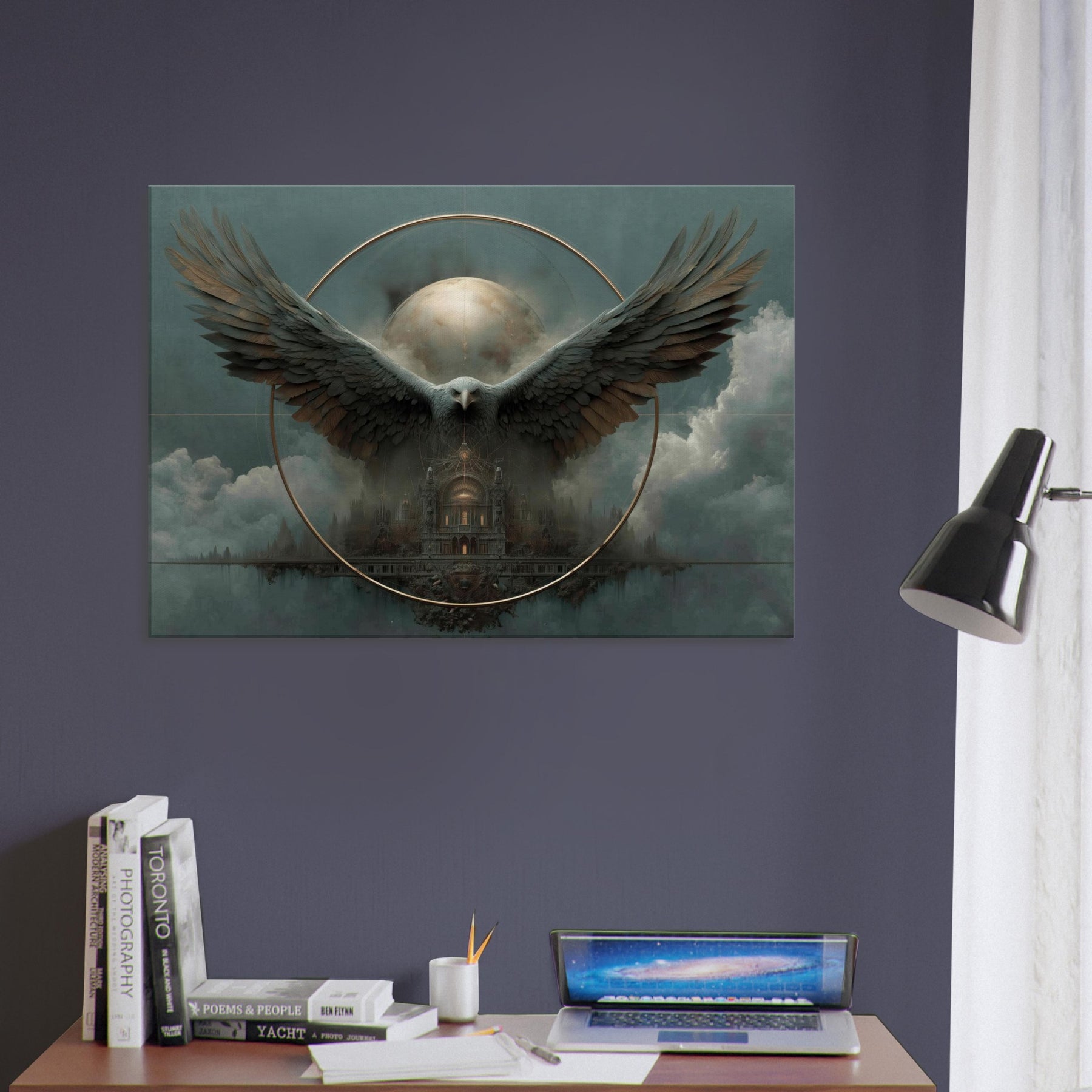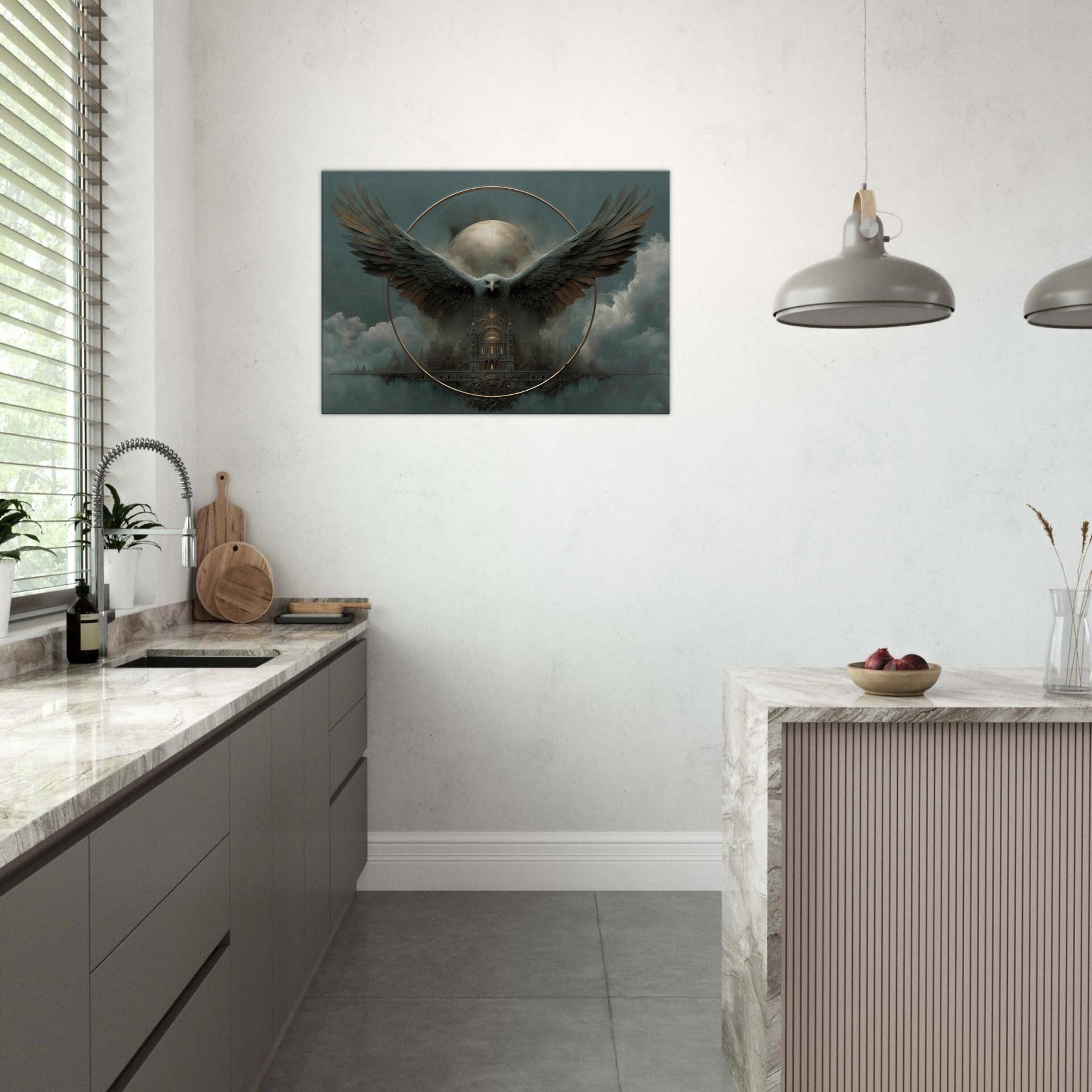 With a Nebula unfurling at its center, this surreal composition envelops the room in a quiet, otherworldly hush. A winged form arches across a suspended ring, descending into a shadowed temple of memory, where light threads weave through cloud and metal. The atmosphere feels expansive yet intimate, a meditative counterpoint to daily life. Hung in a living room or study, it invites the eye to travel, soften, and rest transforming walls into a doorway to wonder and calm.
