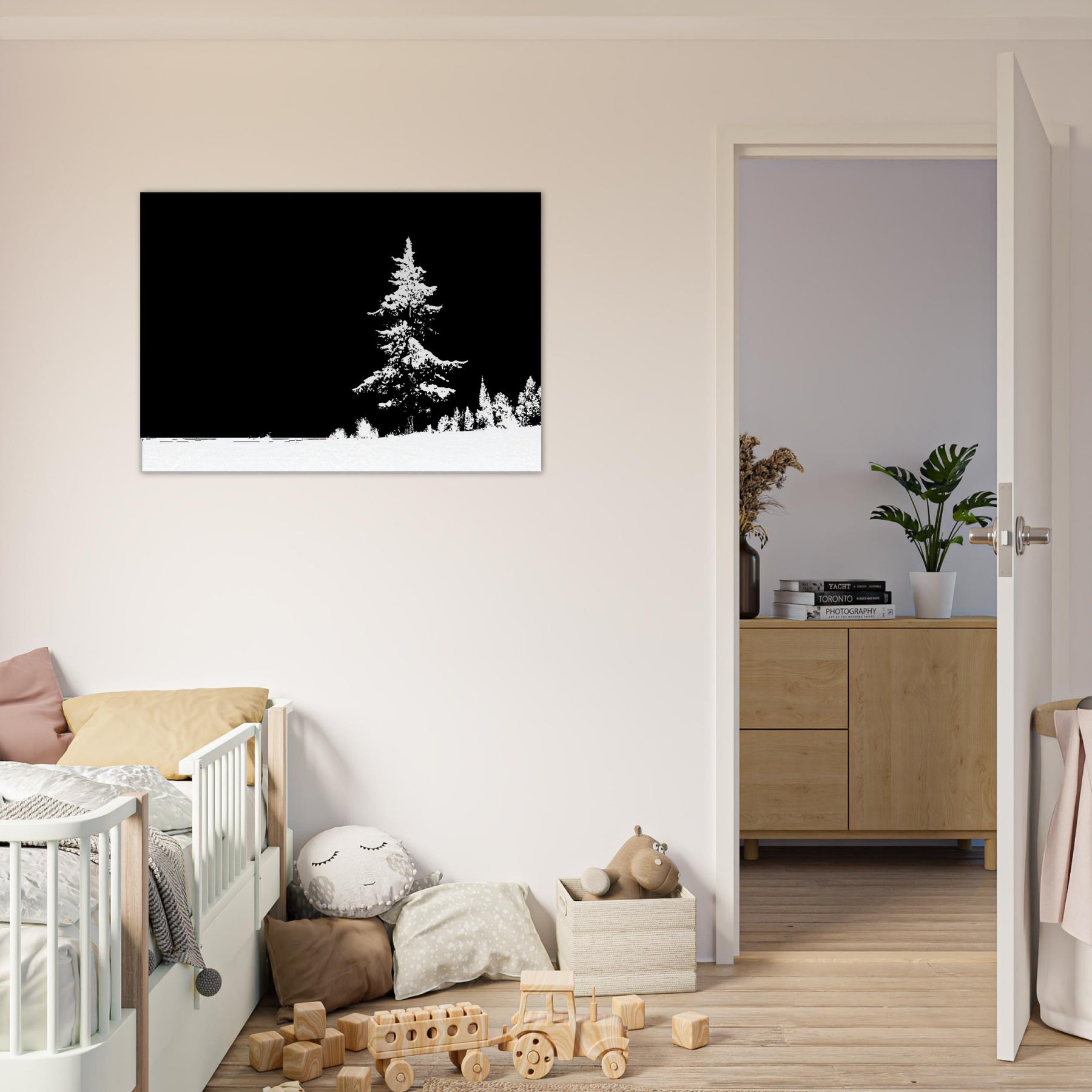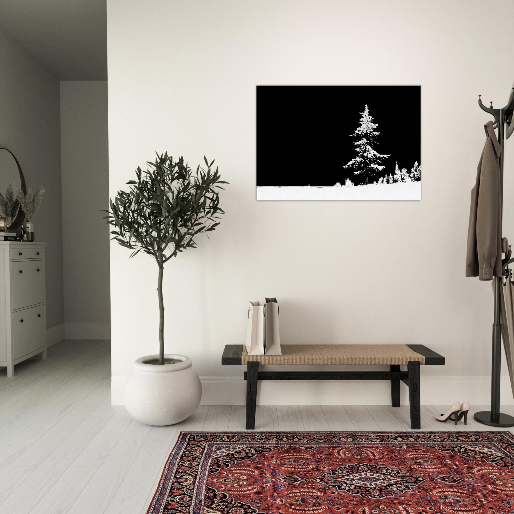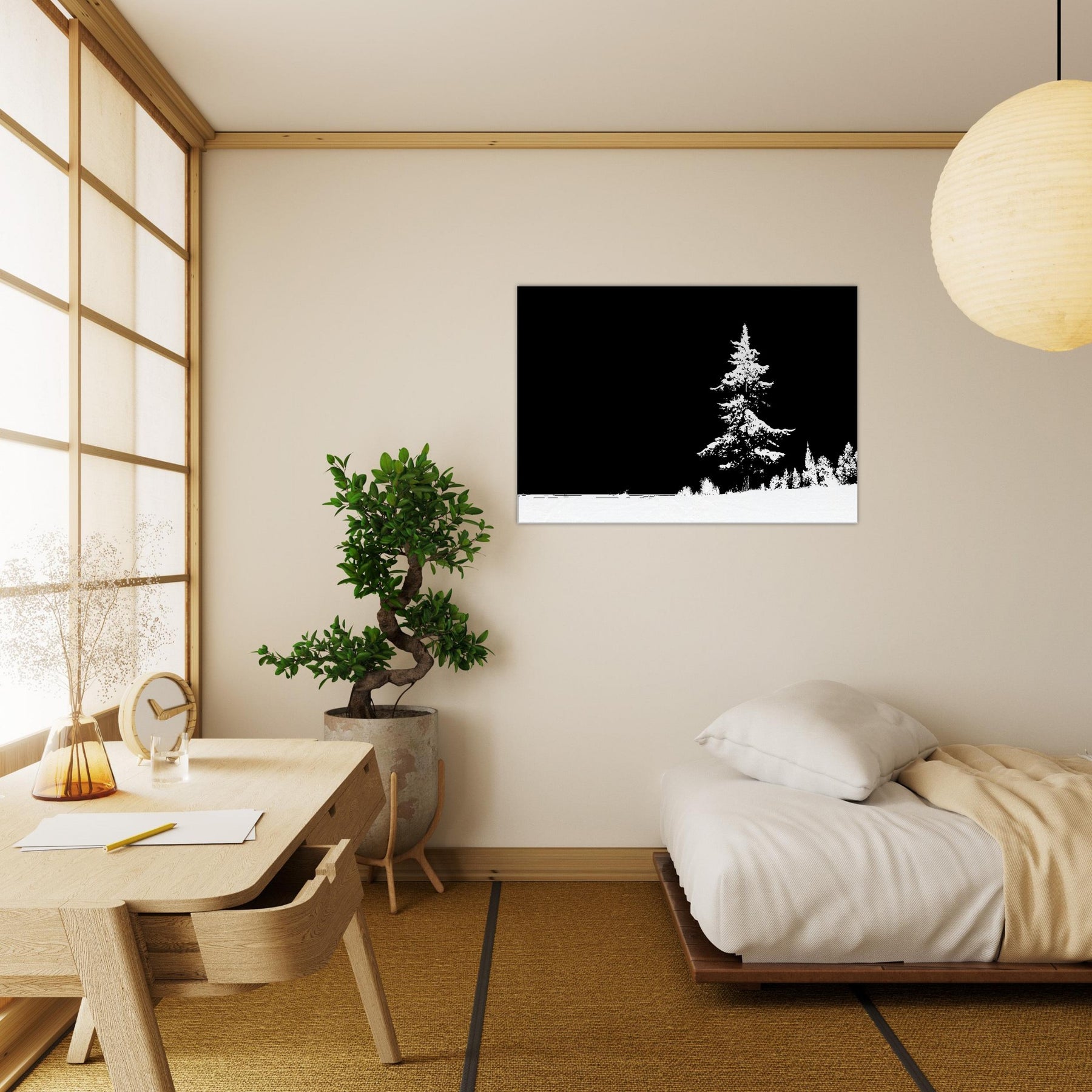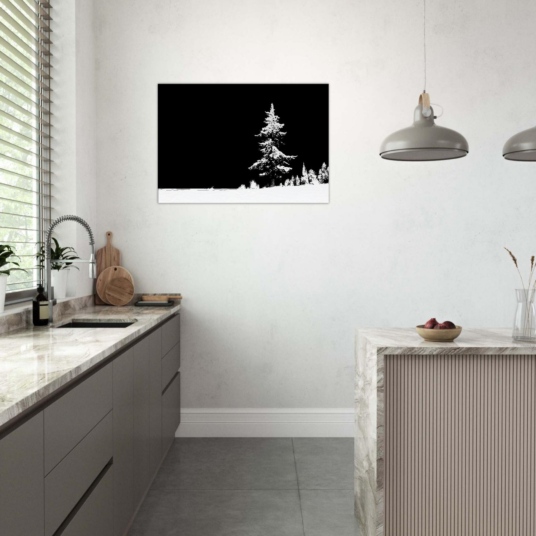 Immerse your room in the hush of a snow draped . This Snowy Forest, rendered in elegant line art, gathers quiet energy at the edge of a pale horizon. The stark contrast of black and white invites a calm, contemplative mood, turning walls into windows to stillness and reflection. Perfect for a living room or study, it pairs with crisp textures and soft lighting to elevate a space with nature inspired clarity and timeless, gallery ready charm.