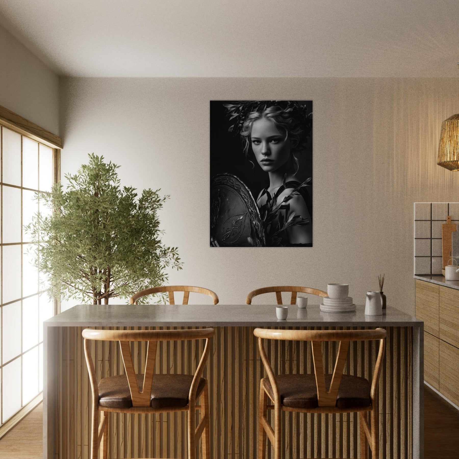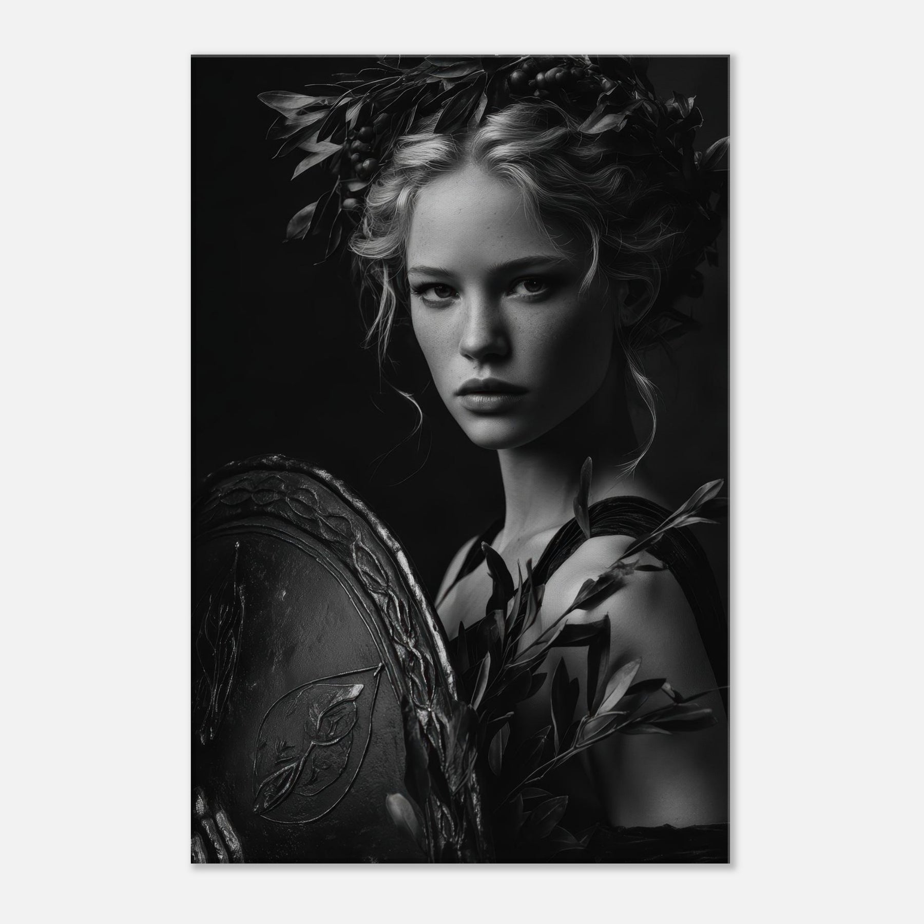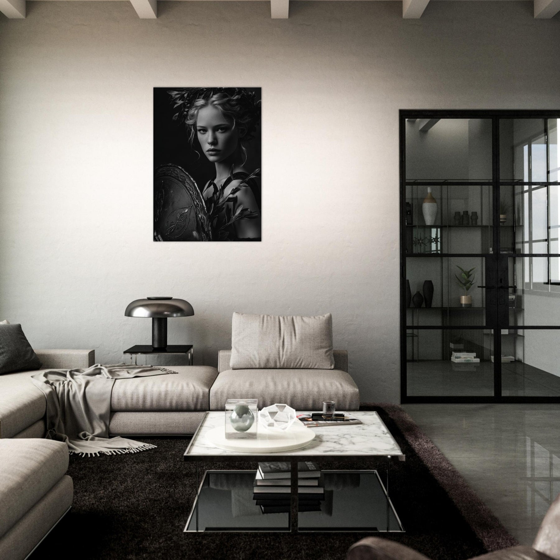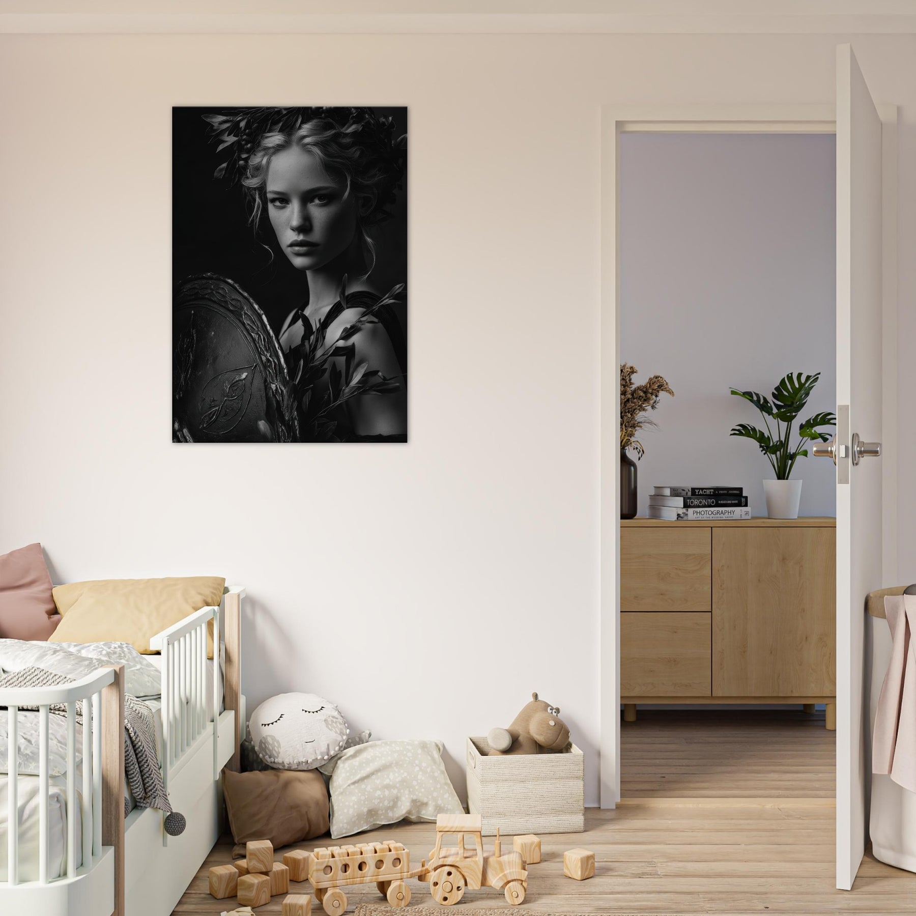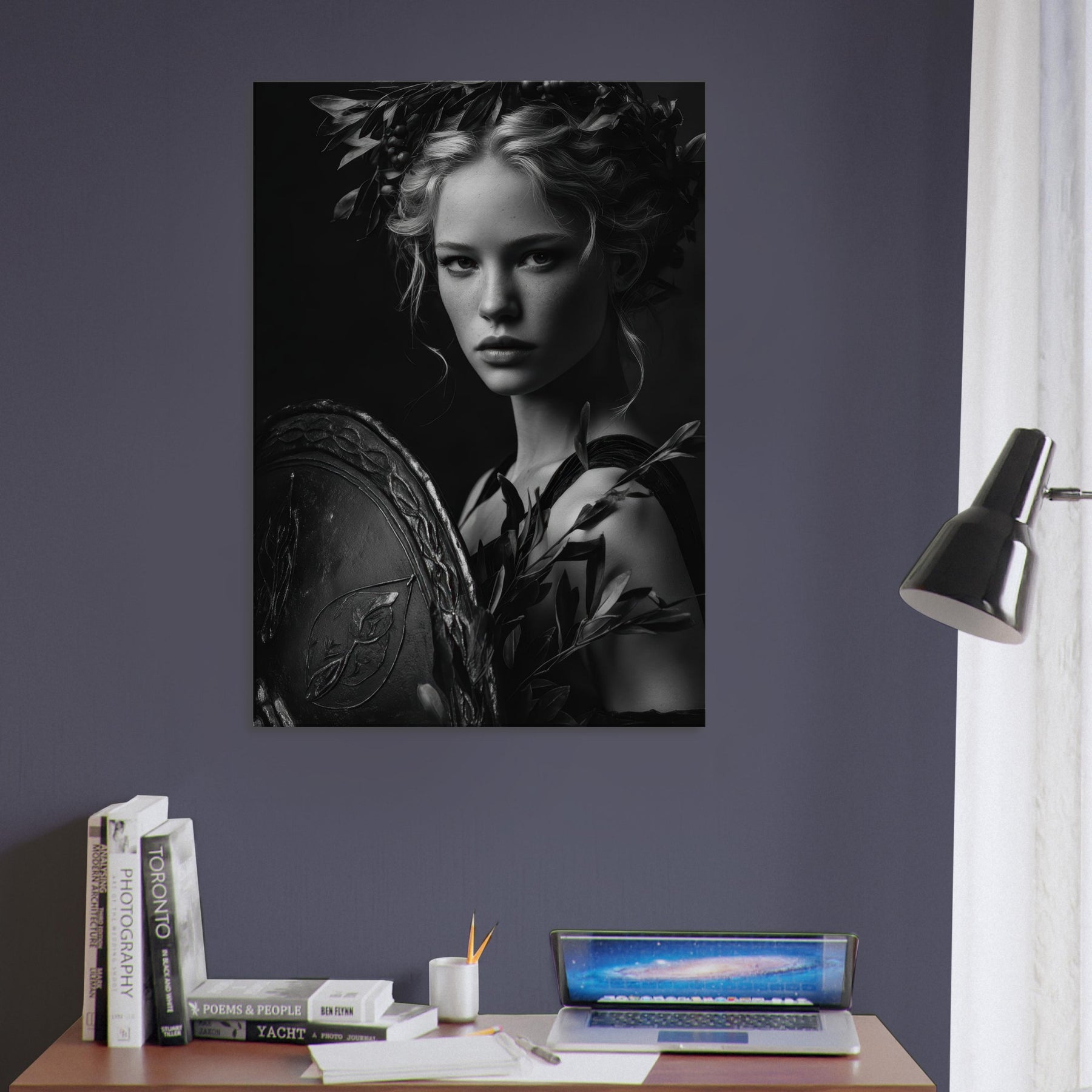 Athena, goddess of wisdom and strategy, stands in a hush of light and shadow, turning a living space into a temple of focus. This black and white emphasizes her laurel crown and weathered shield, a quiet guardianship that invites thoughtful, deliberate energy.