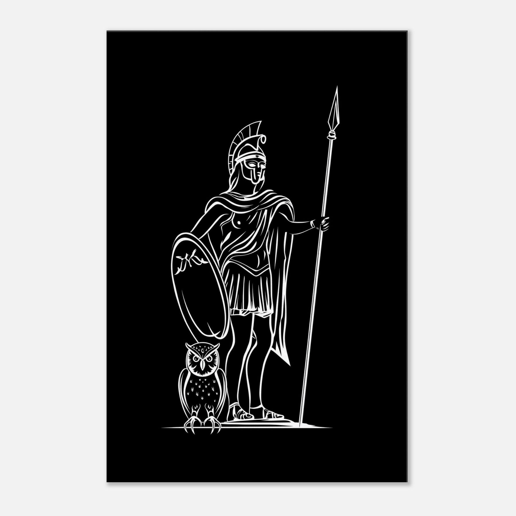 Athena, Goddess of Wisdom and Strategy, stands in elegant line a study in poised strength and radiant intelligence. The single white contour traces shield, spear, and cloak, with an owl as loyal witness. Set against deep black, it creates a calm, focused atmosphere that invites contemplation. This line art brings mythic authority to a living room, study, or entryway, infusing the space with clarity, courage, and timeless refinement a modern homage to ancient wisdom.