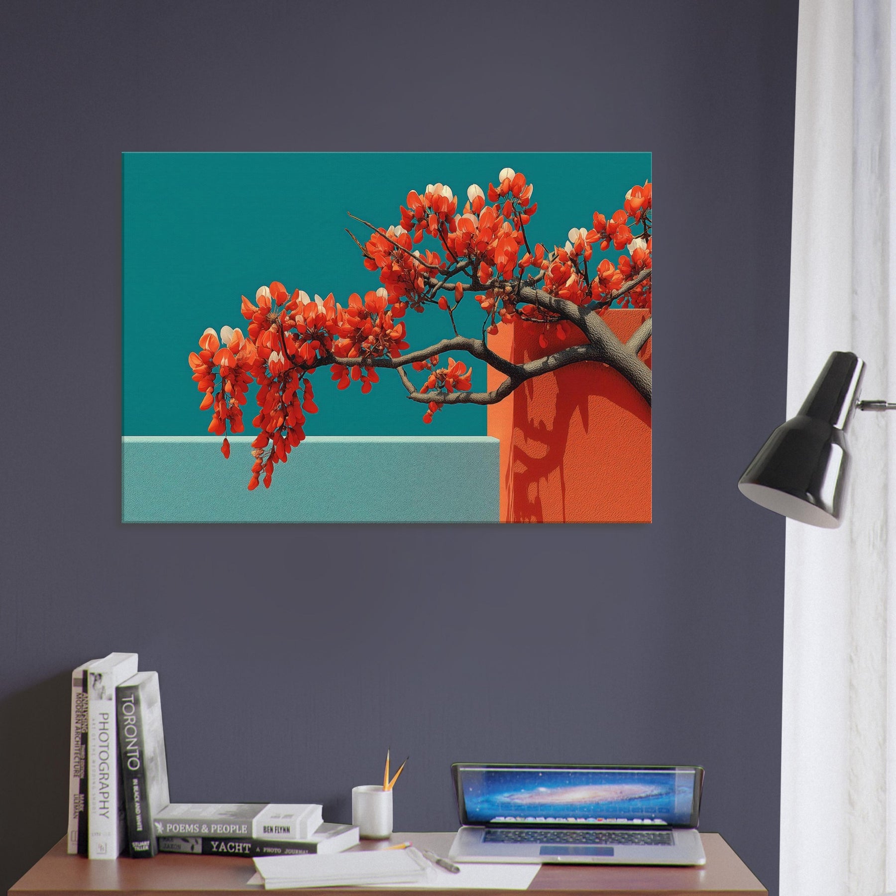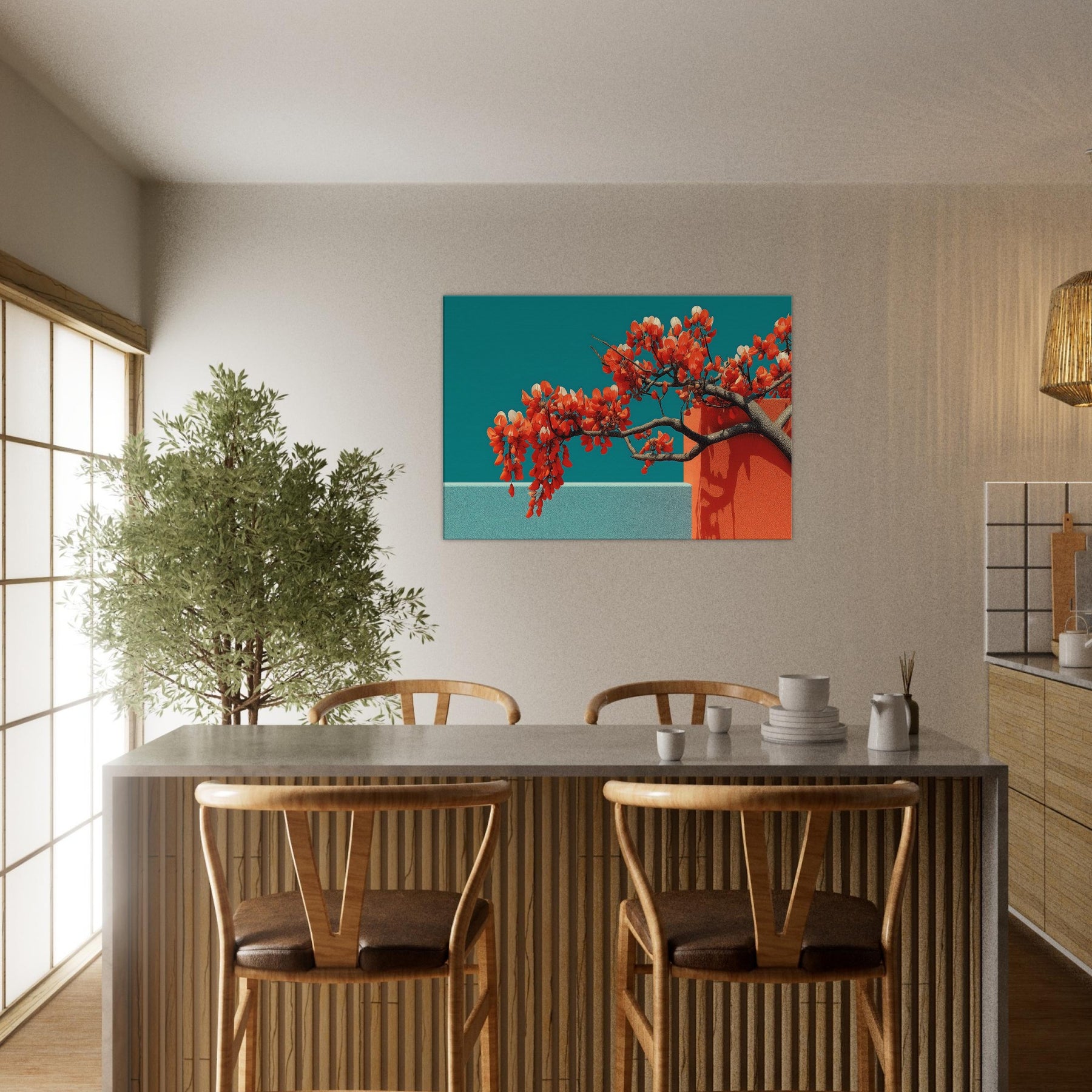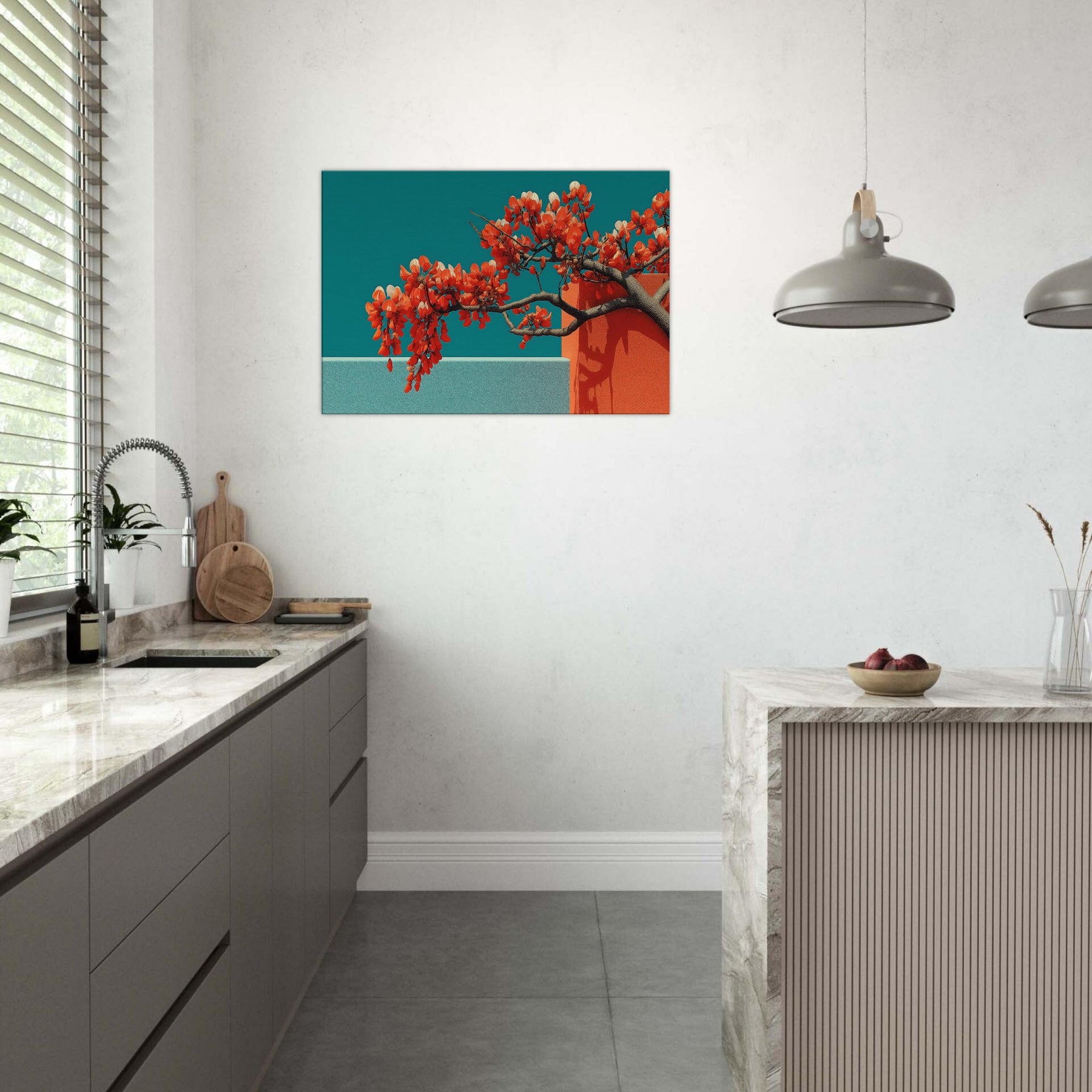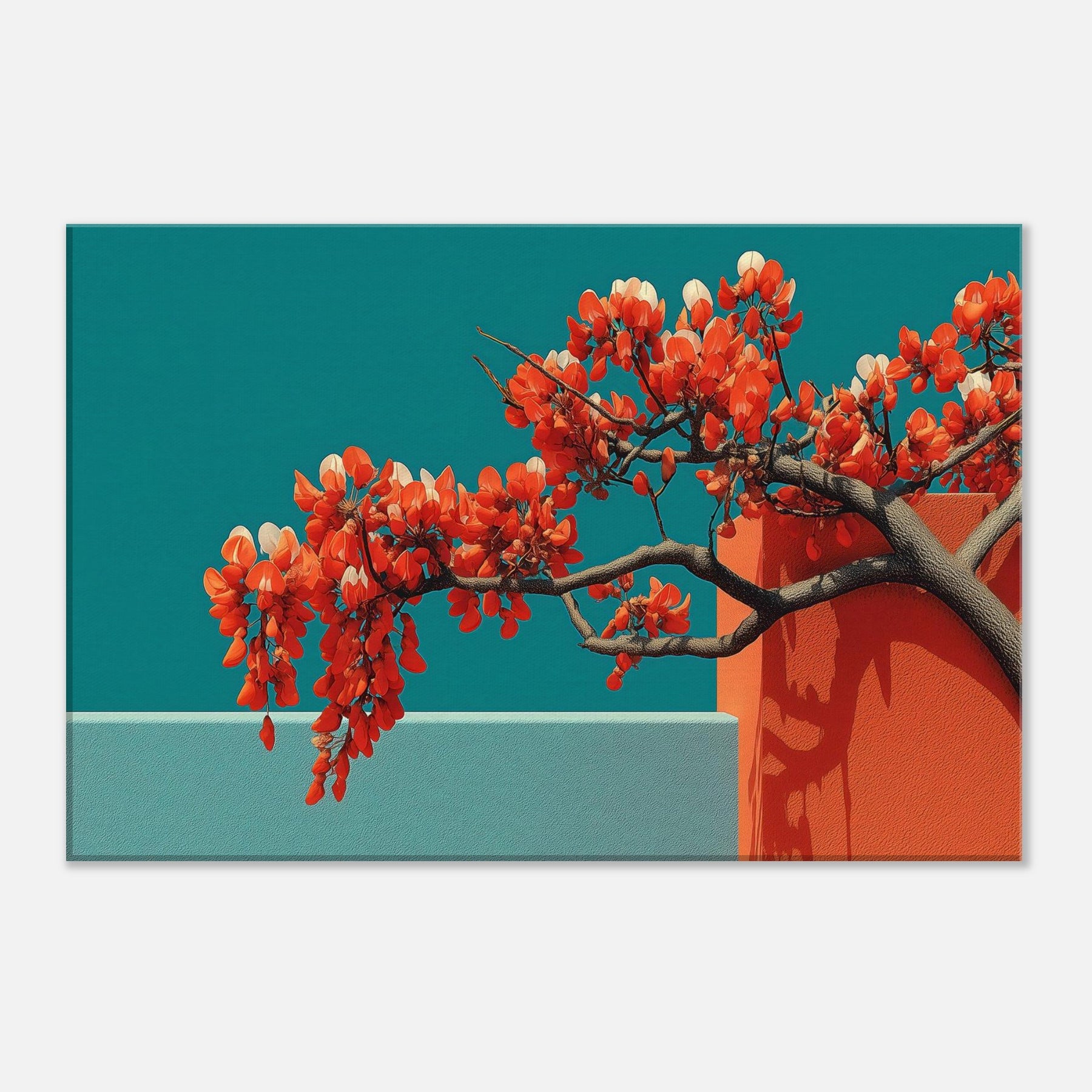 Wisteria gathers in a fluid, dreamlike arc, a quiet reckoning between nature and form. This abstract composition drapes luminous orange blossoms over cool teal planes, the branches turning architecture into living sculpture. The piece invites a contemplative stillness, as if a warm breeze moved through a sunlit hallway. Perfect for a modern living room or serene study, it enhances light with contrast and warmth, evoking both memory and possibility. With its tactile depth and airy cadence, this artwork makes space feel larger, calmer, and more inspired.