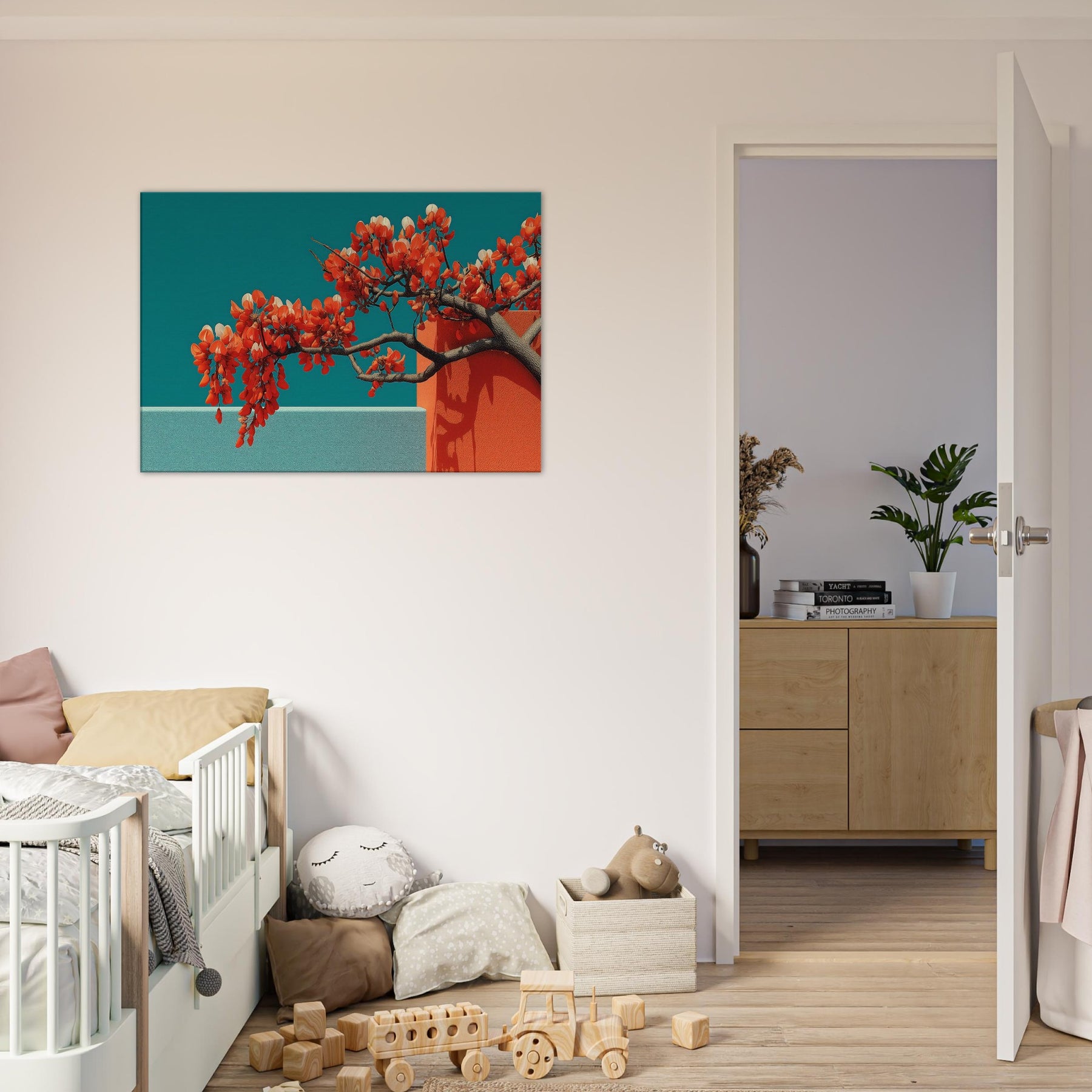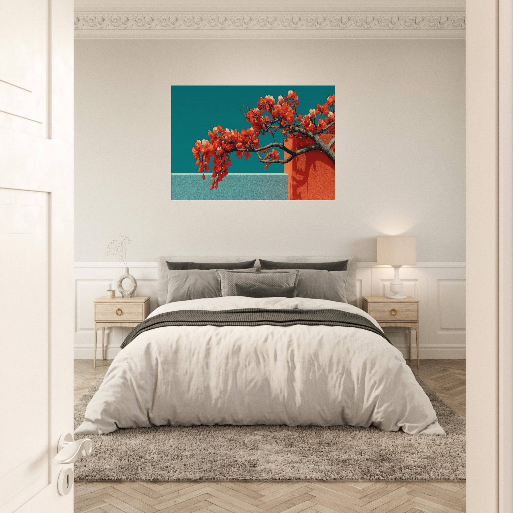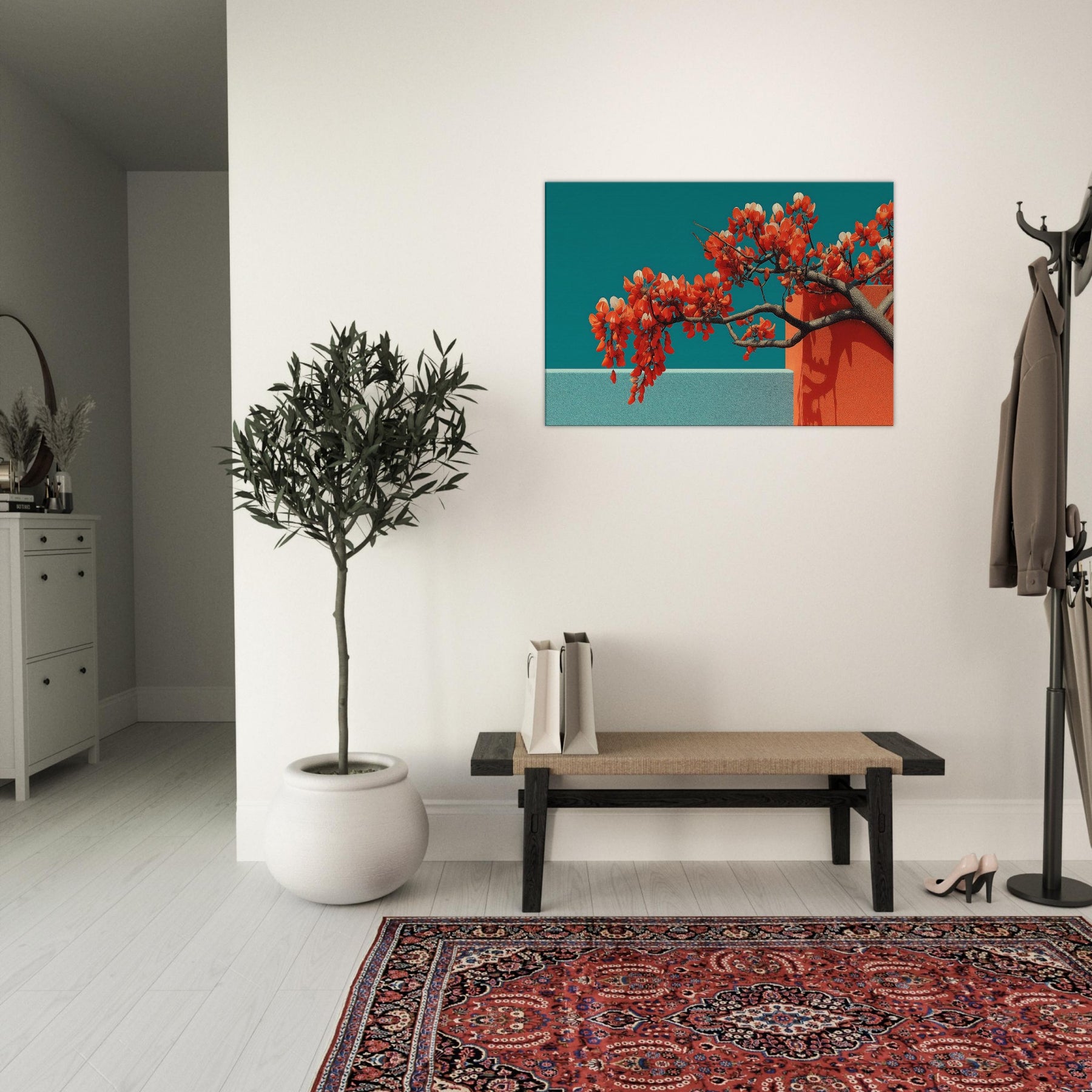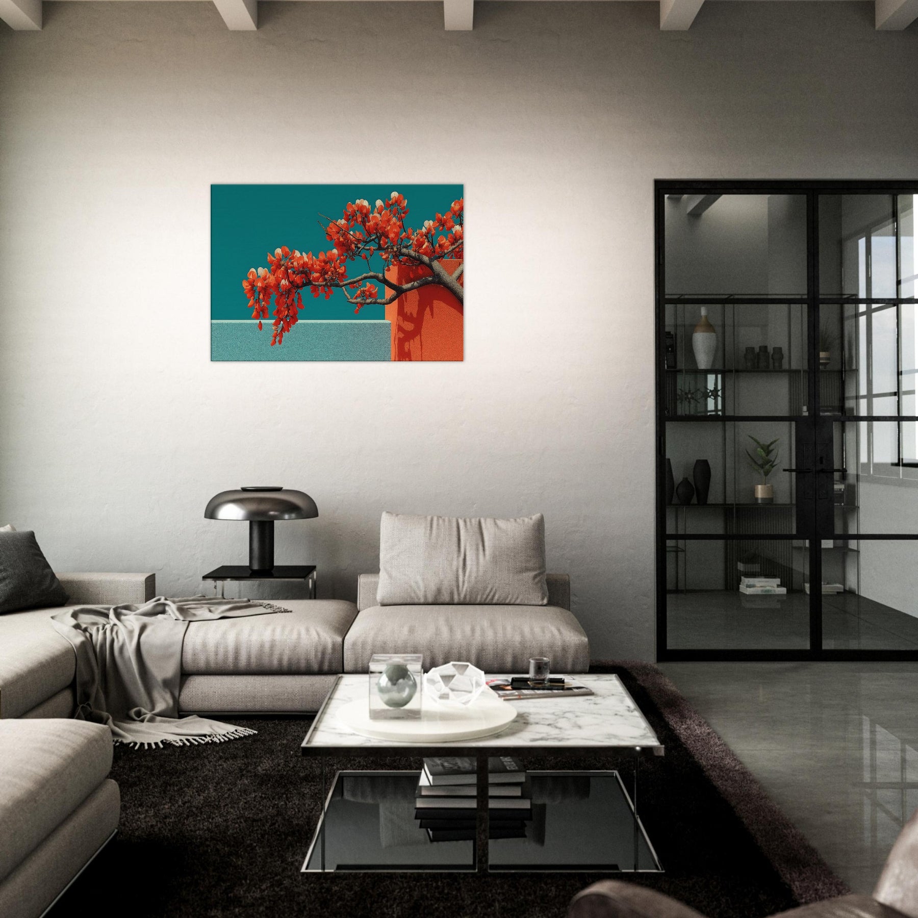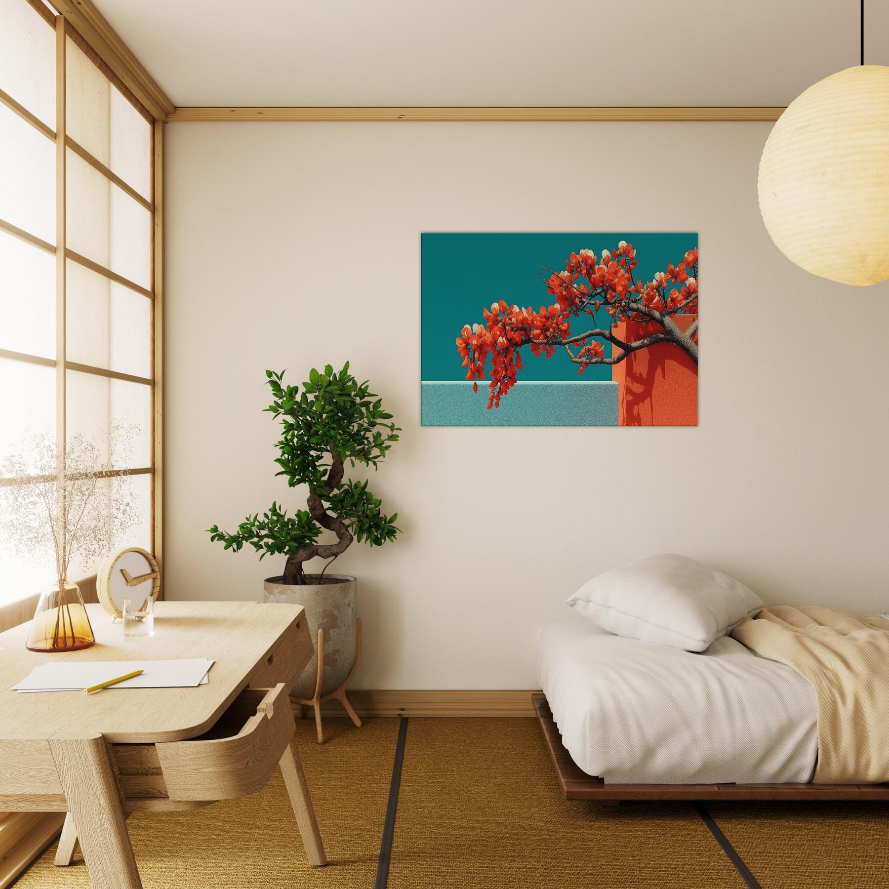 Wisteria gathers in a fluid, dreamlike arc, a quiet reckoning between nature and form. This abstract composition drapes luminous orange blossoms over cool teal planes, the branches turning architecture into living sculpture. The piece invites a contemplative stillness, as if a warm breeze moved through a sunlit hallway. Perfect for a modern living room or serene study, it enhances light with contrast and warmth, evoking both memory and possibility. With its tactile depth and airy cadence, this artwork makes space feel larger, calmer, and more inspired.