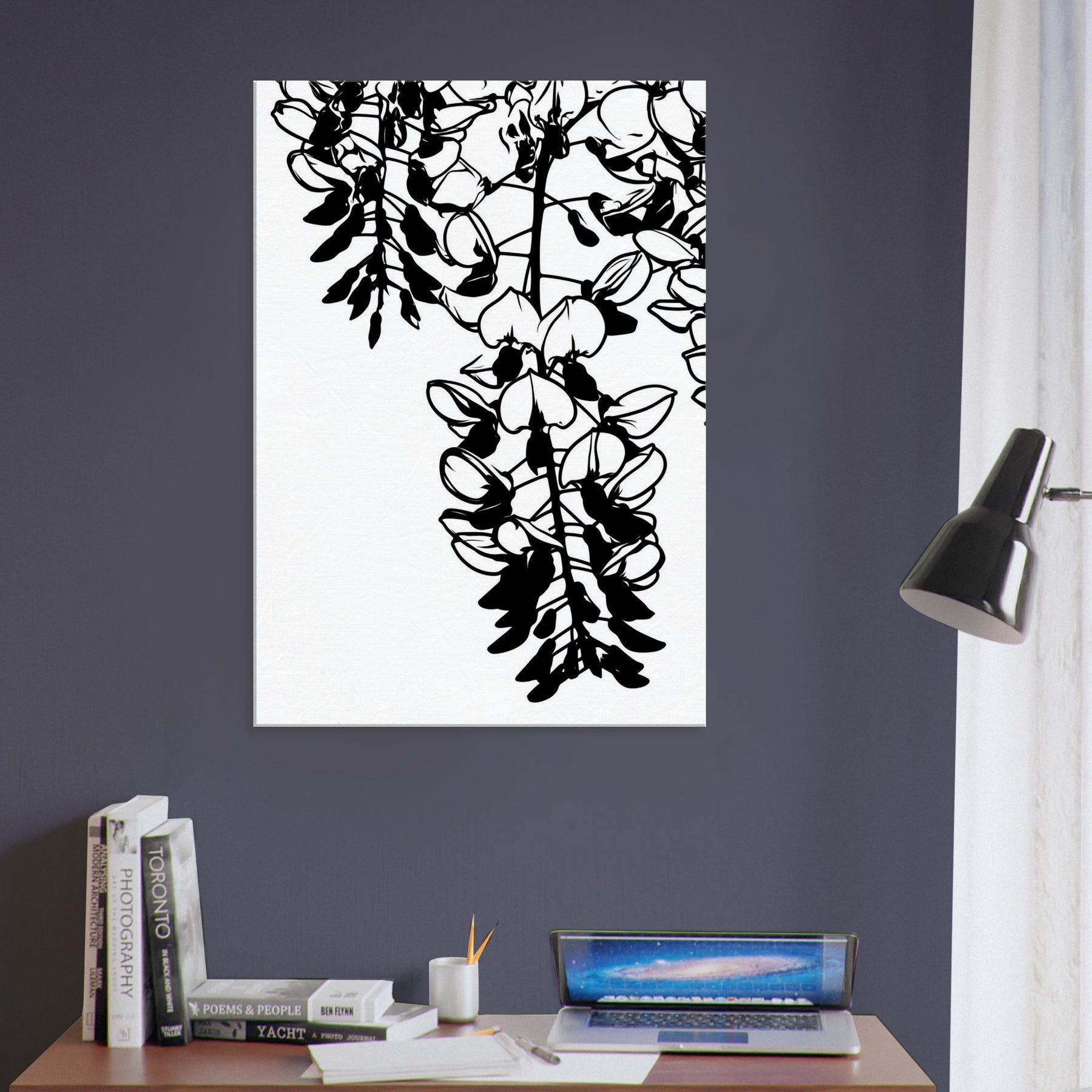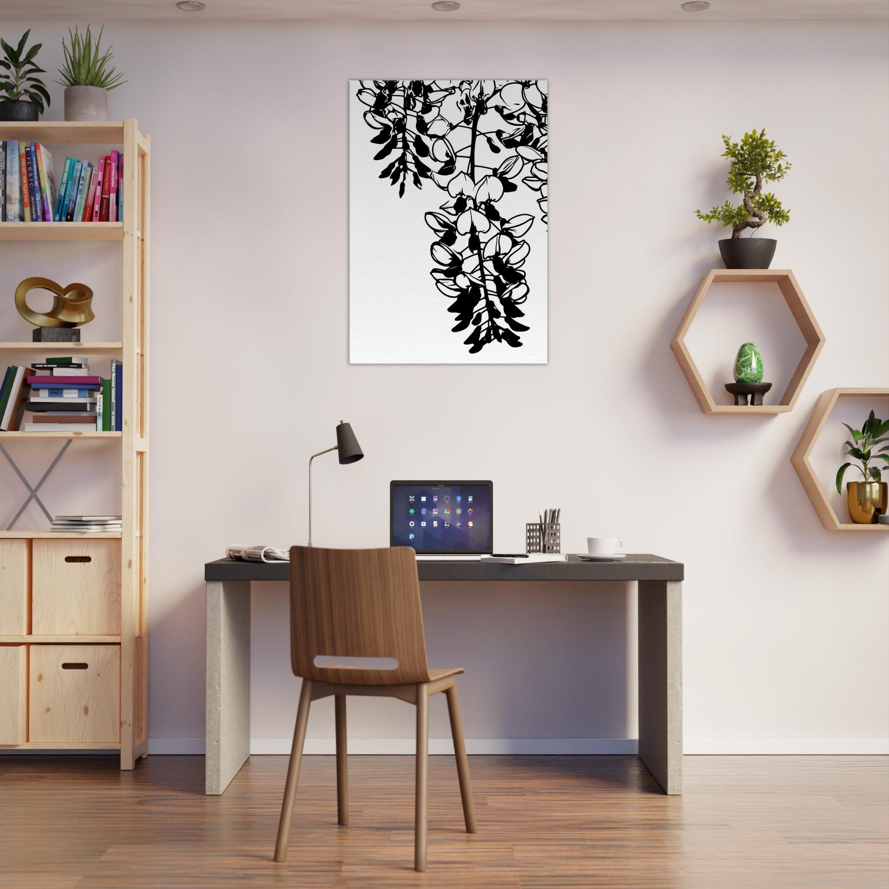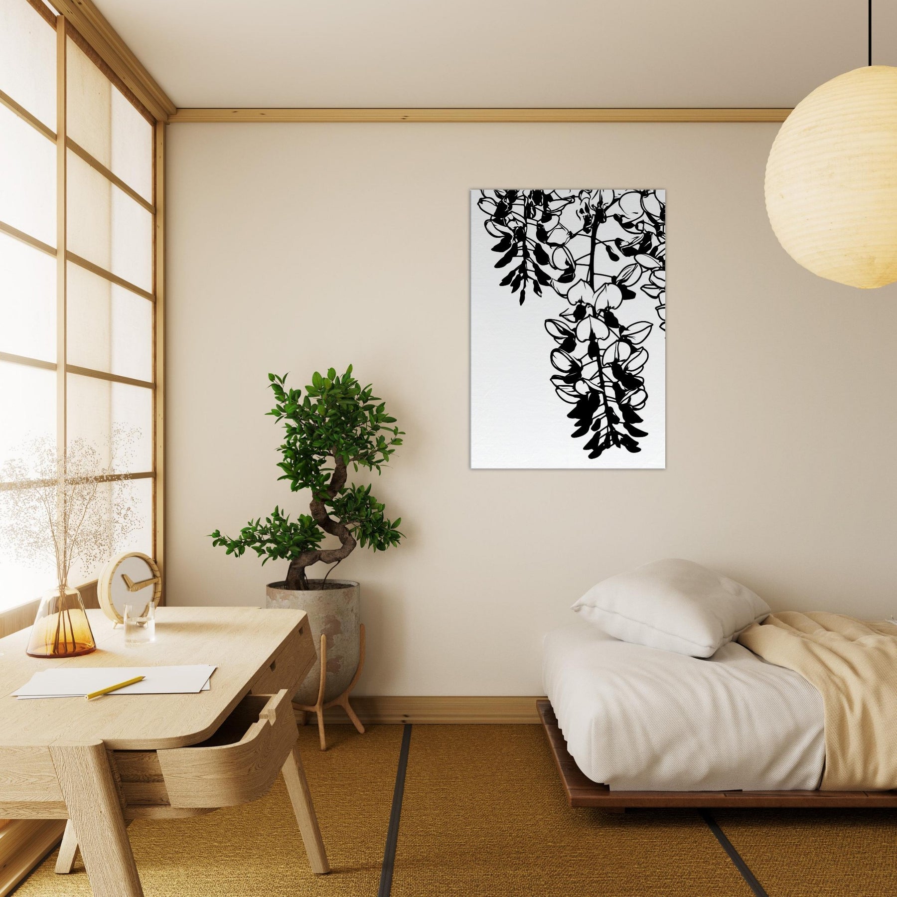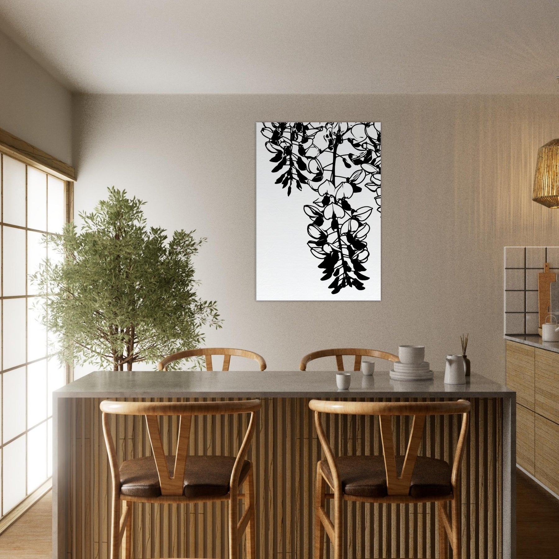 An uncluttered chorus of vines, this Wisteria line art invites a calm, candlelit mood into any room. The bold black lines trace graceful clusters along clean white space, capturing the plant’s pendulous grace without color or shading, letting light and air flow through your walls. The atmosphere feels serene yet expressive, turning a living space into a quiet garden where evening tea and conversations linger. Hang it where you want a touch of organic elegance and timeless simplicity.