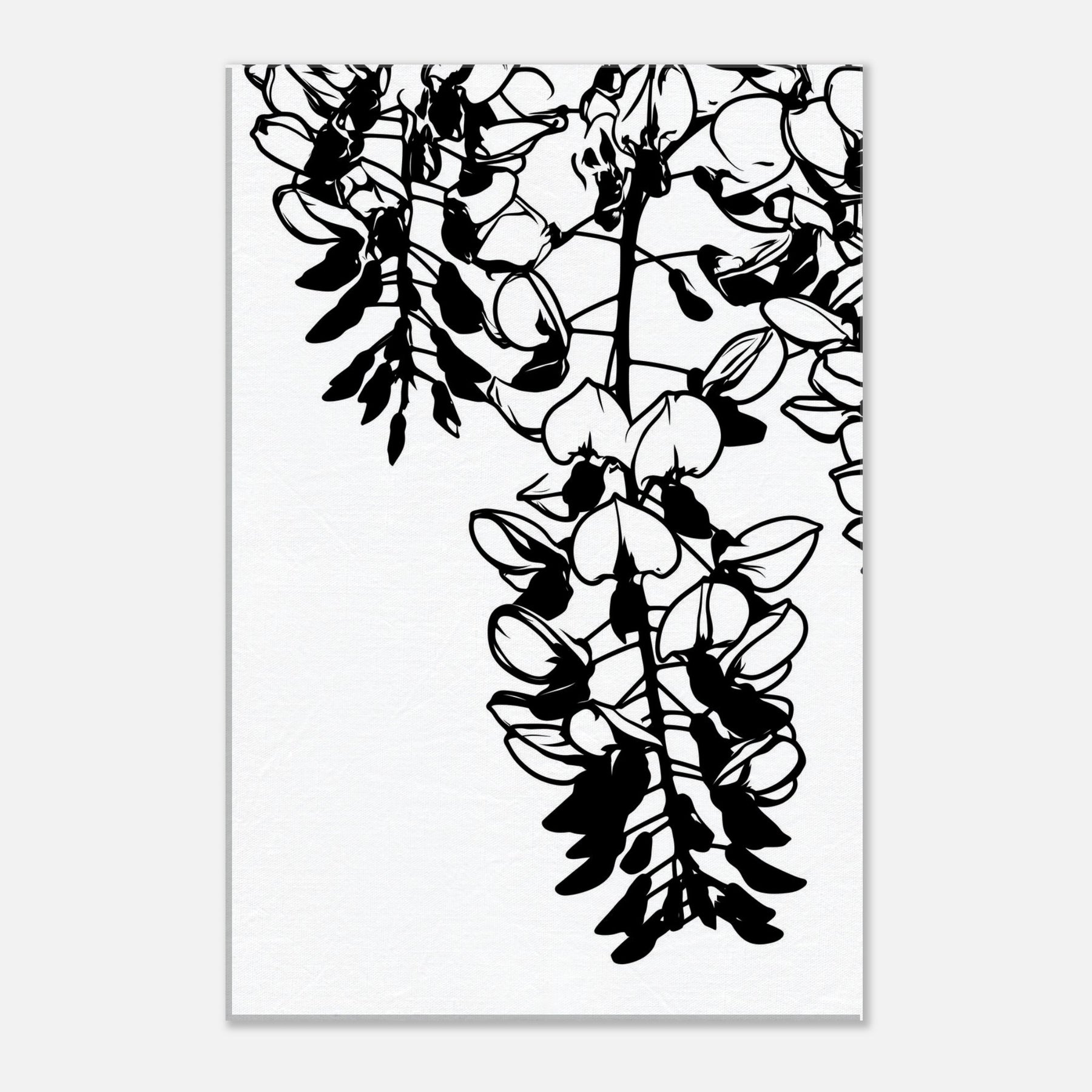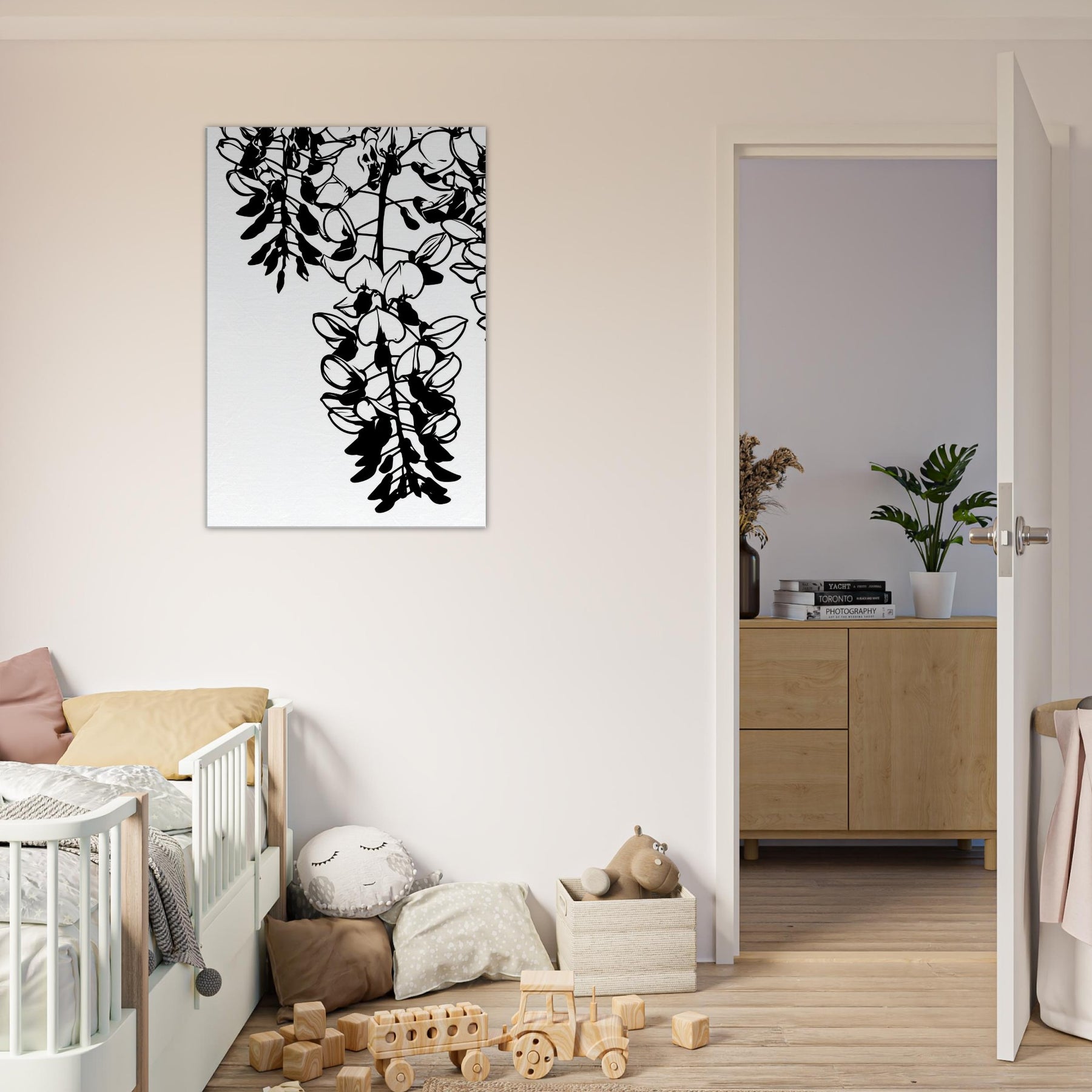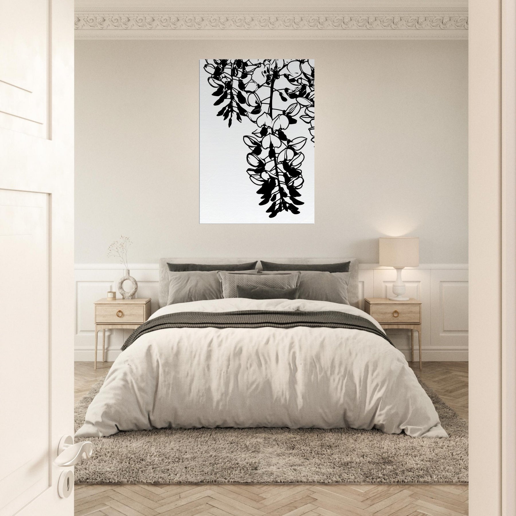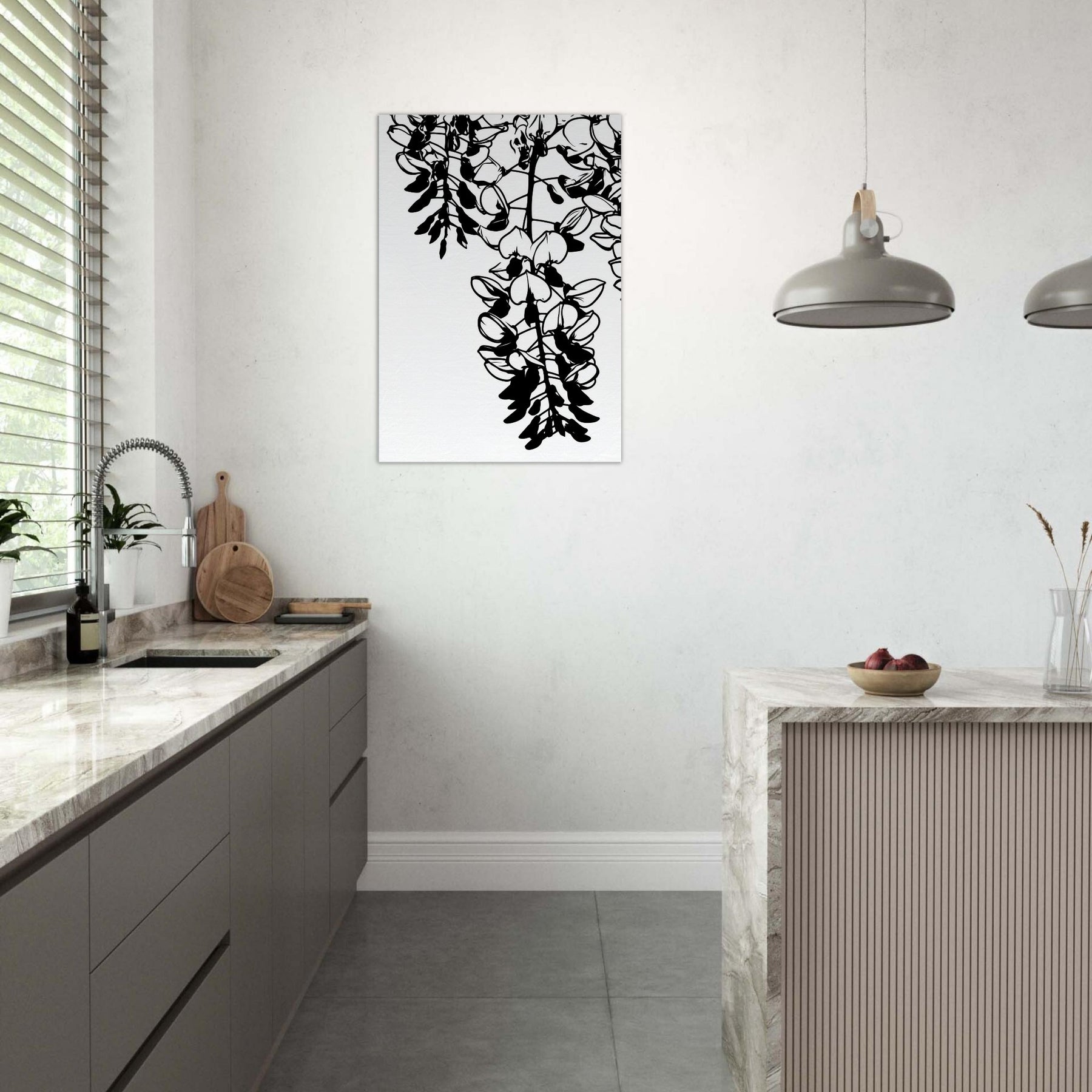 An uncluttered chorus of vines, this Wisteria line art invites a calm, candlelit mood into any room. The bold black lines trace graceful clusters along clean white space, capturing the plant’s pendulous grace without color or shading, letting light and air flow through your walls. The atmosphere feels serene yet expressive, turning a living space into a quiet garden where evening tea and conversations linger. Hang it where you want a touch of organic elegance and timeless simplicity.