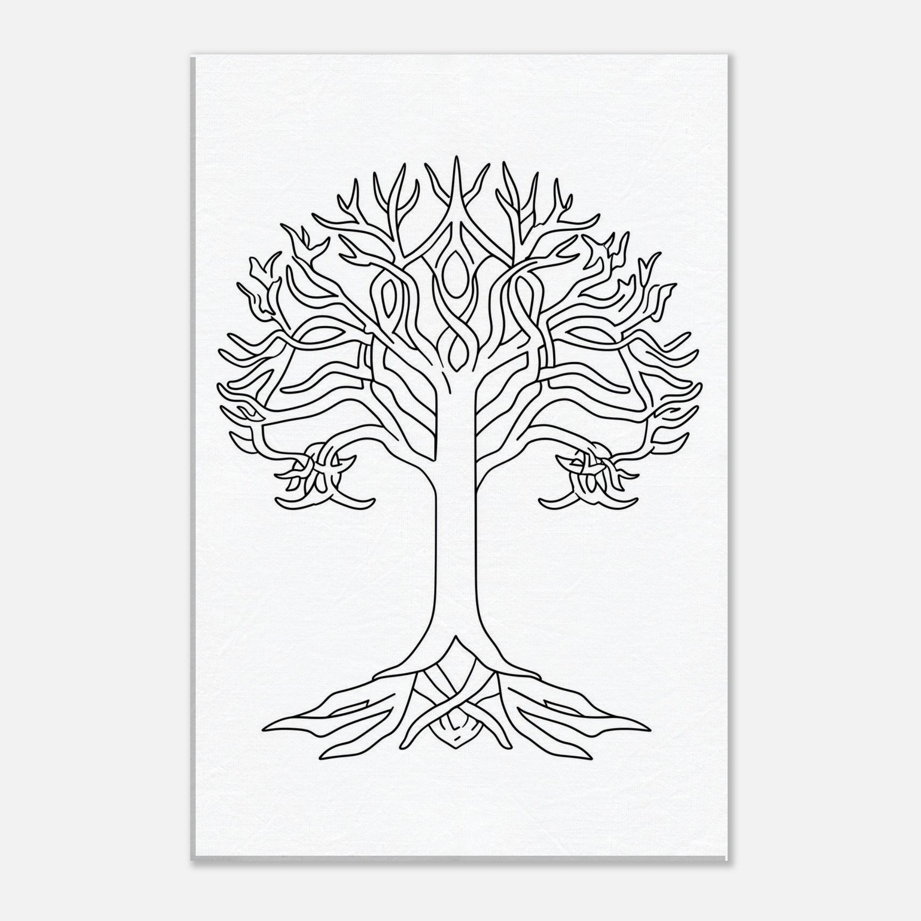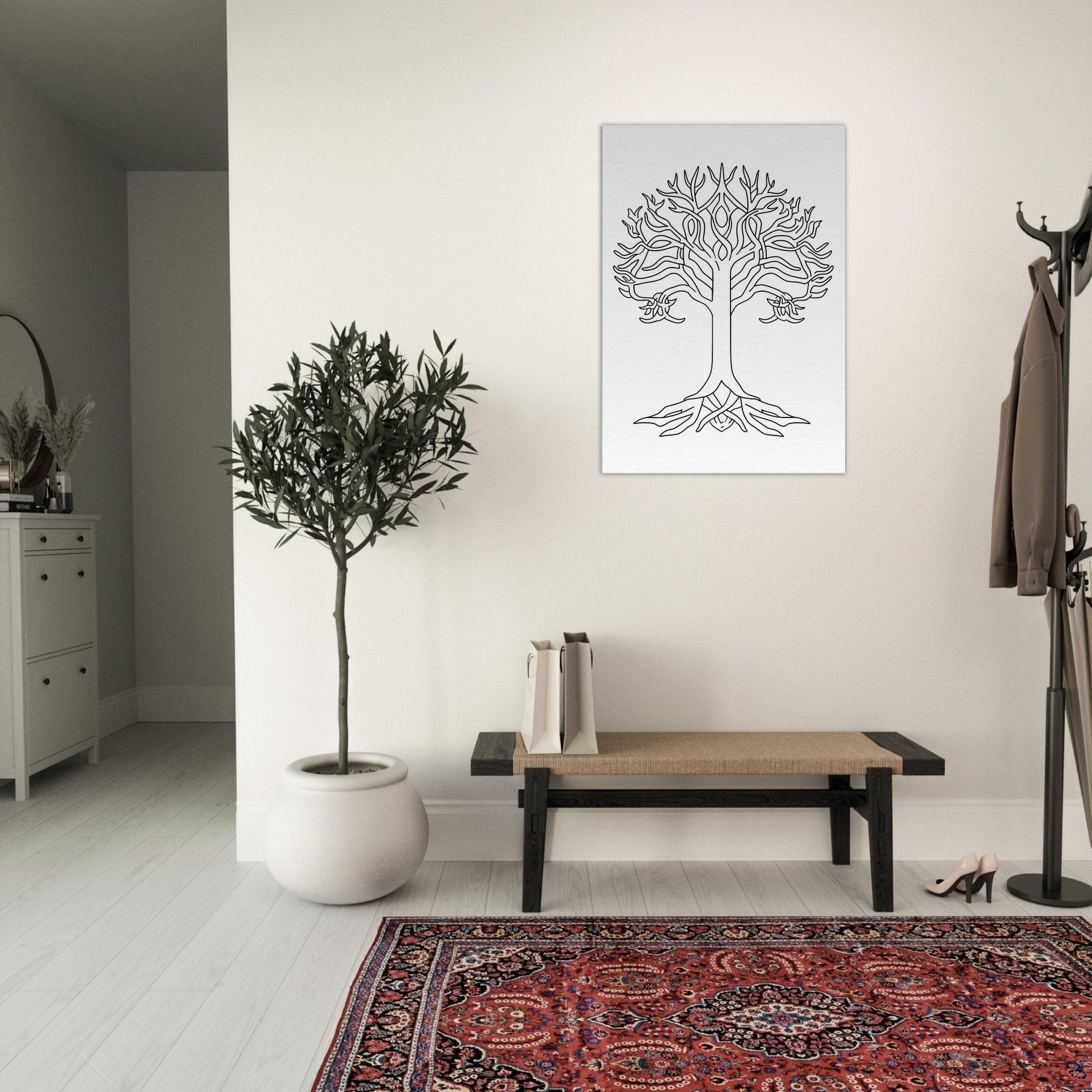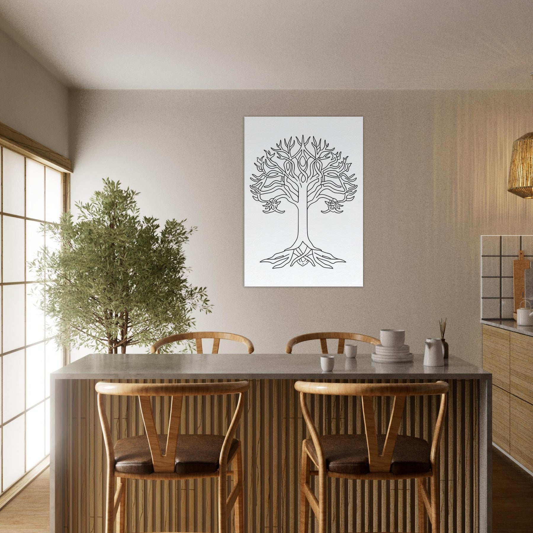 Yggdrasil rises in elegant line, a mystical World Tree sketched in unbroken grace. This minimalist silhouette invites contemplation, quieting clutter as its branches weave a serene atmosphere. Hang it where light brushes the walls and let the steady rhythm of the lines anchor the room with calm, focus, and wonder. In any living space, this artwork becomes a timeless conduit between earth and myth, grounding everyday rituals with a touch of sacred quiet. The central subject is Yggdrasil (World Tree).