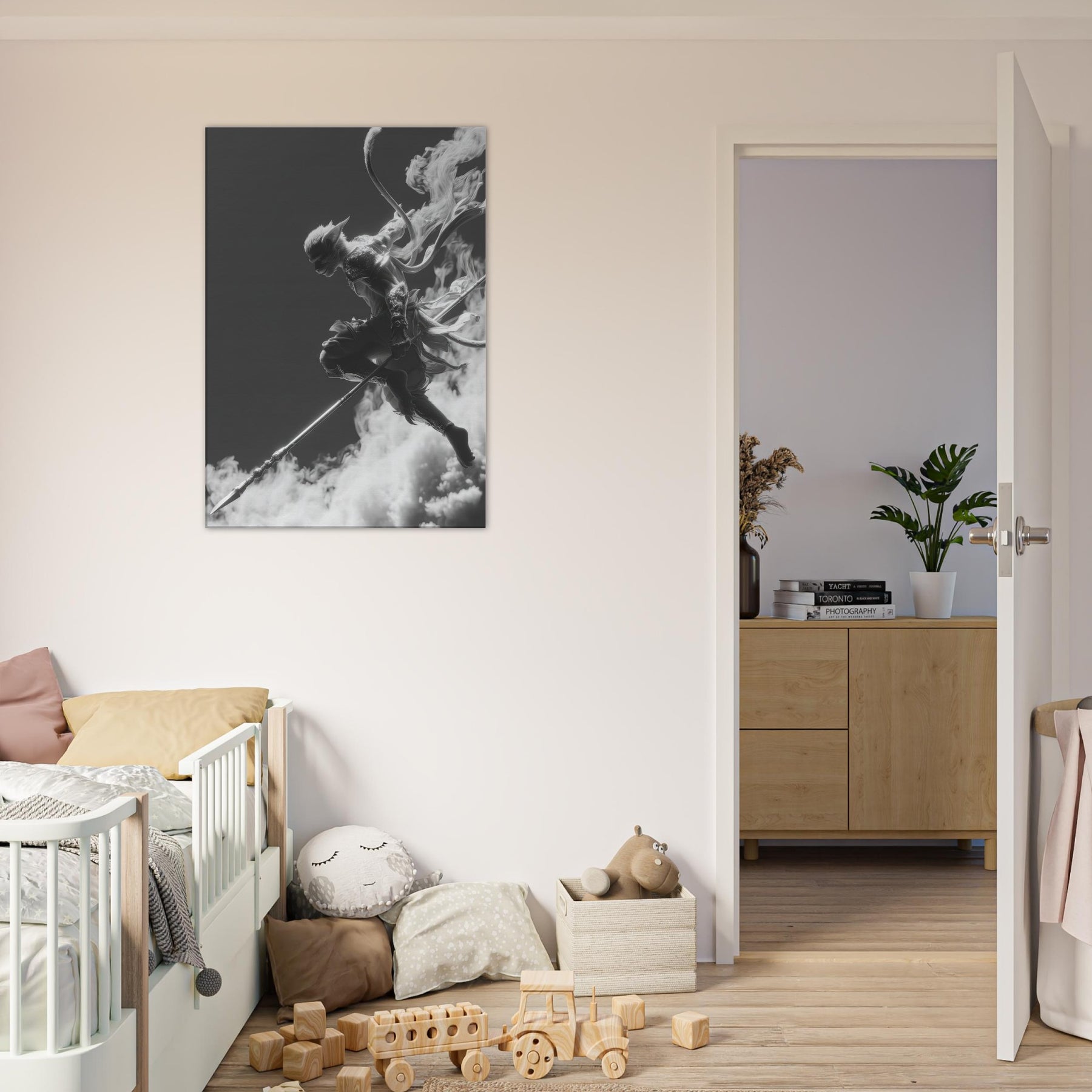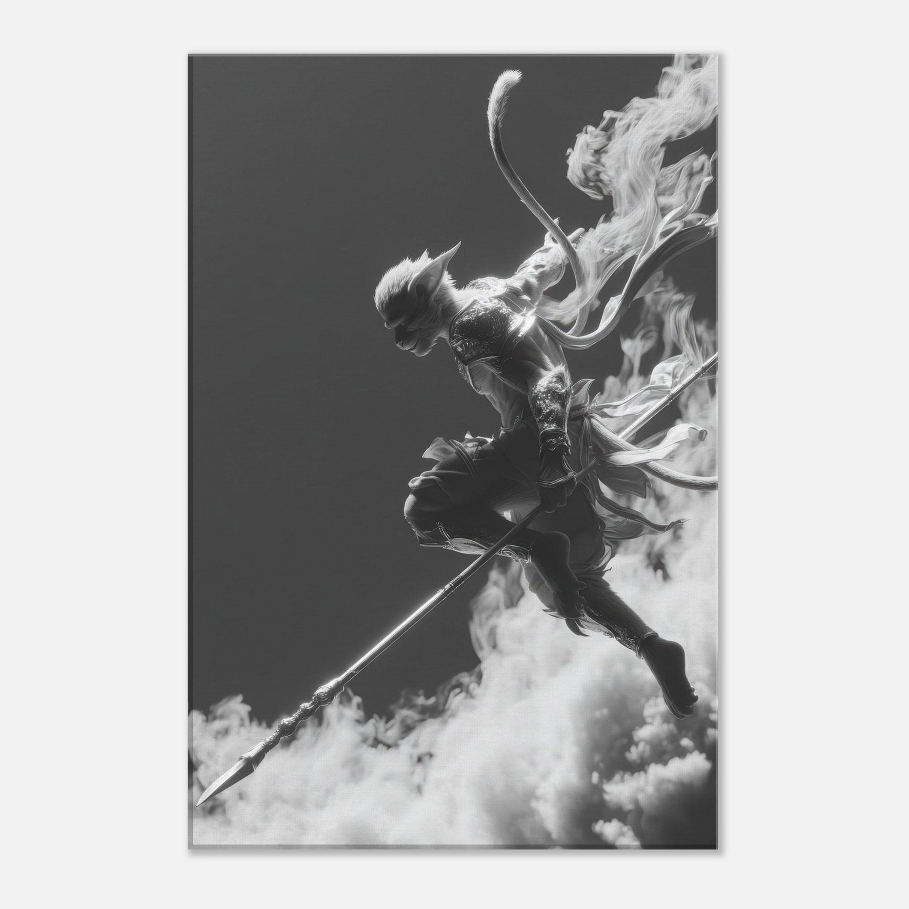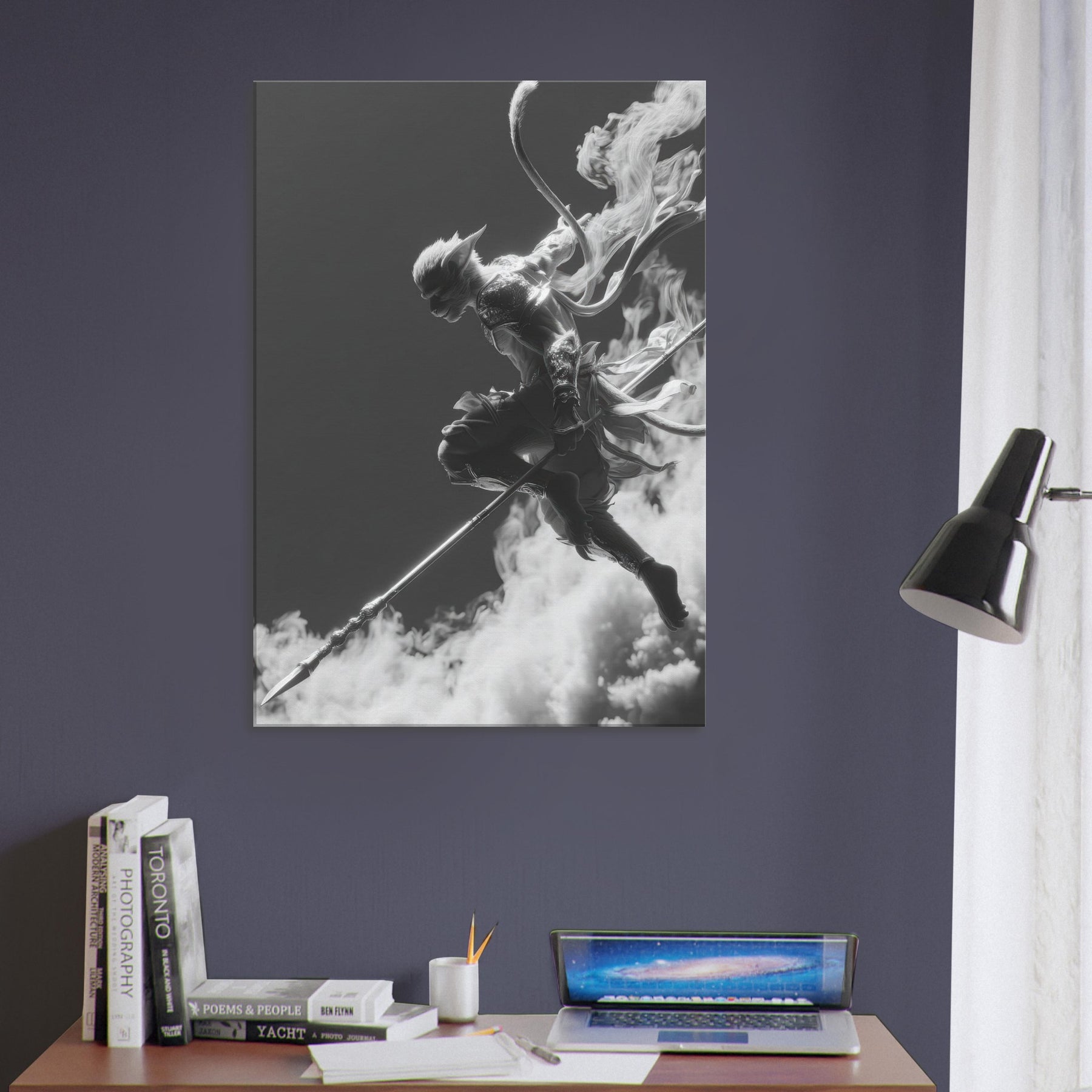 Wukong Ascendant captures the Monkey King's poised menace as he threads the sky with his golden staff, a figure carved in stark black and white against the cloud lit void. The composition halos him in motion, each line a breath of wind, every shadow a whispered legend. This piece turns a living room into a sanctuary of myth, inviting slow contemplation and bold drama perfect over a sofa or desk where imagination can take flight and the room breathes with ancient strength.