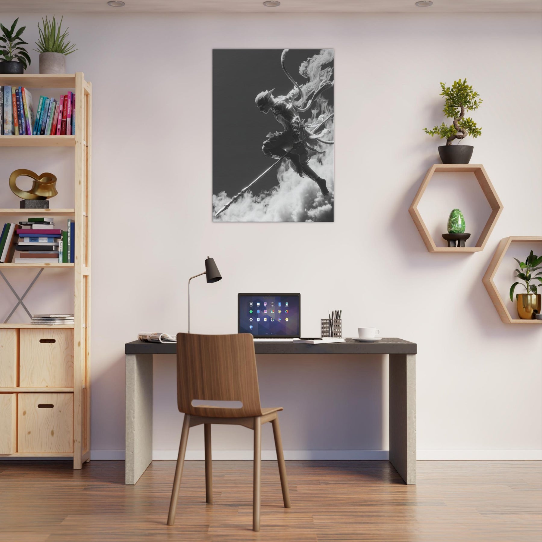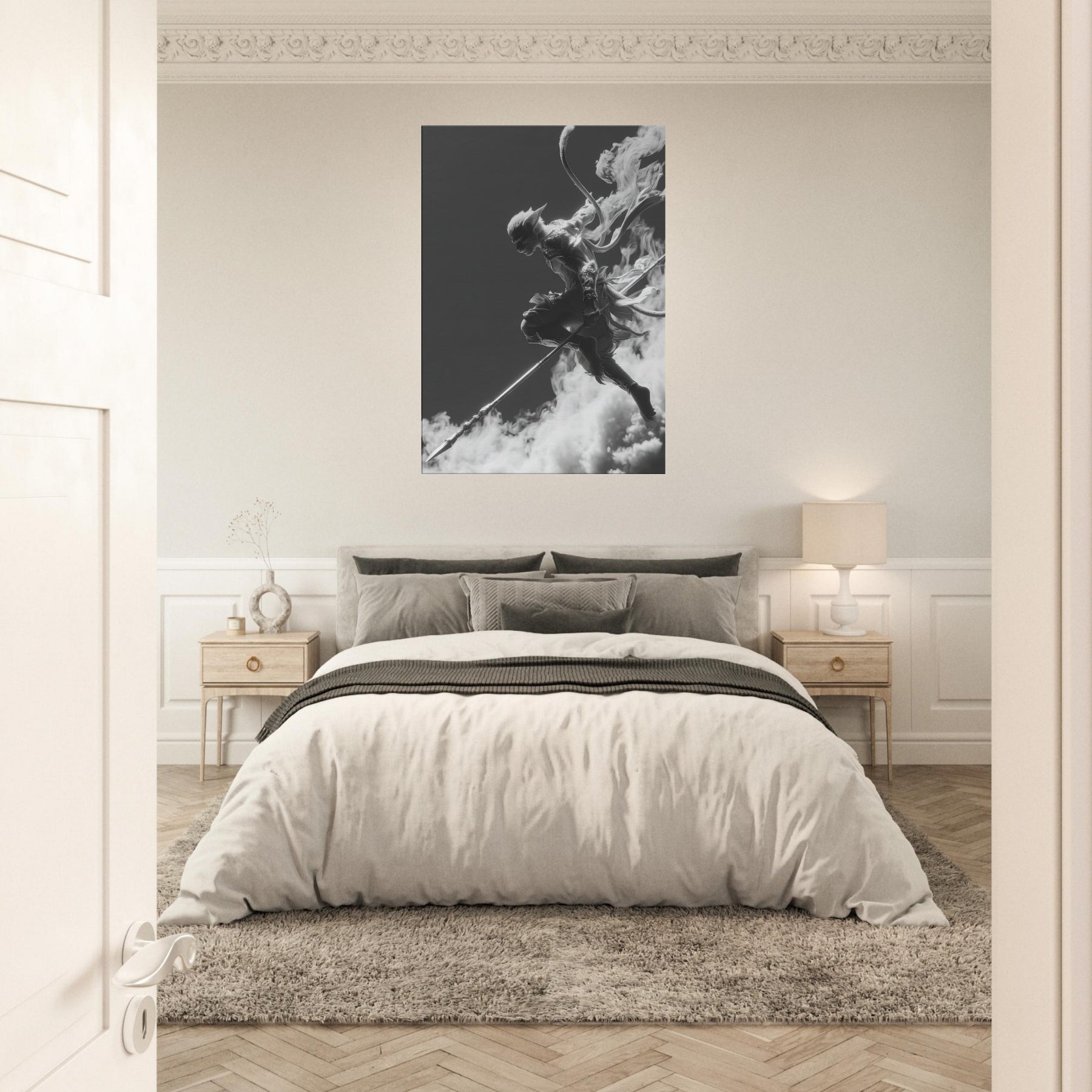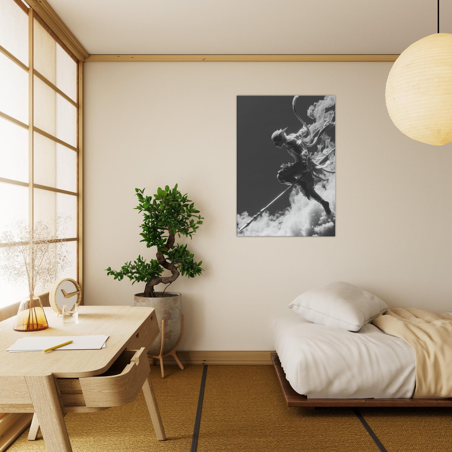Wukong Ascendant captures the Monkey King's poised menace as he threads the sky with his golden staff, a figure carved in stark black and white against the cloud lit void. The composition halos him in motion, each line a breath of wind, every shadow a whispered legend. This piece turns a living room into a sanctuary of myth, inviting slow contemplation and bold drama perfect over a sofa or desk where imagination can take flight and the room breathes with ancient strength.