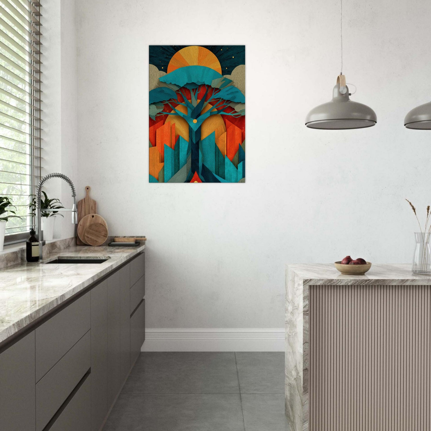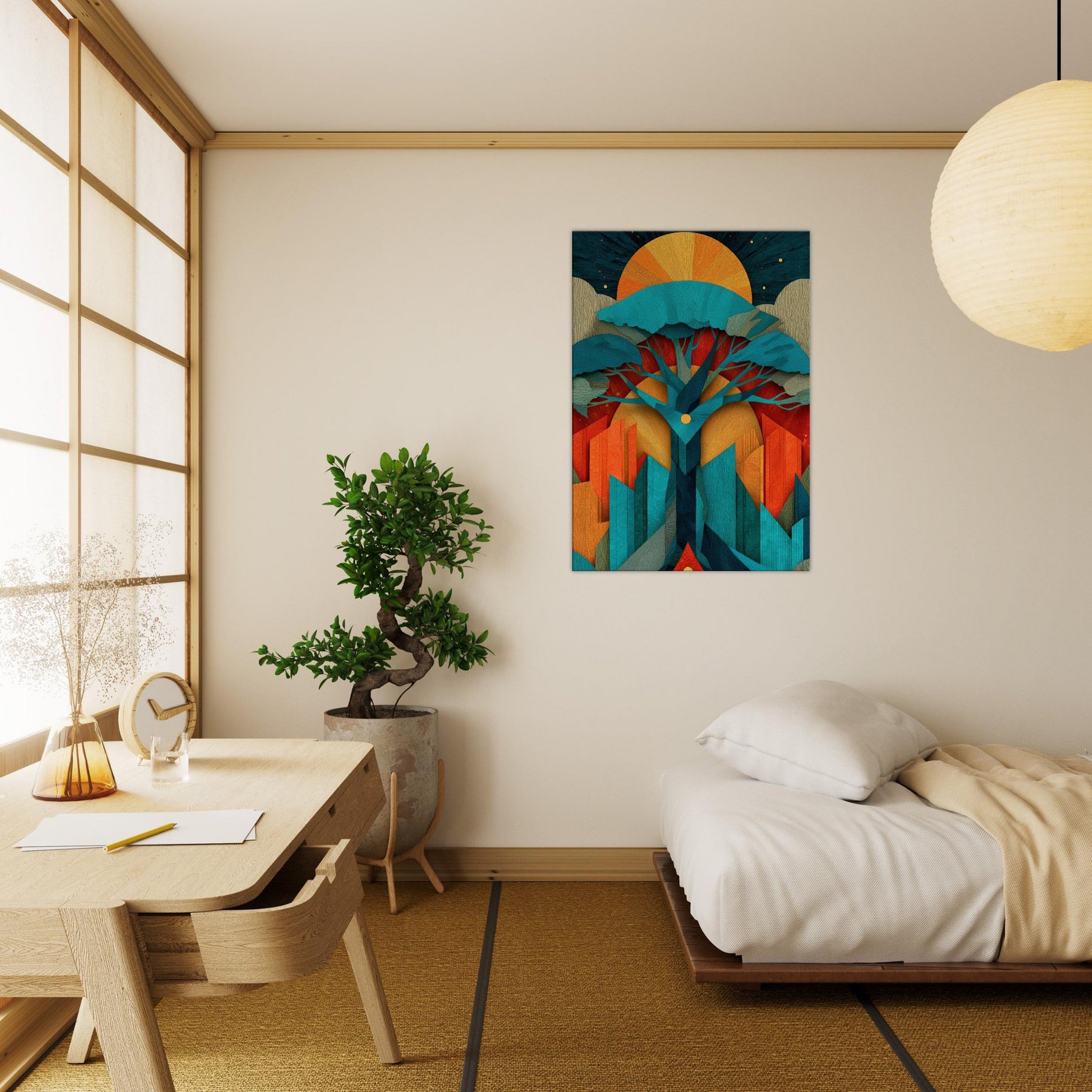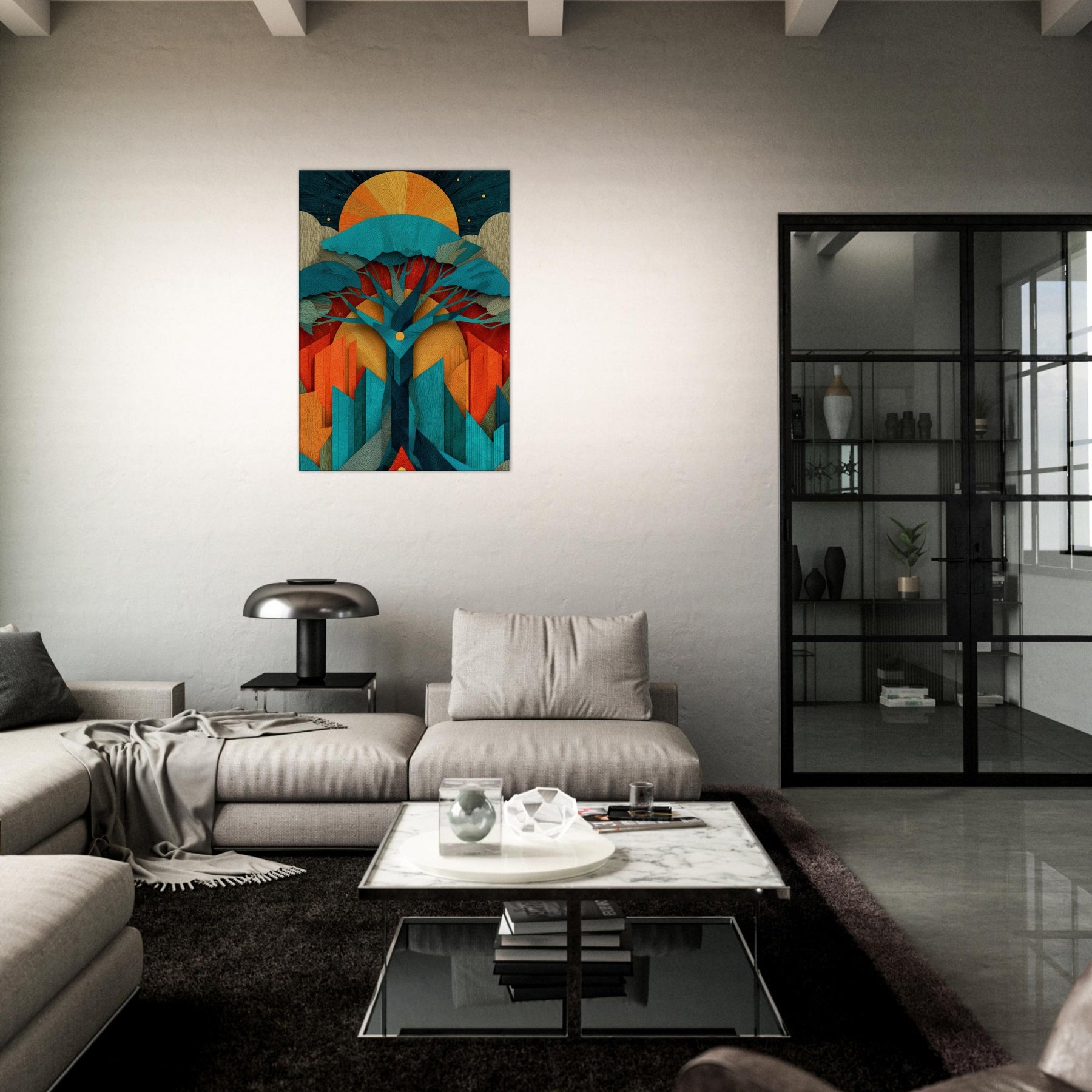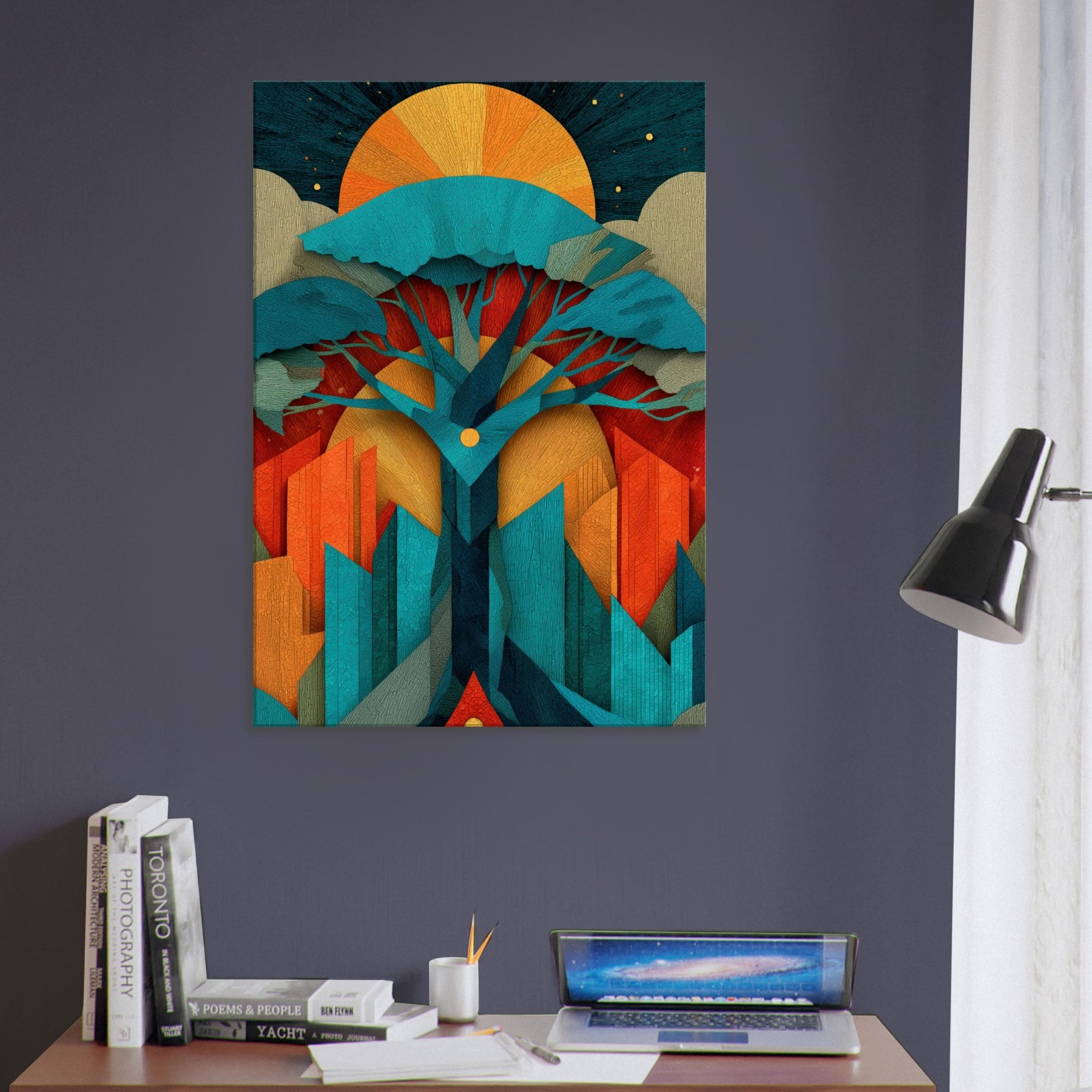 Yggdrasil Dawn invites the eye to linger where roots vanish into light and branches cradle a living room in color. This abstract interpretation of Yggdrasil, the World Tree, unfurls like a musical skyline, weaving teal canopies with sunlit embers and cathedral sharp silhouettes. The air fills with warmth and quiet courage, a sanctuary for contemplation and conversation. Hang it where you gather: above a sofa or a dining nook, and let the tree's rhythm steady every moment of daily life. The central subject is Yggdrasil (World Tree).