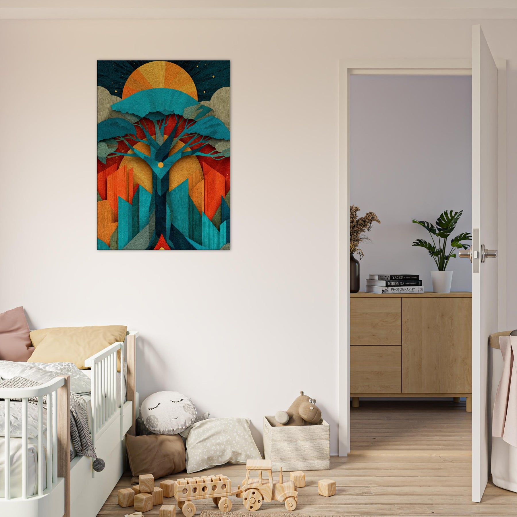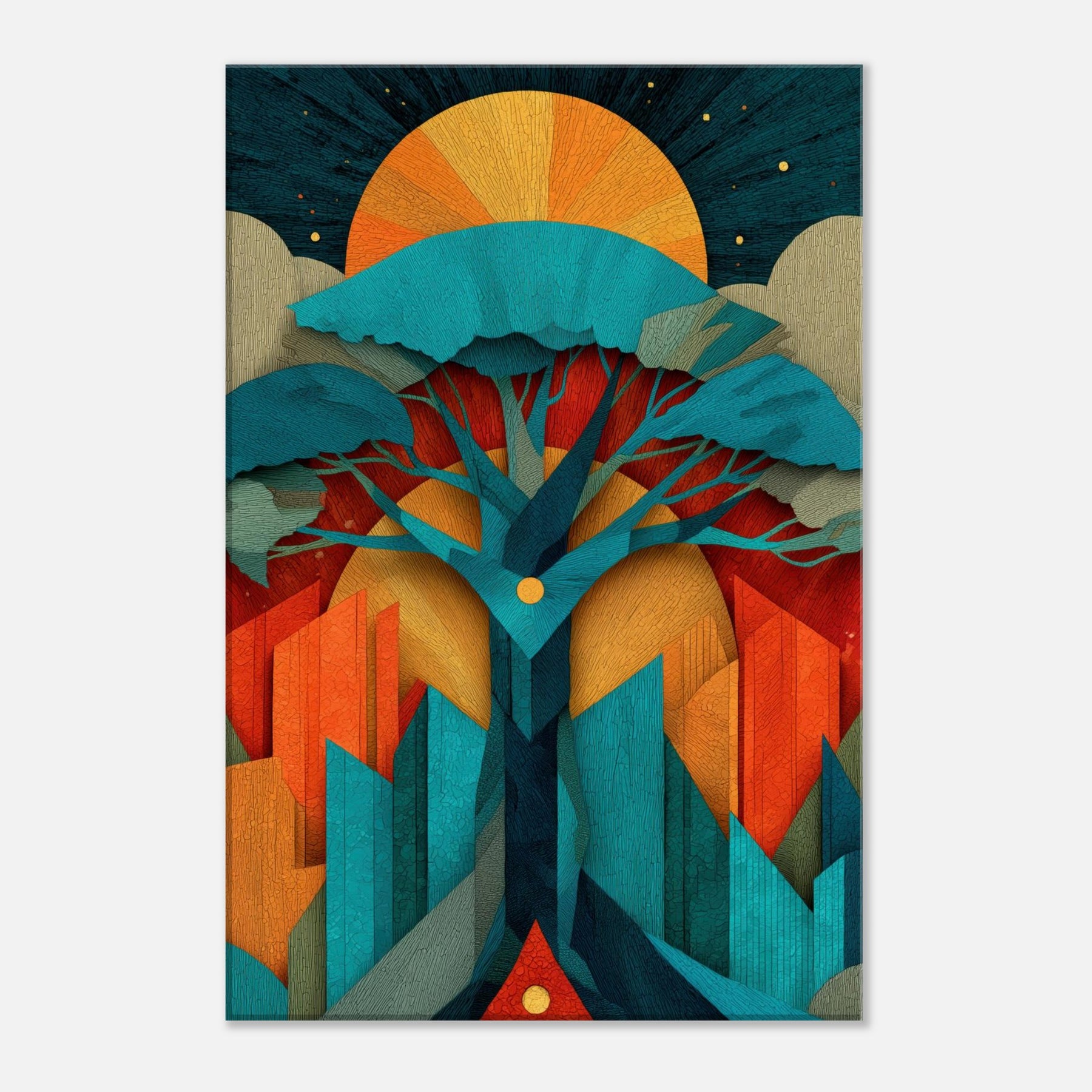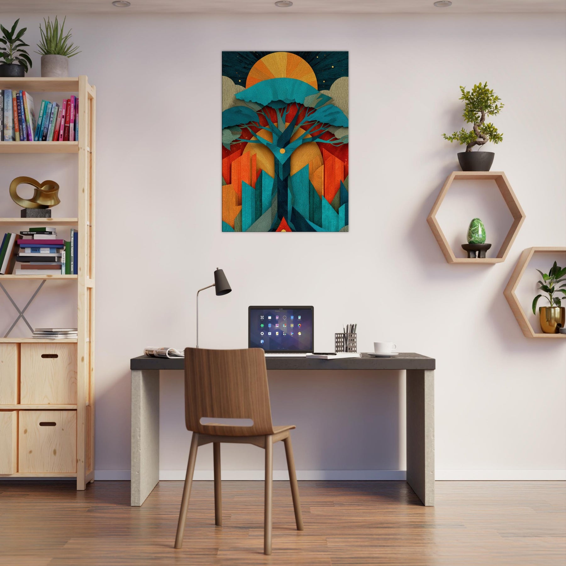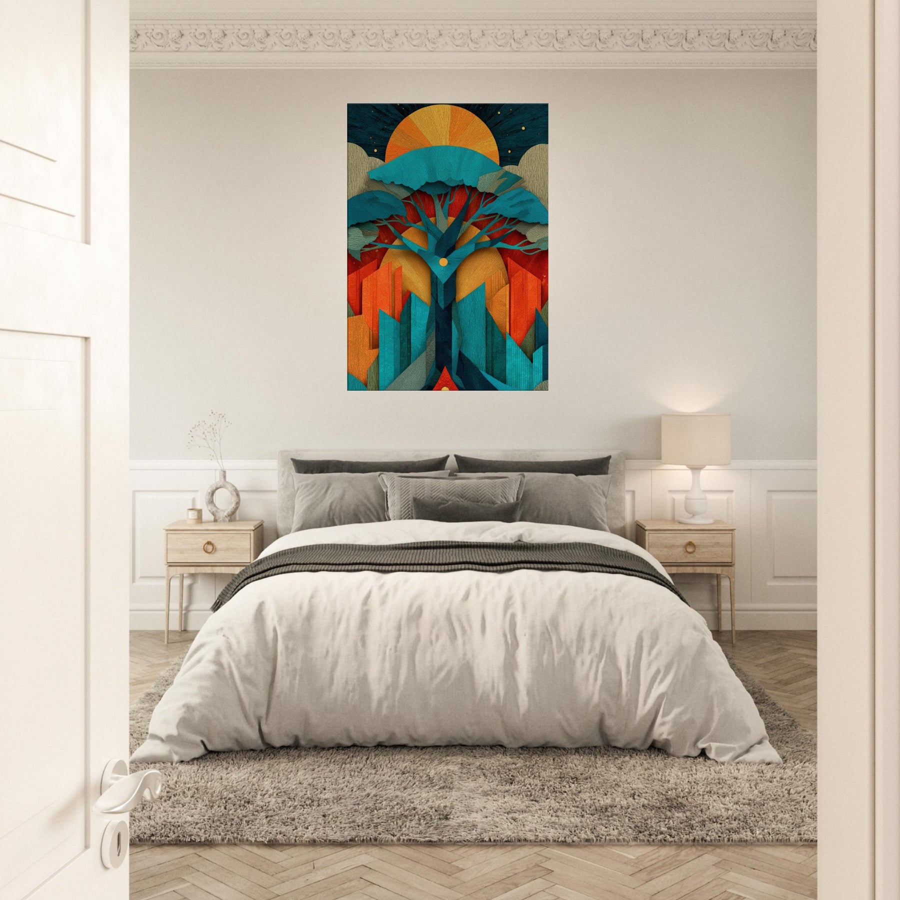Yggdrasil Dawn invites the eye to linger where roots vanish into light and branches cradle a living room in color. This abstract interpretation of Yggdrasil, the World Tree, unfurls like a musical skyline, weaving teal canopies with sunlit embers and cathedral sharp silhouettes. The air fills with warmth and quiet courage, a sanctuary for contemplation and conversation. Hang it where you gather: above a sofa or a dining nook, and let the tree's rhythm steady every moment of daily life. The central subject is Yggdrasil (World Tree).