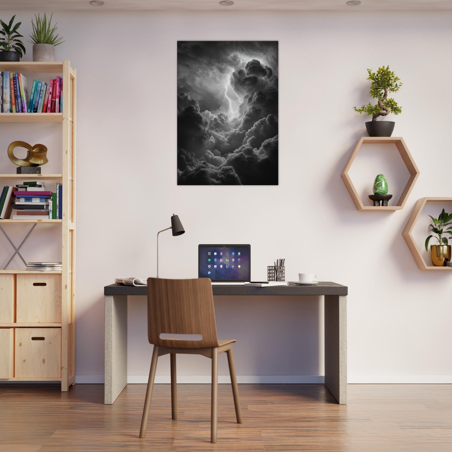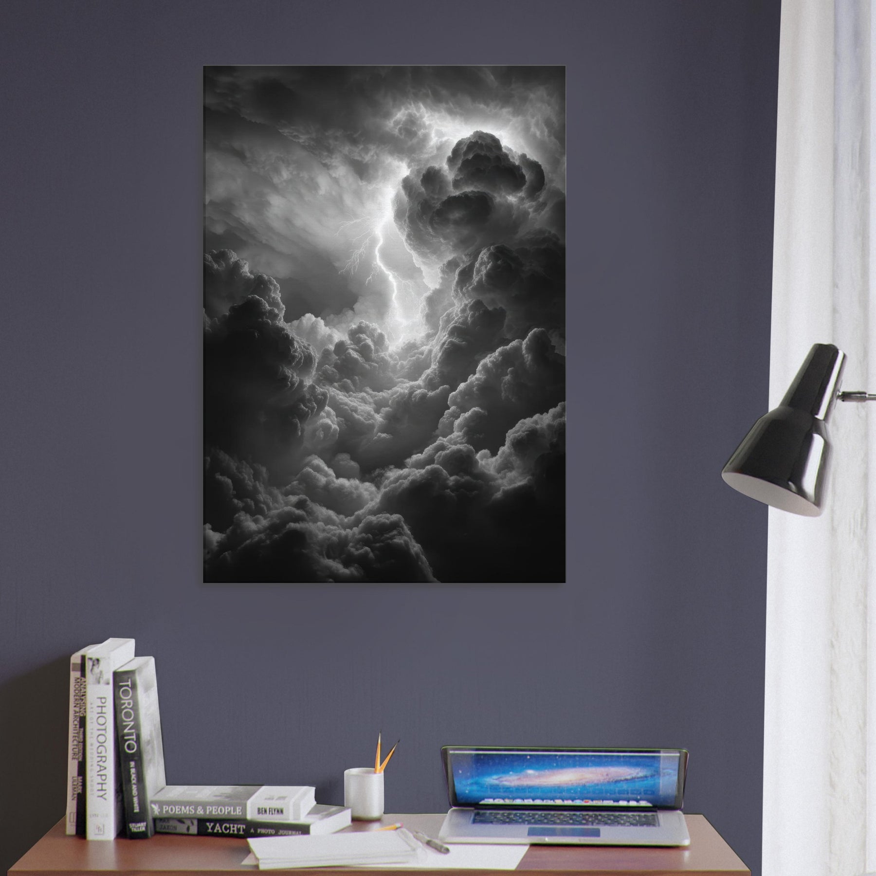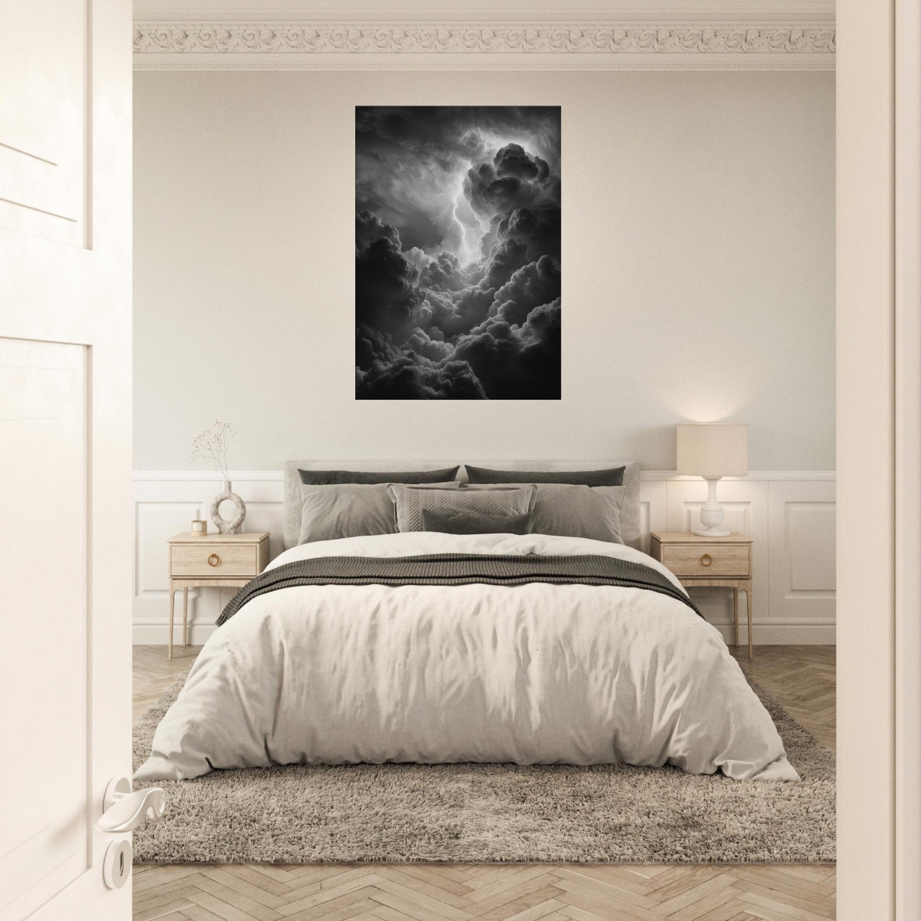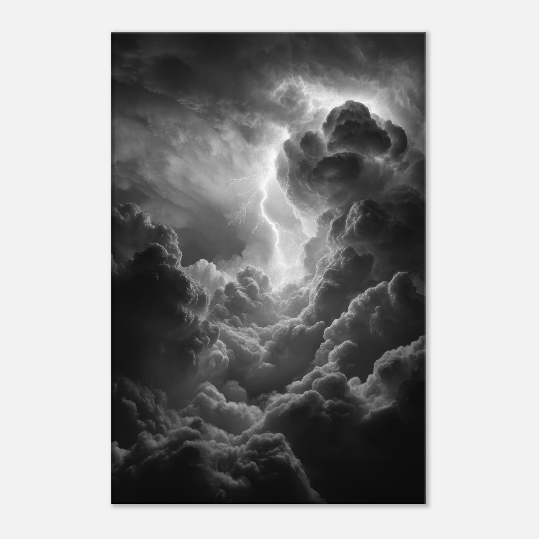 The monochrome palette heightens the drama, inviting shadows to drift across walls and lend the room mythic gravity. Hang it beside a sofa or above a mantel to awaken conversation with epic energy; a sensory echo of rain, breath, and the crack of lightning that makes evenings feel legendary. The central subject is Zeus, god of thunder and sky.