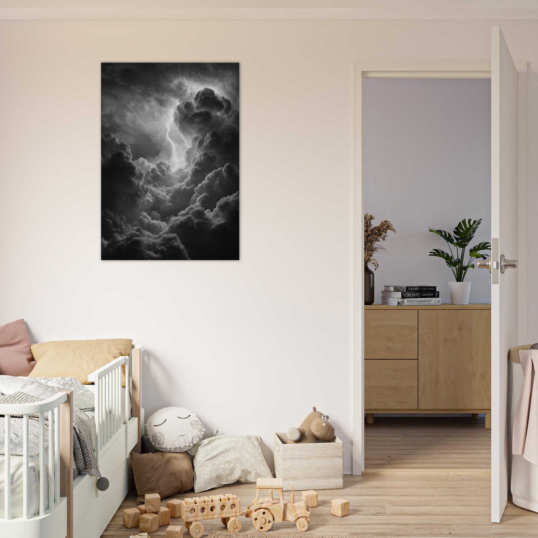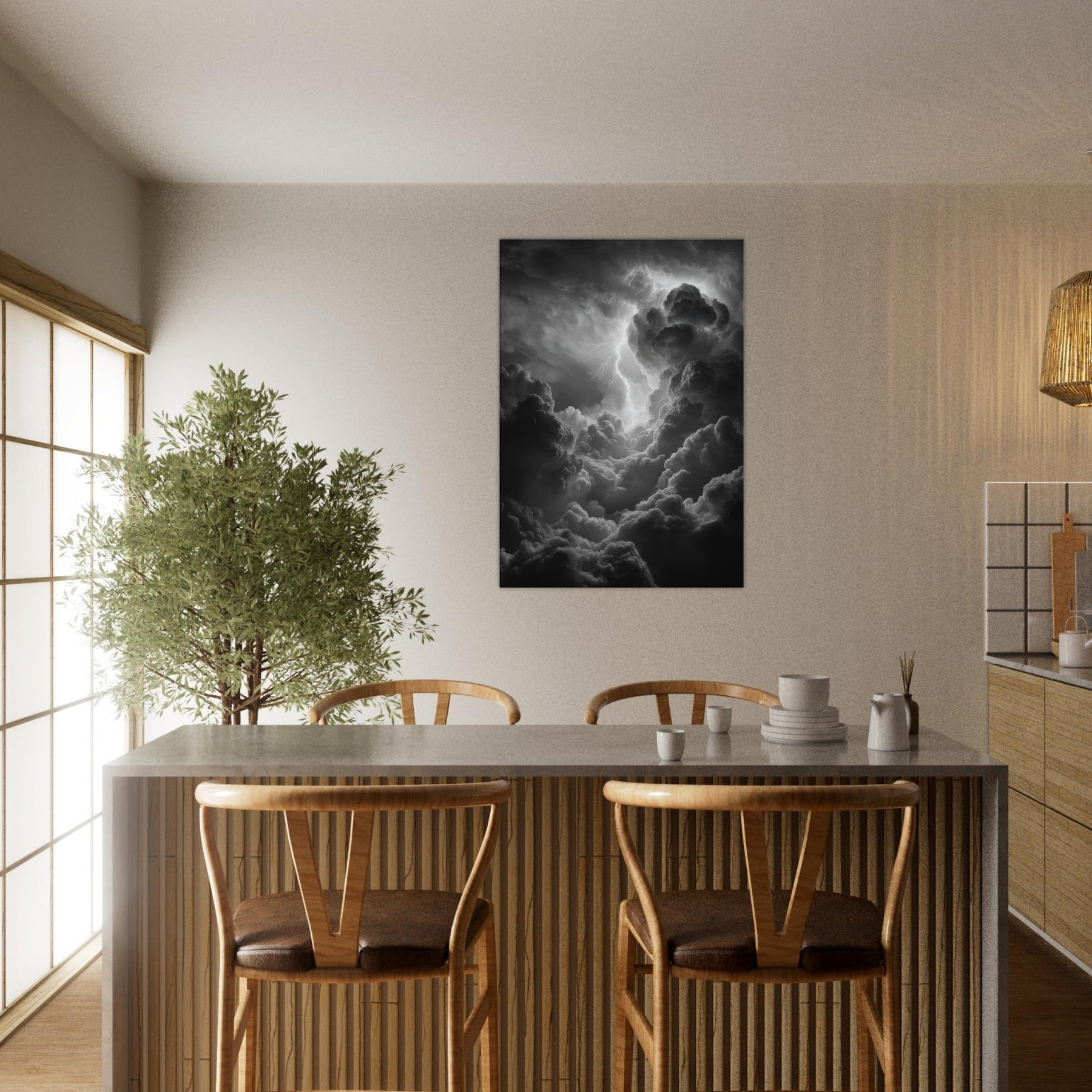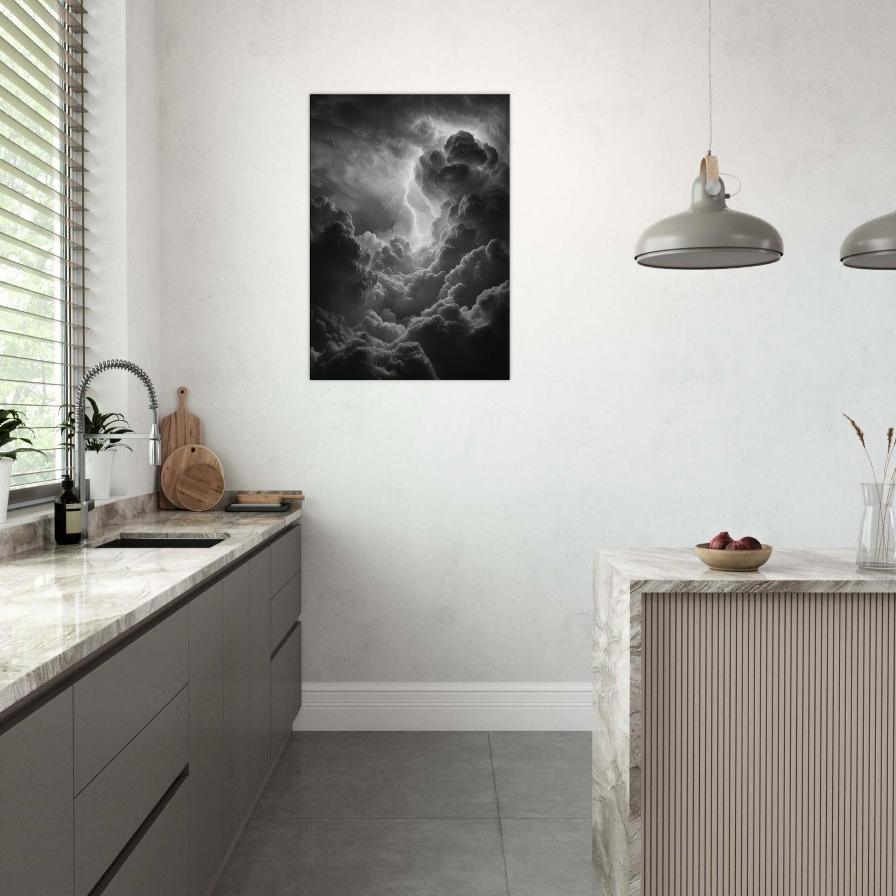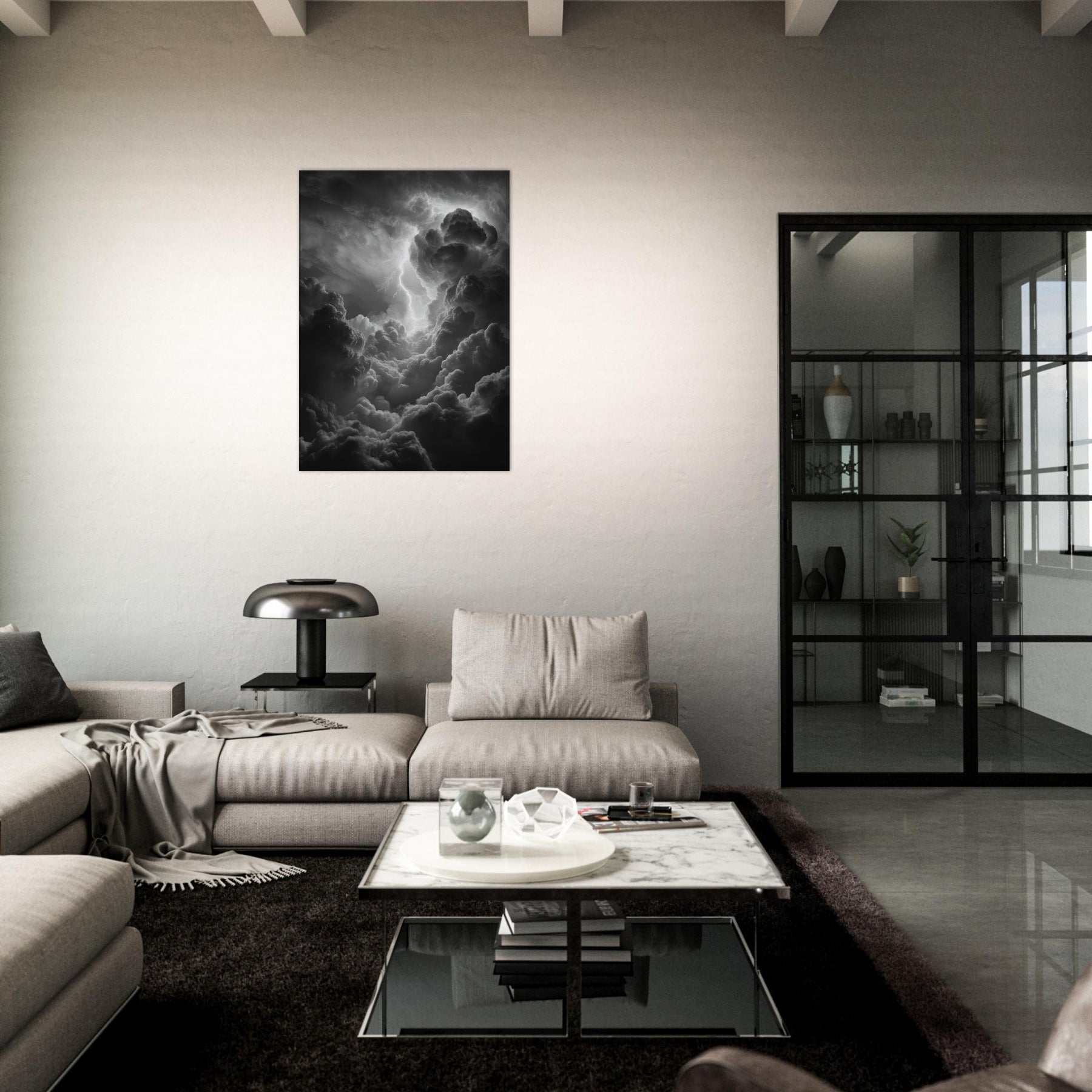 The monochrome palette heightens the drama, inviting shadows to drift across walls and lend the room mythic gravity. Hang it beside a sofa or above a mantel to awaken conversation with epic energy; a sensory echo of rain, breath, and the crack of lightning that makes evenings feel legendary. The central subject is Zeus, god of thunder and sky.